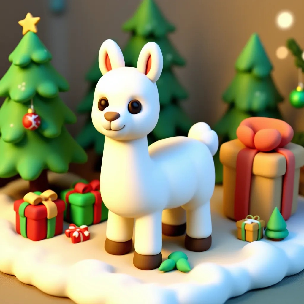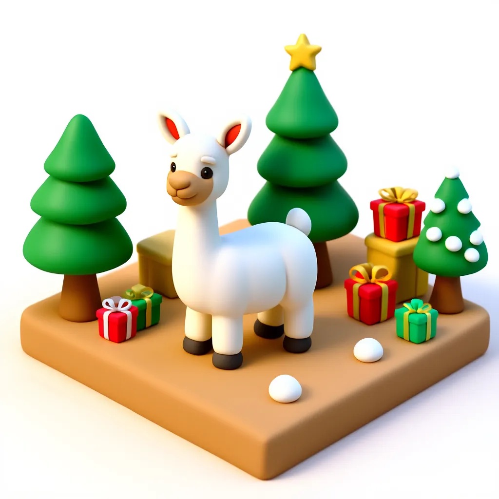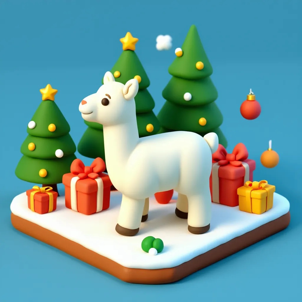 A 2.5D isometric Christmas scene in a clay style. A cute white llama is the main character, with smooth clay material and simple rounded shapes. Christmas decorations around it: a Christmas tree, gift boxes, ornaments, and light snow. Soft lighting, warm and cozy mood.Clean composition, minimal background. C4D, simple shapes, non-realistic, high quality render.