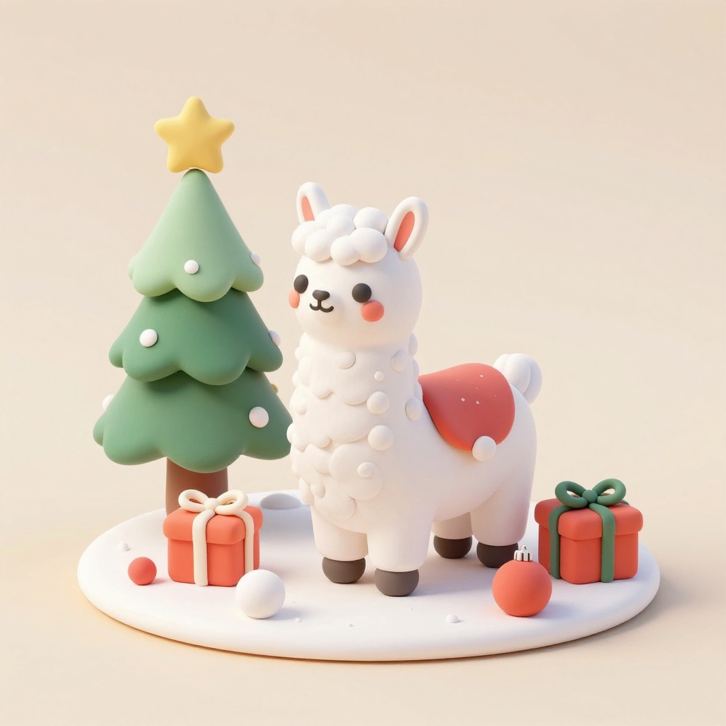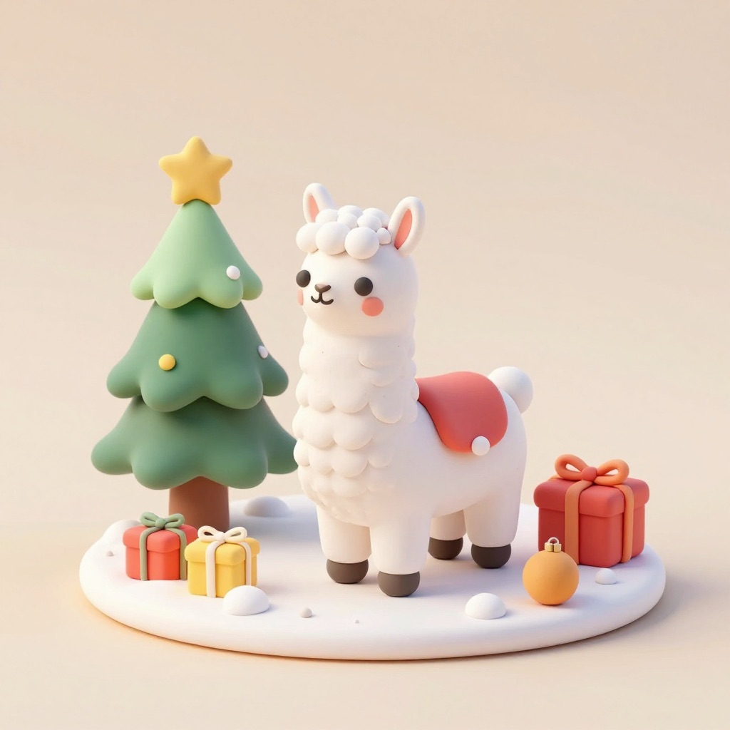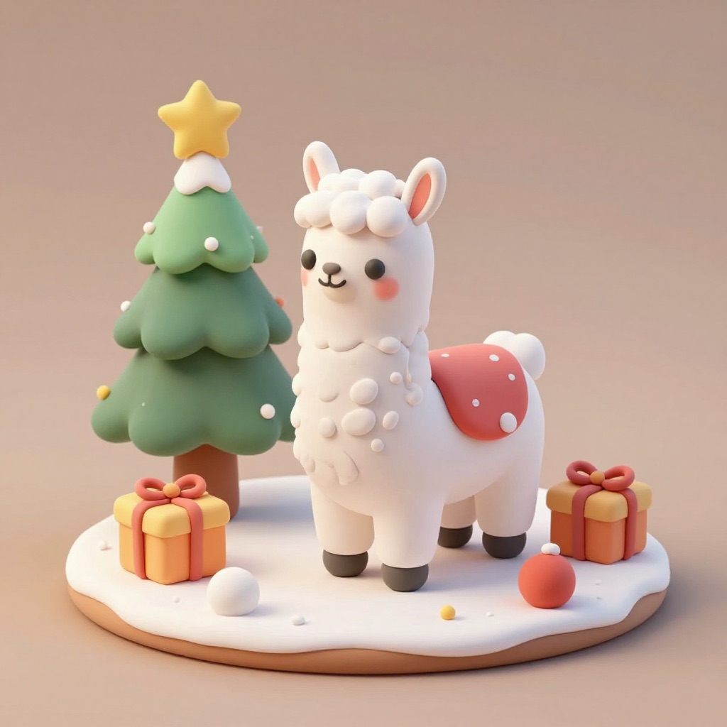 A 2.5D isometric Christmas scene in a clay style. A cute white llama is the main character, with smooth clay material and simple rounded shapes. Christmas decorations around it: a Christmas tree, gift boxes, ornaments, and light snow. Soft lighting, warm and cozy mood.Clean composition, minimal background. C4D, simple shapes, non-realistic, high quality render.