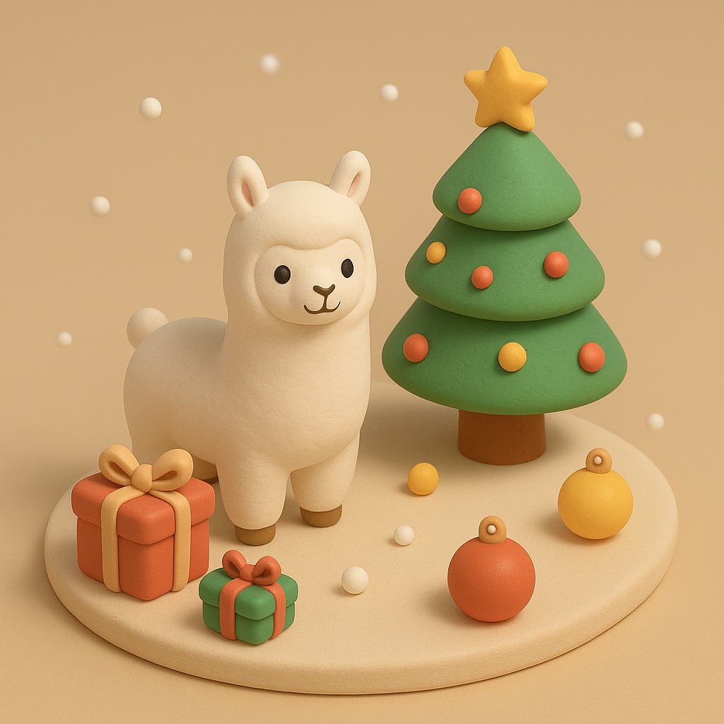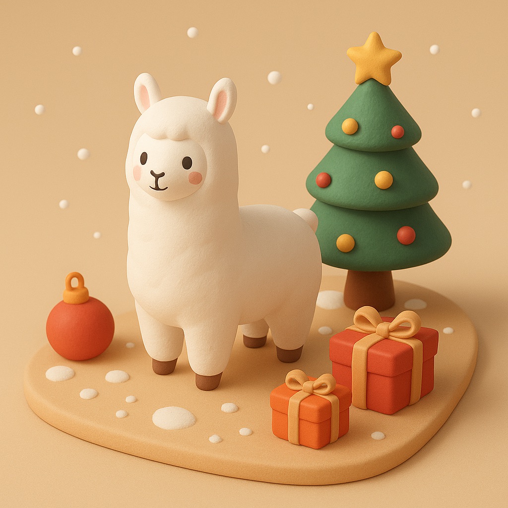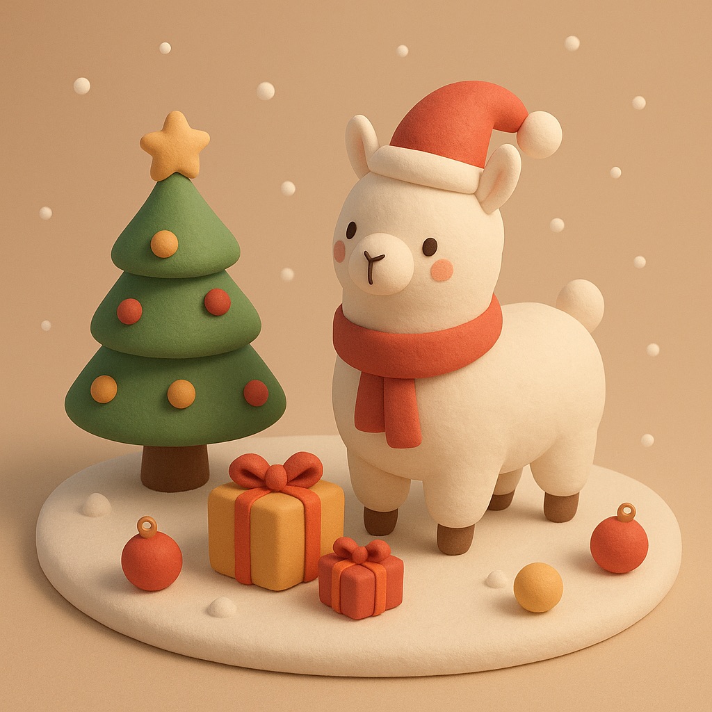 A 2.5D isometric Christmas scene in a clay style. A cute white llama is the main character, with smooth clay material and simple rounded shapes. Christmas decorations around it: a Christmas tree, gift boxes, ornaments, and light snow. Soft lighting, warm and cozy mood.Clean composition, minimal background. C4D, simple shapes, non-realistic, high quality render.