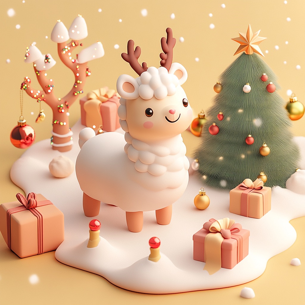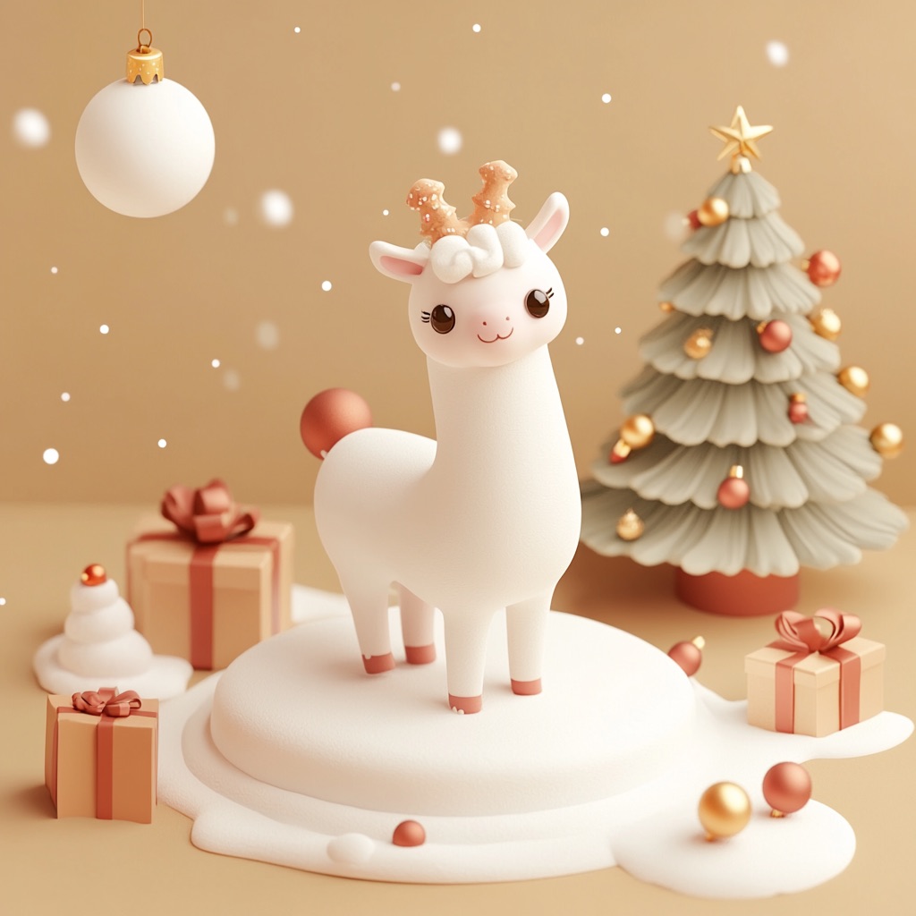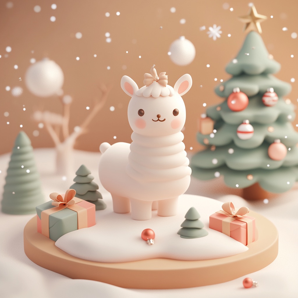A 2.5D isometric Christmas scene in a clay style. A cute white llama is the main character, with smooth clay material and simple rounded shapes. Christmas decorations around it: a Christmas tree, gift boxes, ornaments, and light snow. Soft lighting, warm and cozy mood.Clean composition, minimal background. C4D, simple shapes, non-realistic, high quality render.