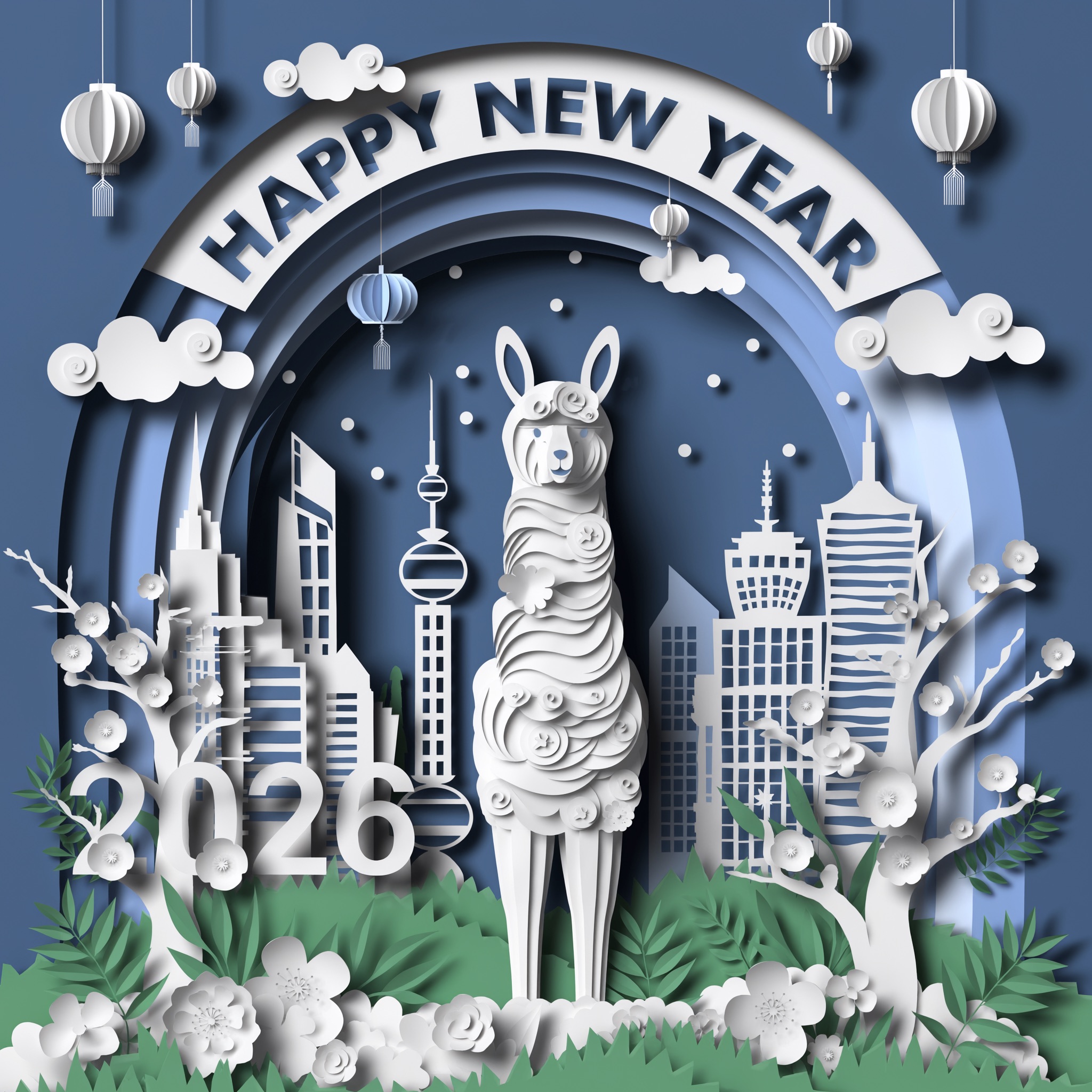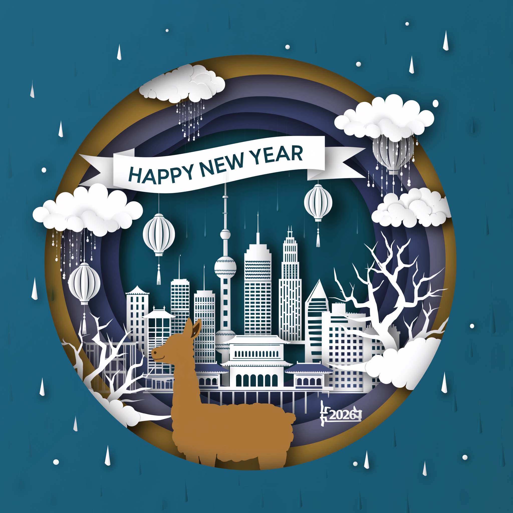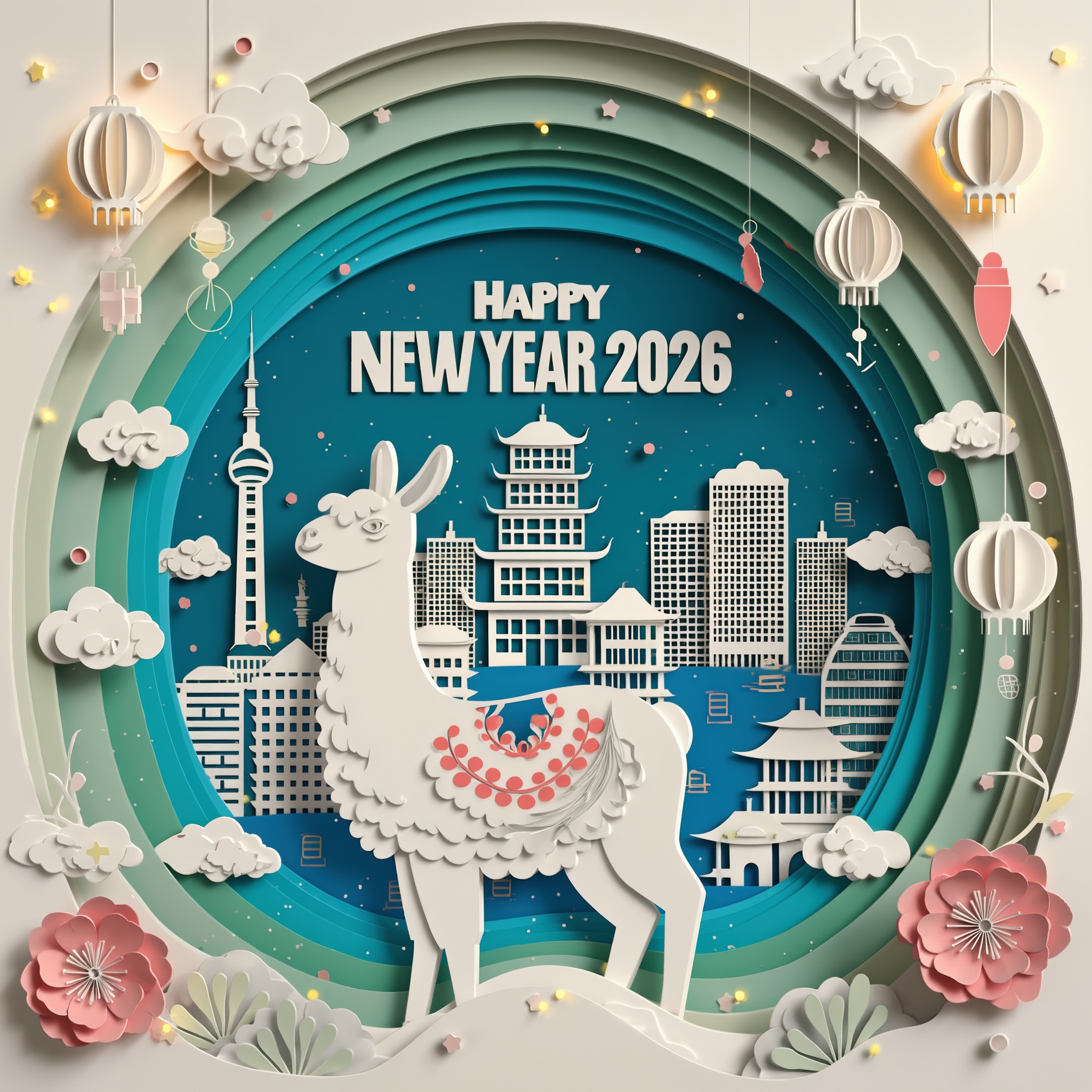 A 3D Chinese paper-cut art illustration , a llama as the hero character in the foreground. From the center, a layered paper-cut cityscape rises, including stylized landmarks such as Shanghai. A paper-cut banner prominently displays ” HAPPY NEW YEAR 2026″. Surrounding elements: paper-cut plum blossoms, spring greenery, light drizzle, white clouds, and subtle festive decorations like tiny paper lanterns or confetti dots.