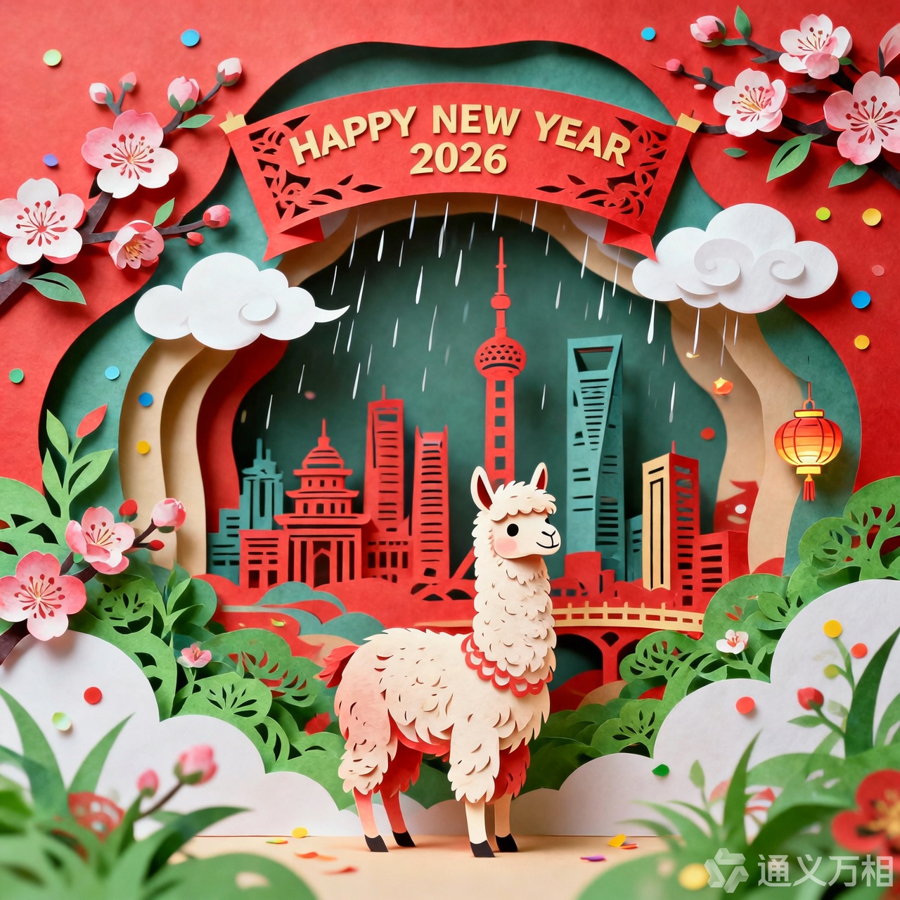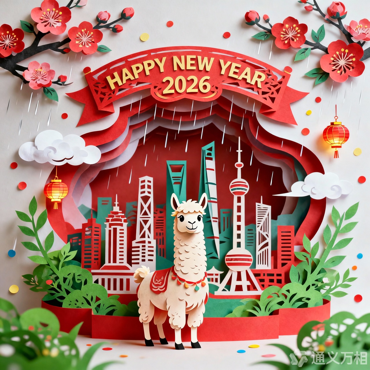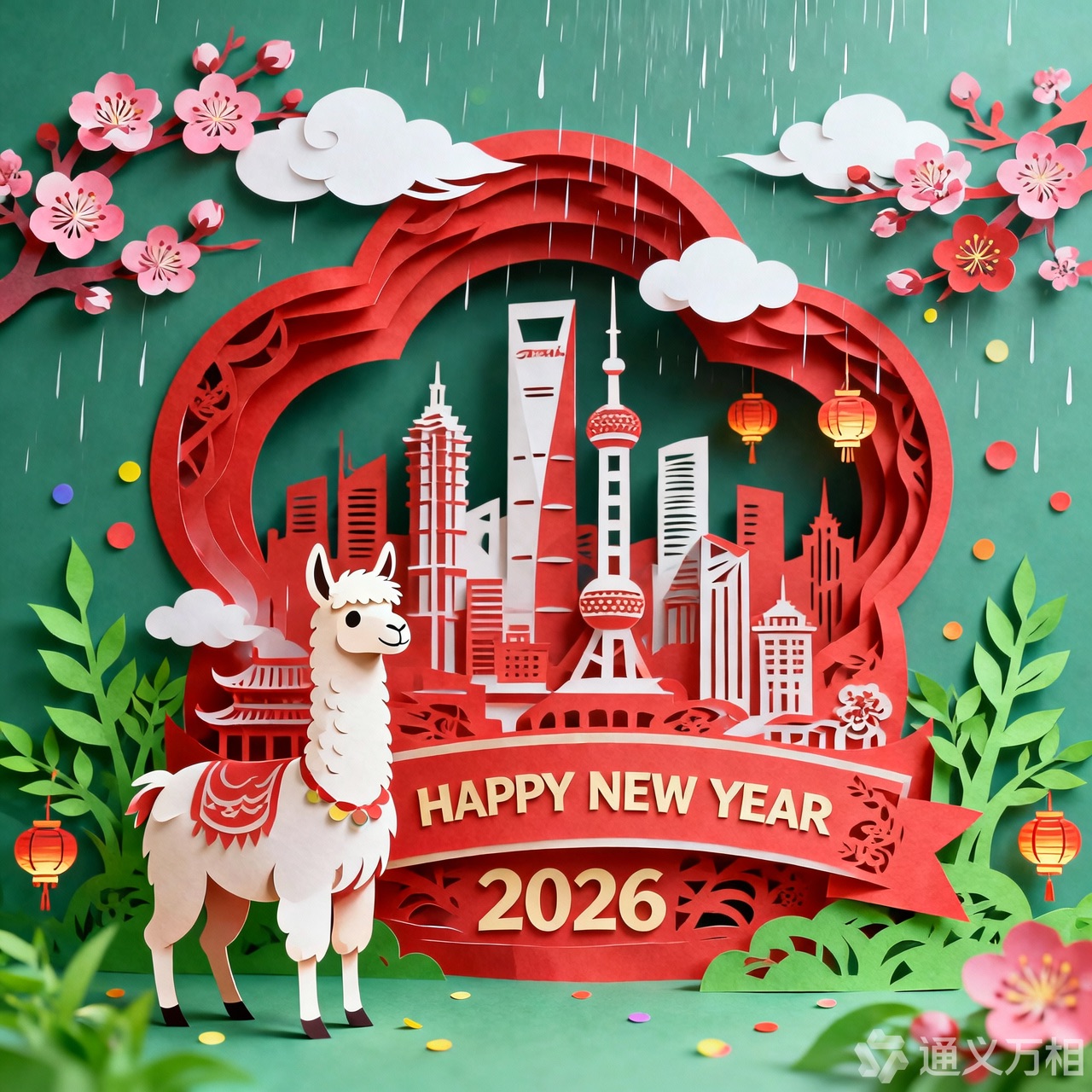 A 3D Chinese paper-cut art illustration , a llama as the hero character in the foreground. From the center, a layered paper-cut cityscape rises, including stylized landmarks such as Shanghai. A paper-cut banner prominently displays ” HAPPY NEW YEAR 2026″. Surrounding elements: paper-cut plum blossoms, spring greenery, light drizzle, white clouds, and subtle festive decorations like tiny paper lanterns or confetti dots.