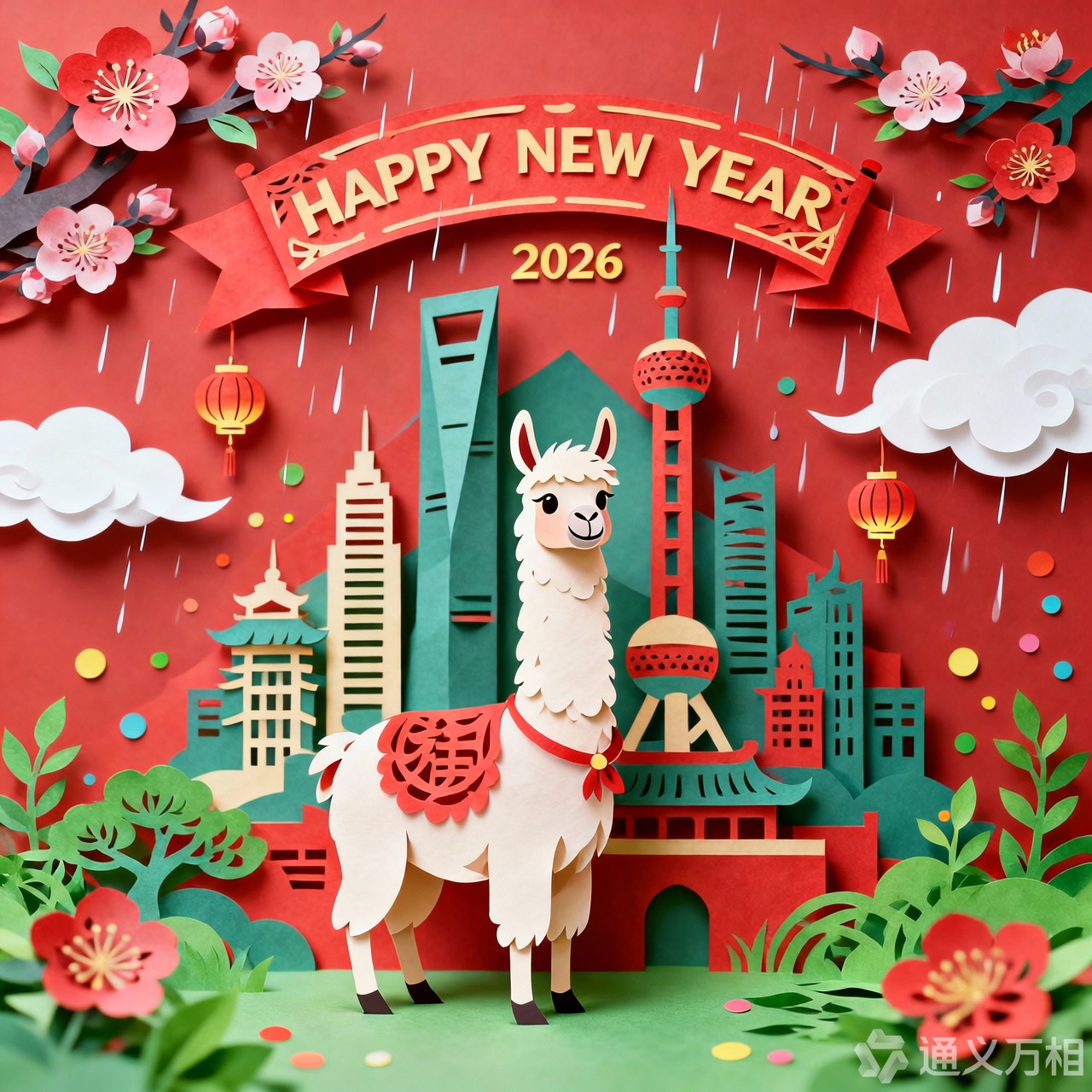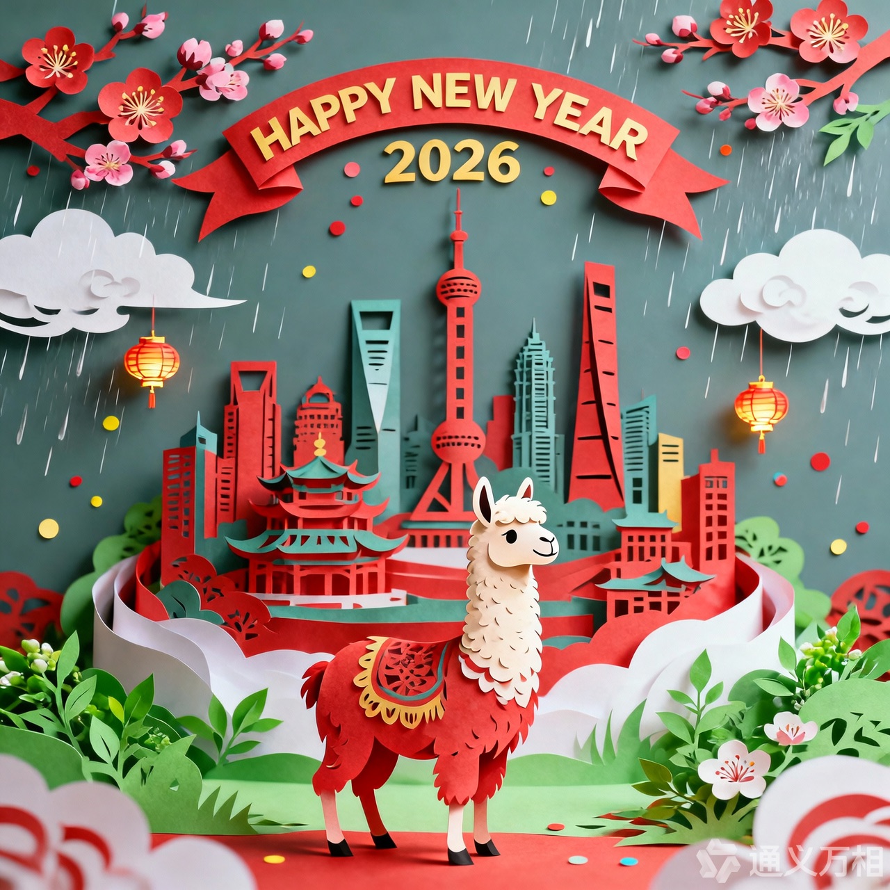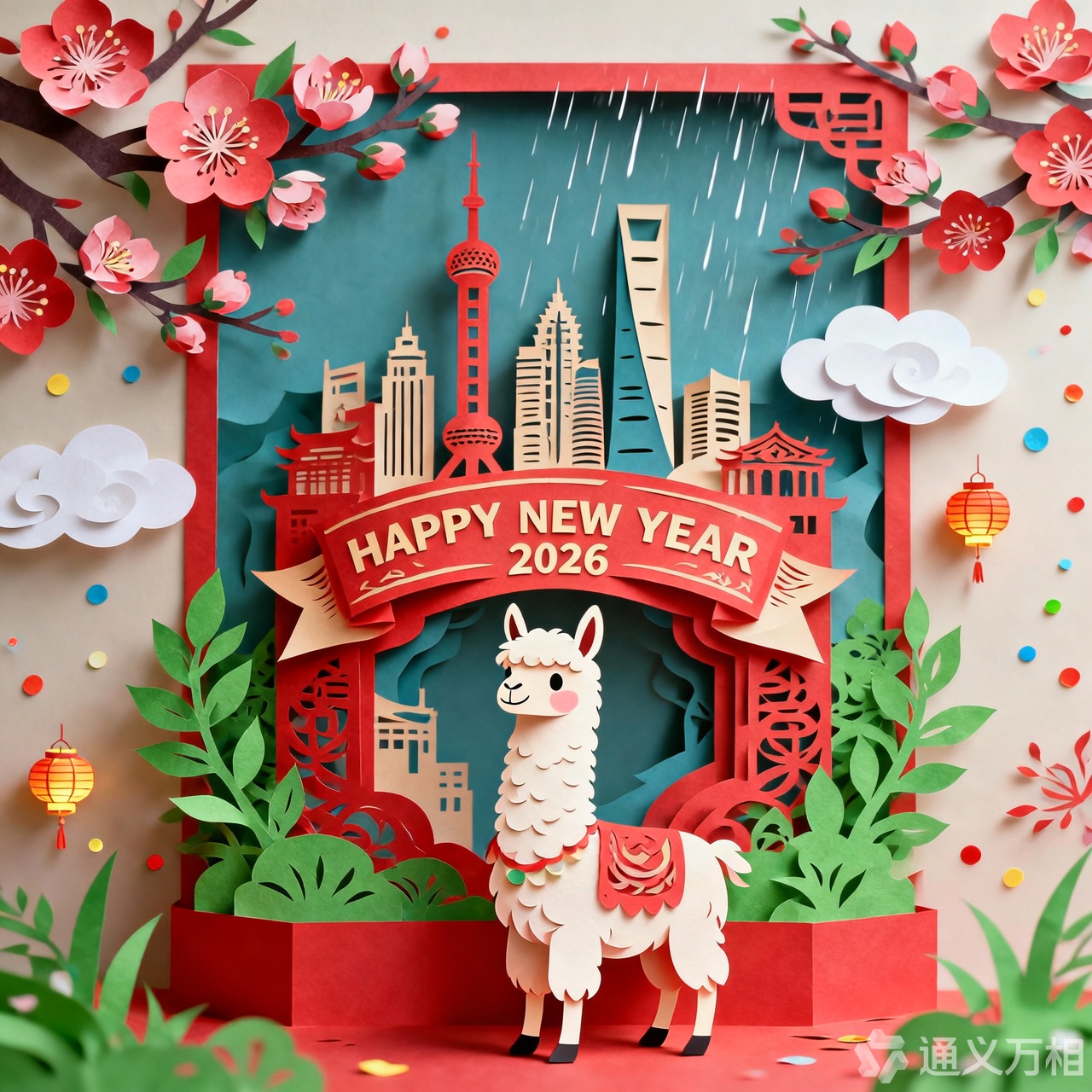 A 3D Chinese paper-cut art illustration , a llama as the hero character in the foreground. From the center, a layered paper-cut cityscape rises, including stylized landmarks such as Shanghai. A paper-cut banner prominently displays ” HAPPY NEW YEAR 2026″. Surrounding elements: paper-cut plum blossoms, spring greenery, light drizzle, white clouds, and subtle festive decorations like tiny paper lanterns or confetti dots.