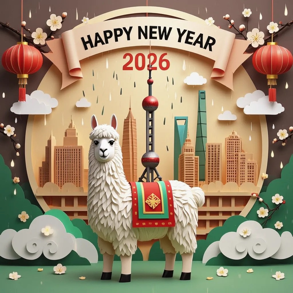 A 3D Chinese paper-cut art illustration , a llama as the hero character in the foreground. From the center, a layered paper-cut cityscape rises, including stylized landmarks such as Shanghai. A paper-cut banner prominently displays ” HAPPY NEW YEAR 2026″. Surrounding elements: paper-cut plum blossoms, spring greenery, light drizzle, white clouds, and subtle festive decorations like tiny paper lanterns or confetti dots.