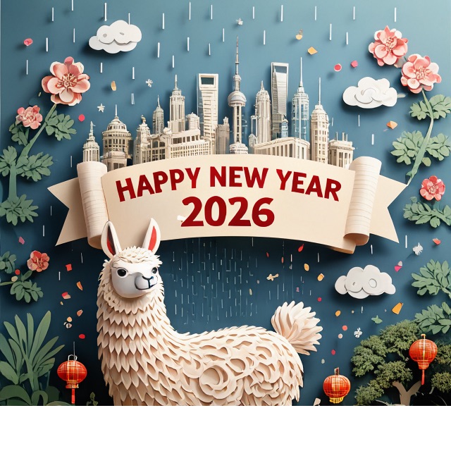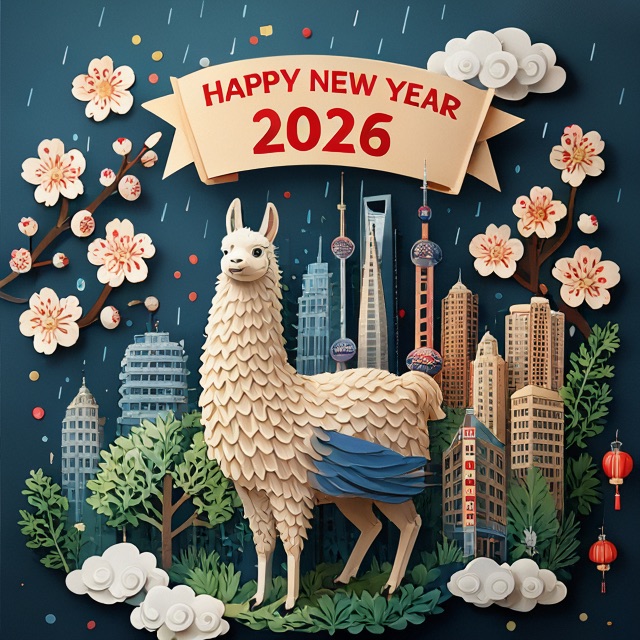 A 3D Chinese paper-cut art illustration , a llama as the hero character in the foreground. From the center, a layered paper-cut cityscape rises, including stylized landmarks such as Shanghai. A paper-cut banner prominently displays ” HAPPY NEW YEAR 2026″. Surrounding elements: paper-cut plum blossoms, spring greenery, light drizzle, white clouds, and subtle festive decorations like tiny paper lanterns or confetti dots.