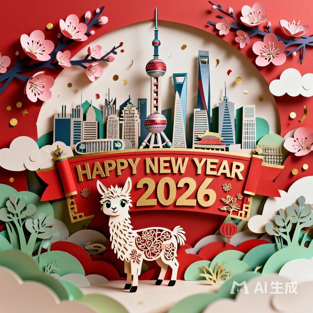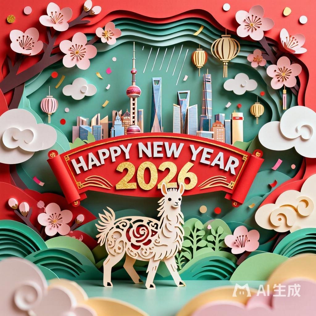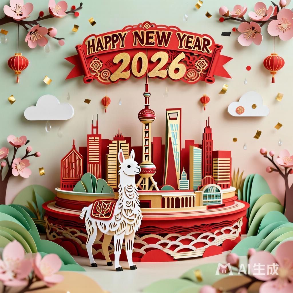 A 3D Chinese paper-cut art illustration , a llama as the hero character in the foreground. From the center, a layered paper-cut cityscape rises, including stylized landmarks such as Shanghai. A paper-cut banner prominently displays ” HAPPY NEW YEAR 2026″. Surrounding elements: paper-cut plum blossoms, spring greenery, light drizzle, white clouds, and subtle festive decorations like tiny paper lanterns or confetti dots.