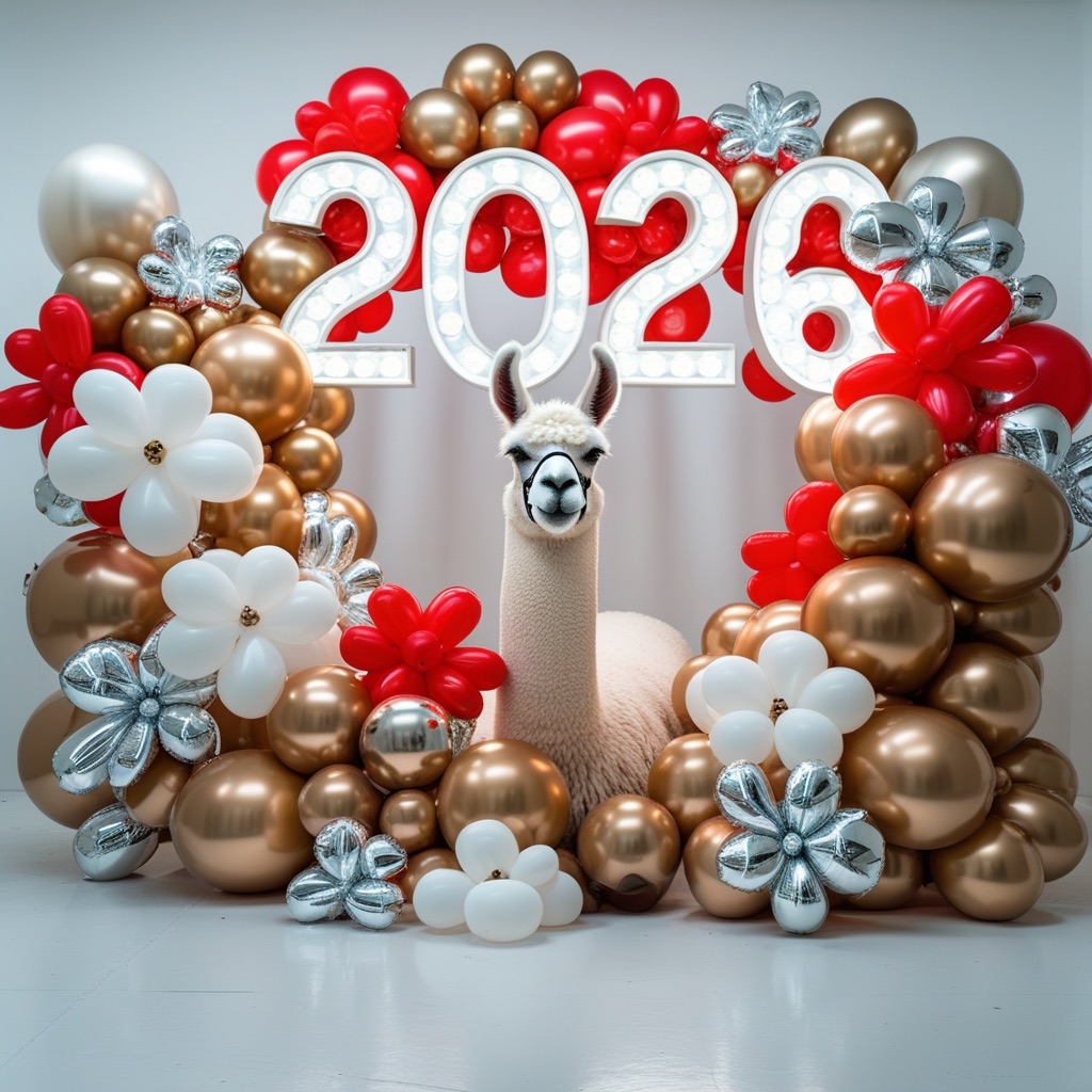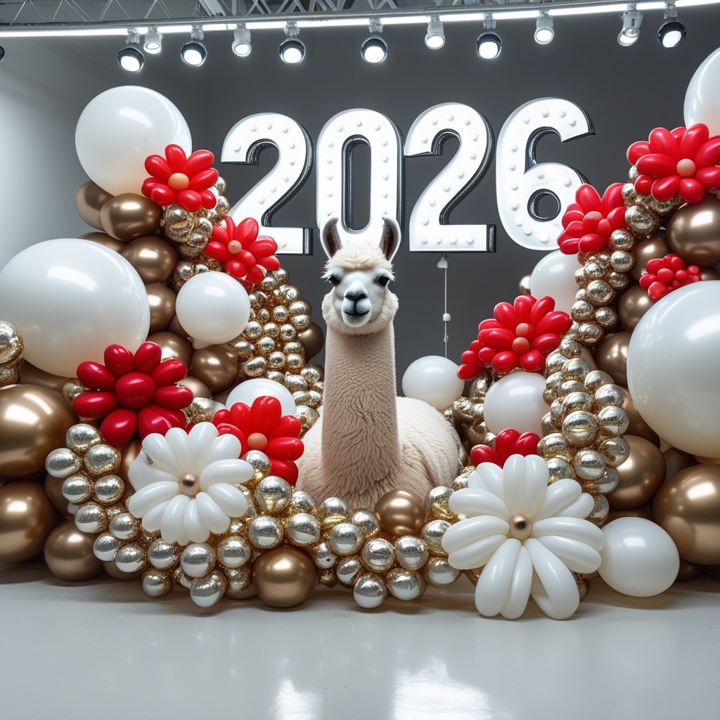 PROMPT: [SUBJECT] is centrally positioned, nestled within and surrounded by a sweeping, immersive balloon art installation for “2026”. Large marquee numbers “2026” with **brilliant, clean white LED lights** form the backdrop. The scene is rich with enormous, sculpted balloon flowers and organic garlands that curve around the subject, creating depth. The layout is sprawling and curated, abundant but **not chaotic or cluttered**, allowing space between elements. Color palette: metallic bronze/gold, vibrant red, and pearlescent white. Textures include highly reflective chrome and matte finishes. Overall atmosphere is bright, airy, with **high-key studio lighting** filling the entire clean white space. 8k resolution