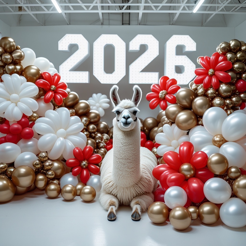 A white llama is centrally positioned, nestled within and surrounded by a sweeping, immersive balloon art installation for “2026”. Large marquee numbers “2026” with **brilliant, clean white LED lights** form the backdrop. The scene is rich with enormous, sculpted balloon flowers and organic garlands that curve around the subject, creating depth. The layout is sprawling and curated, abundant but **not chaotic or cluttered**, allowing space between elements. Color palette: metallic bronze/gold, vibrant red, and pearlescent white. Textures include highly reflective chrome and matte finishes. Overall atmosphere is bright, airy, with **high-key studio lighting** filling the entire clean white space. 8k resolution