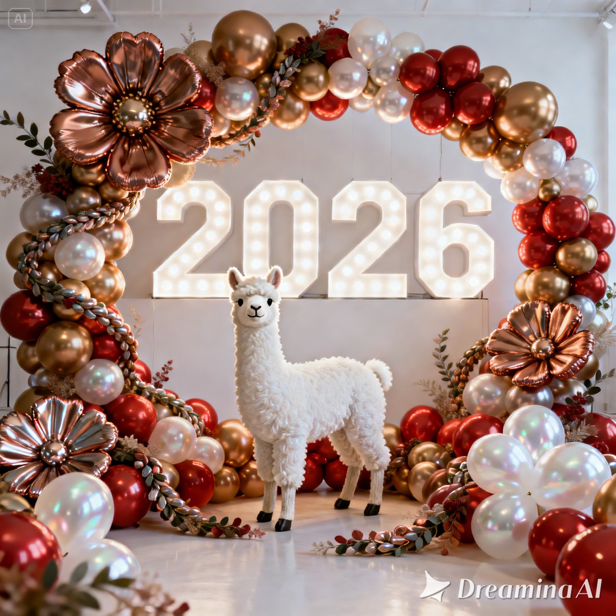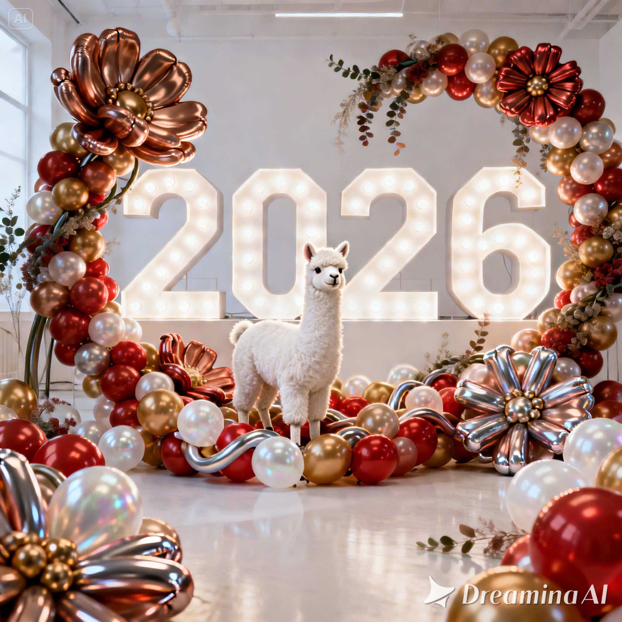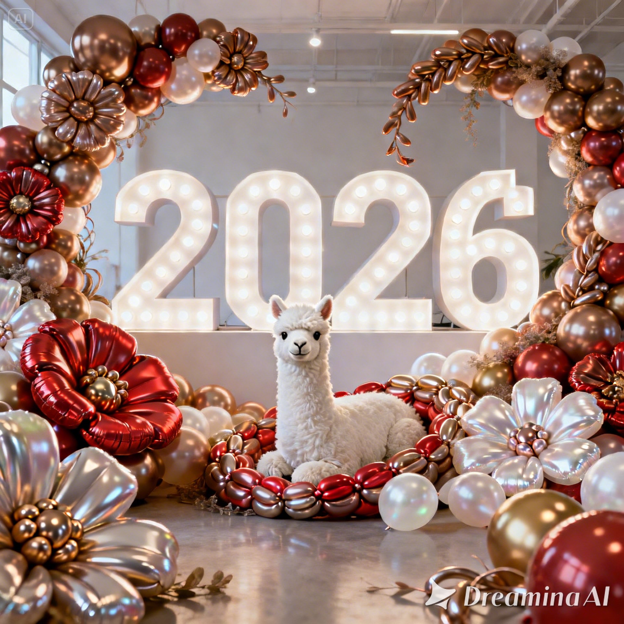 A white llama is centrally positioned, nestled within and surrounded by a sweeping, immersive balloon art installation for “2026”. Large marquee numbers “2026” with **brilliant, clean white LED lights** form the backdrop. The scene is rich with enormous, sculpted balloon flowers and organic garlands that curve around the subject, creating depth. The layout is sprawling and curated, abundant but **not chaotic or cluttered**, allowing space between elements. Color palette: metallic bronze/gold, vibrant red, and pearlescent white. Textures include highly reflective chrome and matte finishes. Overall atmosphere is bright, airy, with **high-key studio lighting** filling the entire clean white space. 8k resolution