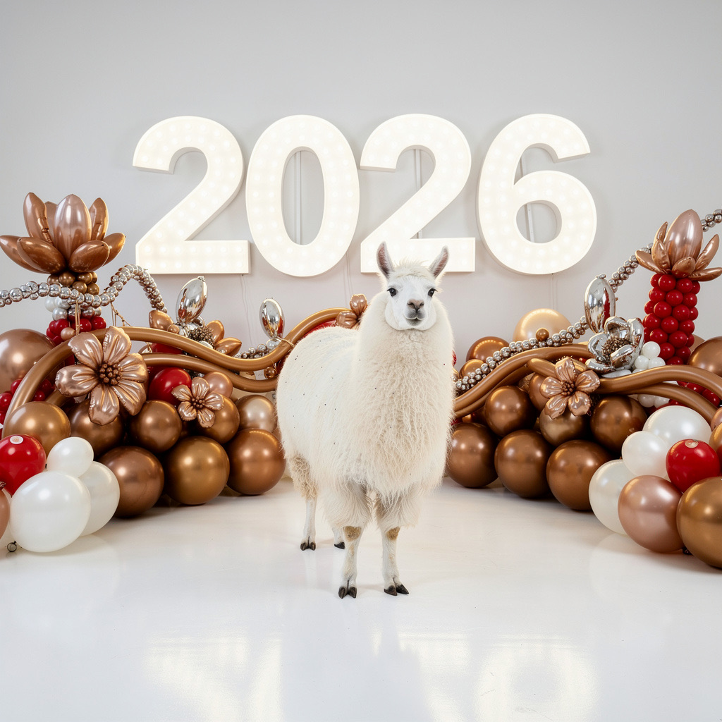 A white llama is centrally positioned, nestled within and surrounded by a sweeping, immersive balloon art installation for “2026”. Large marquee numbers “2026” with **brilliant, clean white LED lights** form the backdrop. The scene is rich with enormous, sculpted balloon flowers and organic garlands that curve around the subject, creating depth. The layout is sprawling and curated, abundant but **not chaotic or cluttered**, allowing space between elements. Color palette: metallic bronze/gold, vibrant red, and pearlescent white. Textures include highly reflective chrome and matte finishes. Overall atmosphere is bright, airy, with **high-key studio lighting** filling the entire clean white space. 8k resolution