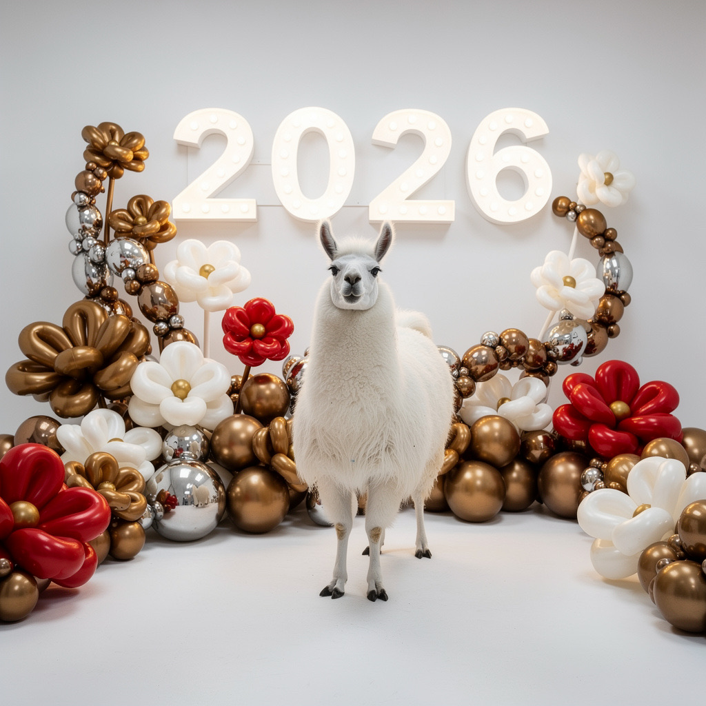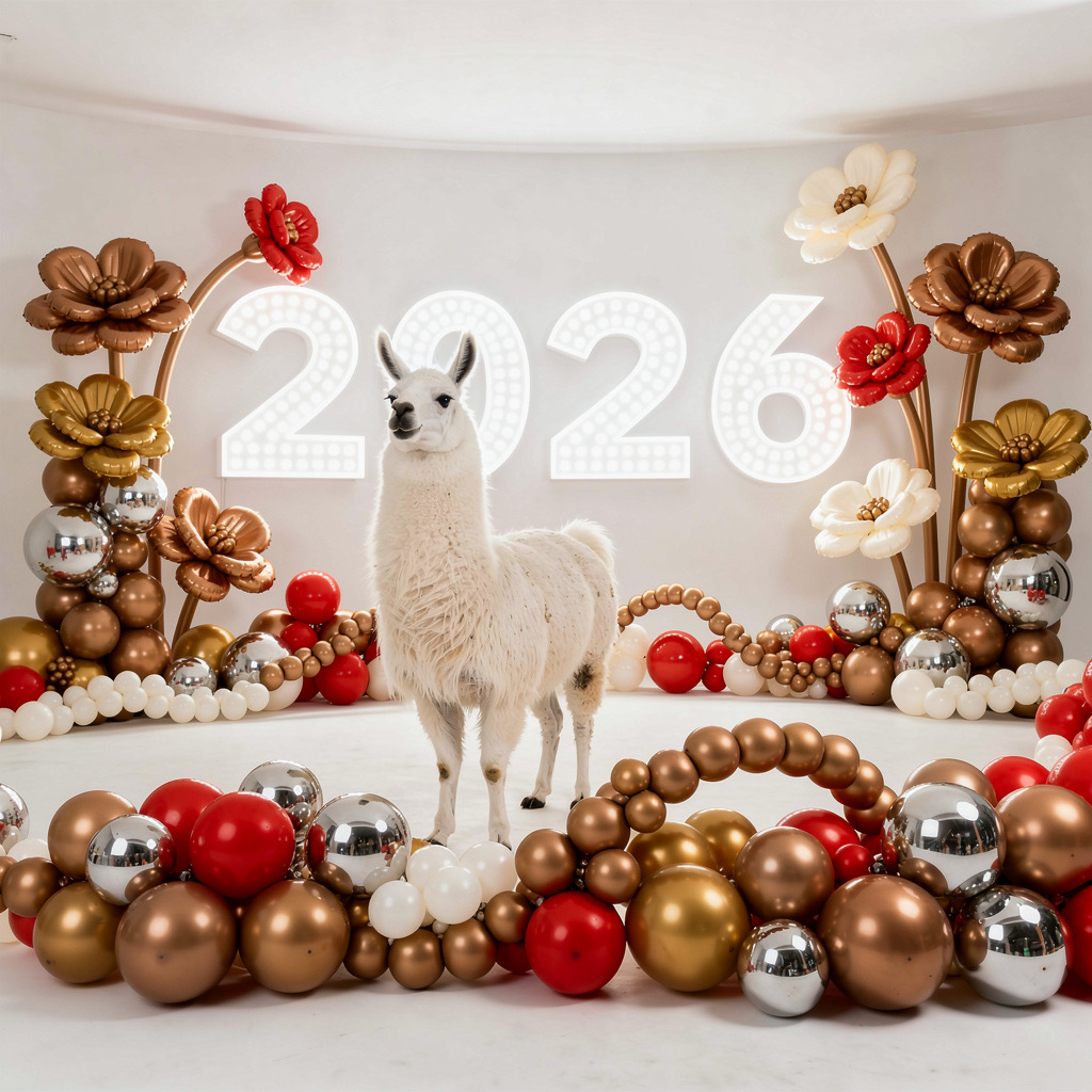 PROMPT: [SUBJECT] is centrally positioned, nestled within and surrounded by a sweeping, immersive balloon art installation for “2026”. Large marquee numbers “2026” with **brilliant, clean white LED lights** form the backdrop. The scene is rich with enormous, sculpted balloon flowers and organic garlands that curve around the subject, creating depth. The layout is sprawling and curated, abundant but **not chaotic or cluttered**, allowing space between elements. Color palette: metallic bronze/gold, vibrant red, and pearlescent white. Textures include highly reflective chrome and matte finishes. Overall atmosphere is bright, airy, with **high-key studio lighting** filling the entire clean white space. 8k resolution