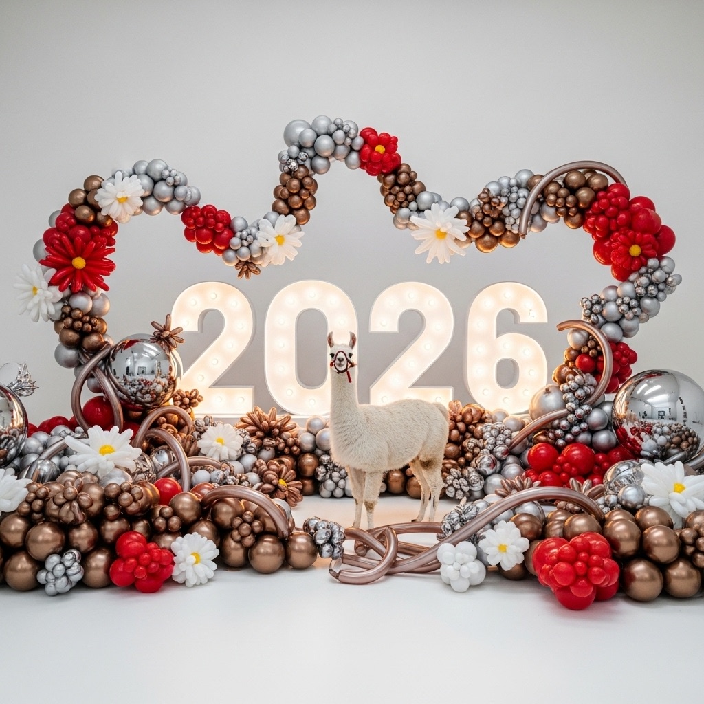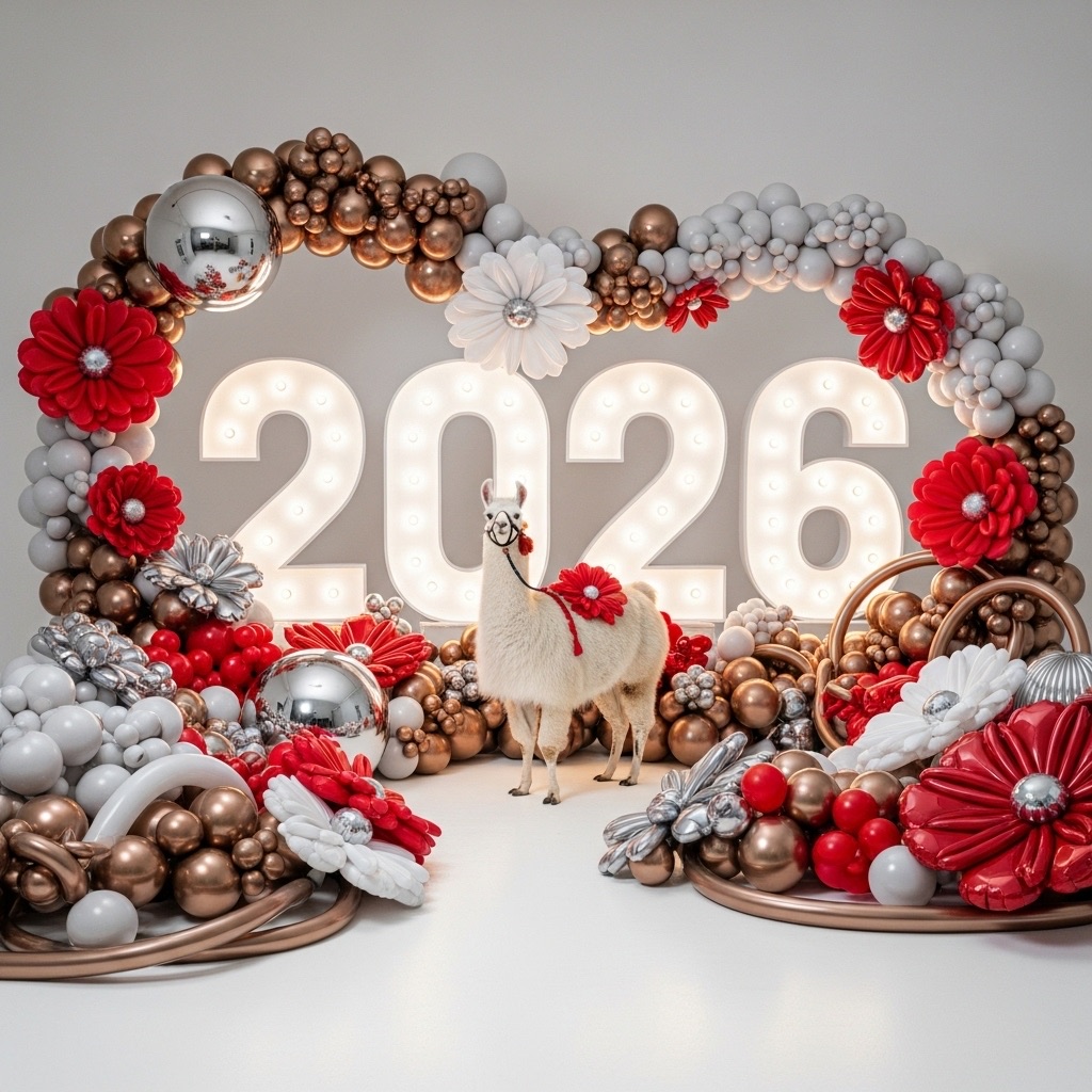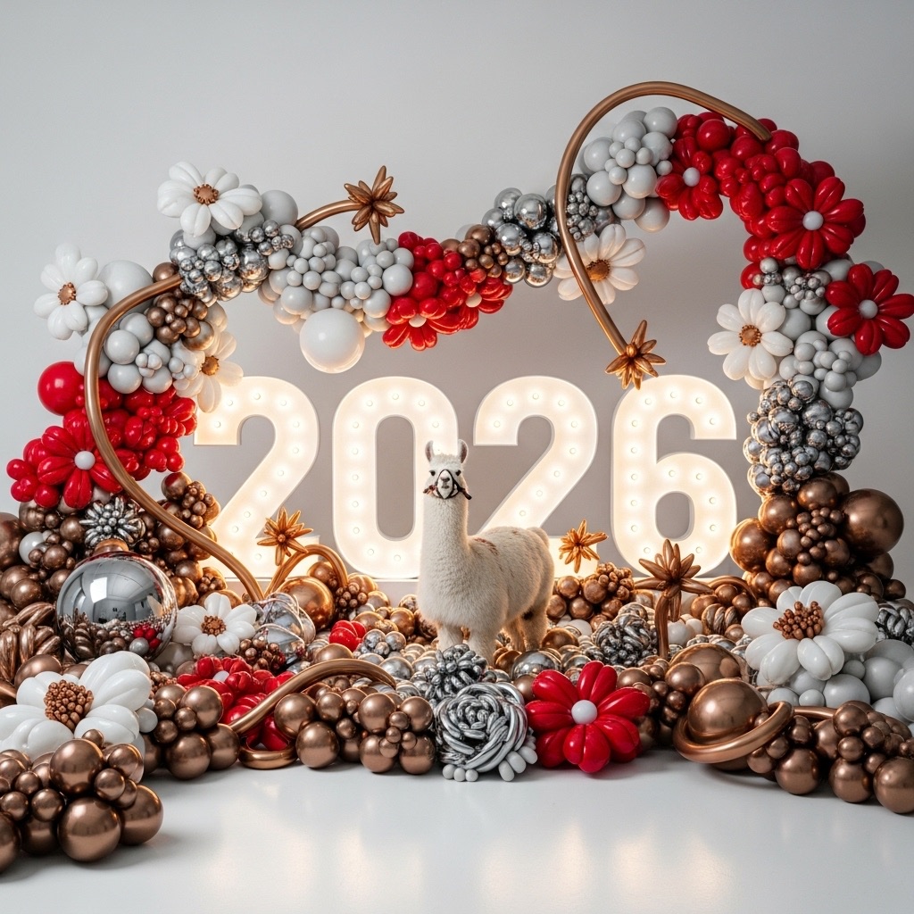 PROMPT: [SUBJECT] is centrally positioned, nestled within and surrounded by a sweeping, immersive balloon art installation for “2026”. Large marquee numbers “2026” with **brilliant, clean white LED lights** form the backdrop. The scene is rich with enormous, sculpted balloon flowers and organic garlands that curve around the subject, creating depth. The layout is sprawling and curated, abundant but **not chaotic or cluttered**, allowing space between elements. Color palette: metallic bronze/gold, vibrant red, and pearlescent white. Textures include highly reflective chrome and matte finishes. Overall atmosphere is bright, airy, with **high-key studio lighting** filling the entire clean white space. 8k resolution