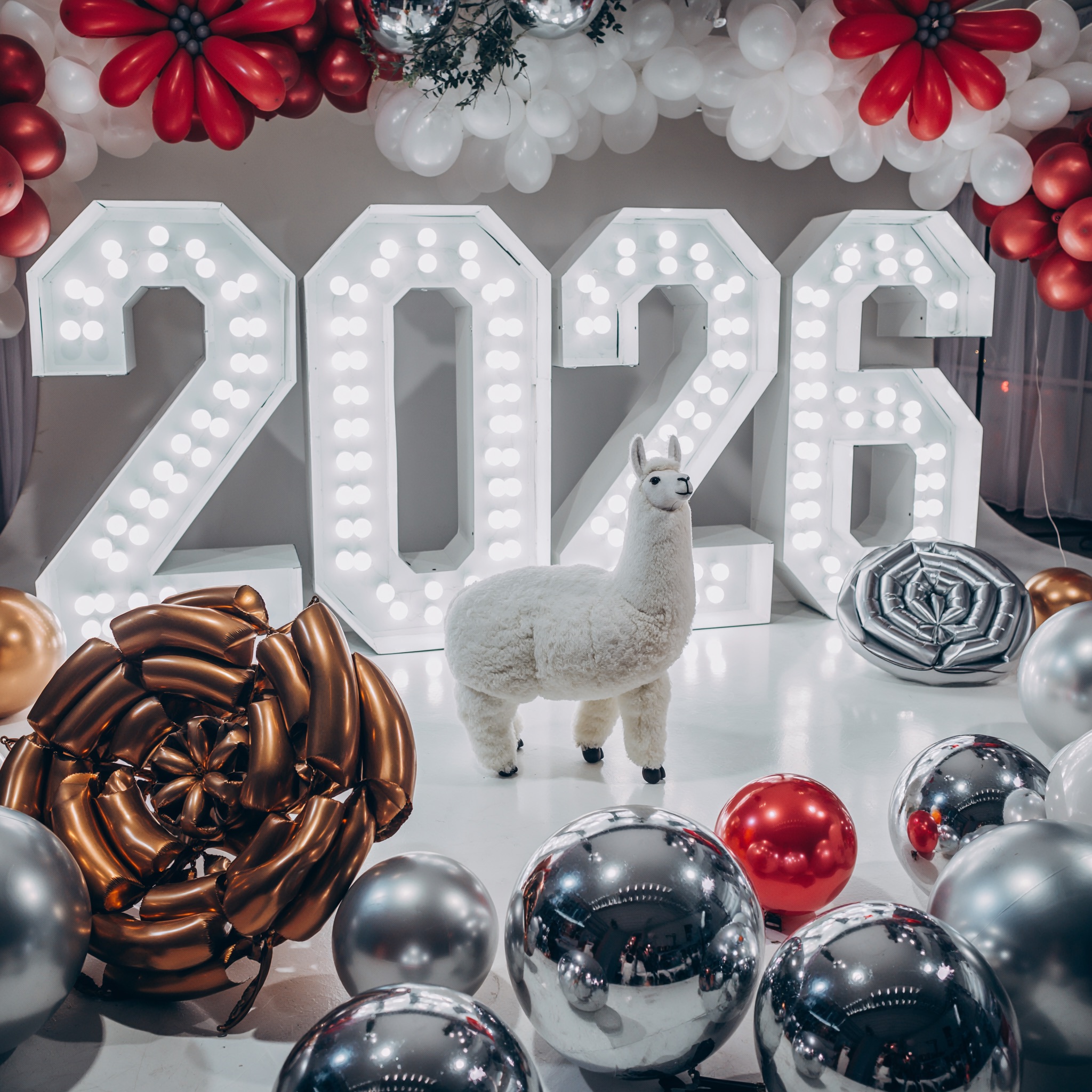 A white llama is centrally positioned, nestled within and surrounded by a sweeping, immersive balloon art installation for “2026”. Large marquee numbers “2026” with **brilliant, clean white LED lights** form the backdrop. The scene is rich with enormous, sculpted balloon flowers and organic garlands that curve around the subject, creating depth. The layout is sprawling and curated, abundant but **not chaotic or cluttered**, allowing space between elements. Color palette: metallic bronze/gold, vibrant red, and pearlescent white. Textures include highly reflective chrome and matte finishes. Overall atmosphere is bright, airy, with **high-key studio lighting** filling the entire clean white space. 8k resolution