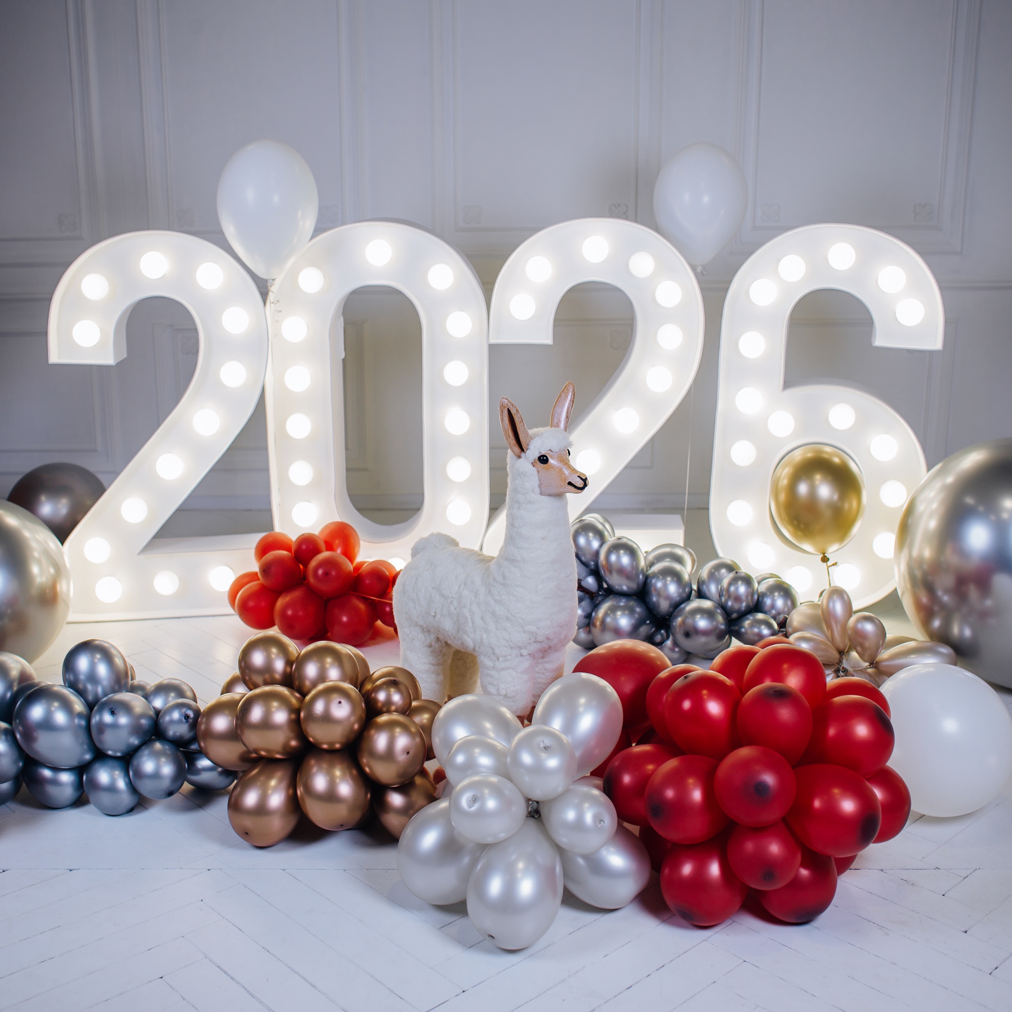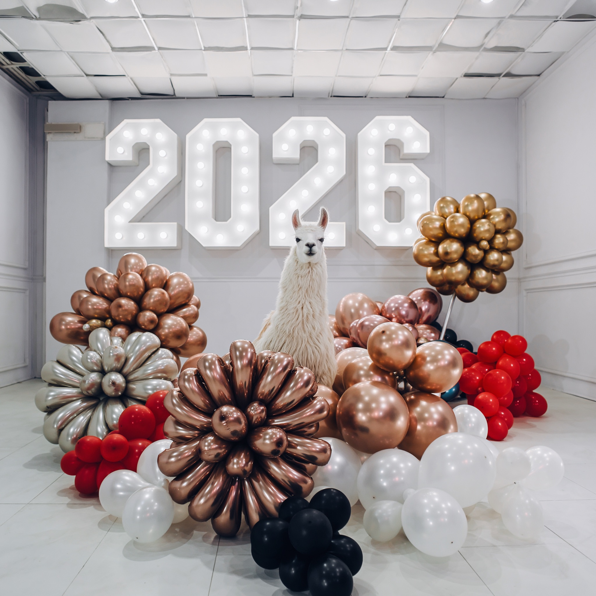 PROMPT: [SUBJECT] is centrally positioned, nestled within and surrounded by a sweeping, immersive balloon art installation for “2026”. Large marquee numbers “2026” with **brilliant, clean white LED lights** form the backdrop. The scene is rich with enormous, sculpted balloon flowers and organic garlands that curve around the subject, creating depth. The layout is sprawling and curated, abundant but **not chaotic or cluttered**, allowing space between elements. Color palette: metallic bronze/gold, vibrant red, and pearlescent white. Textures include highly reflective chrome and matte finishes. Overall atmosphere is bright, airy, with **high-key studio lighting** filling the entire clean white space. 8k resolution