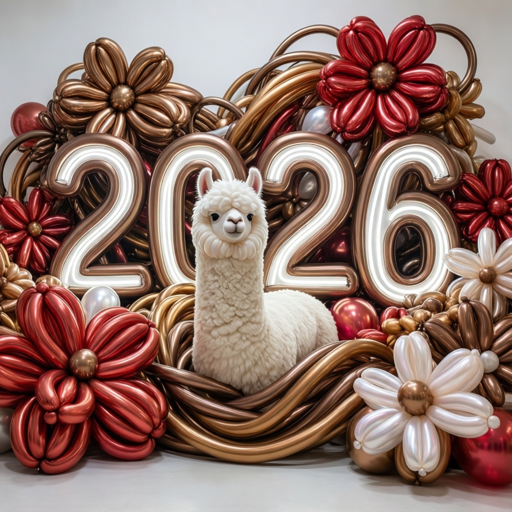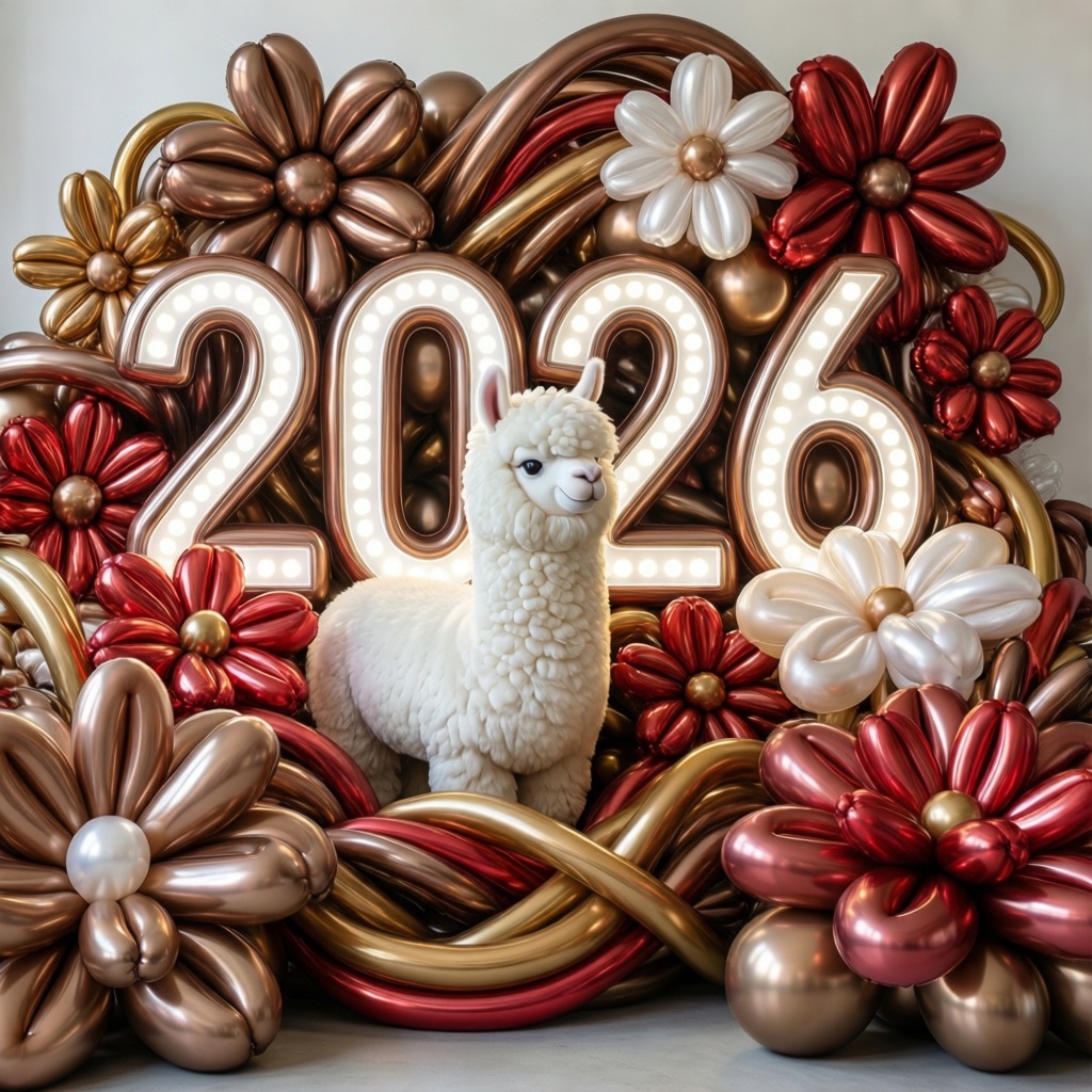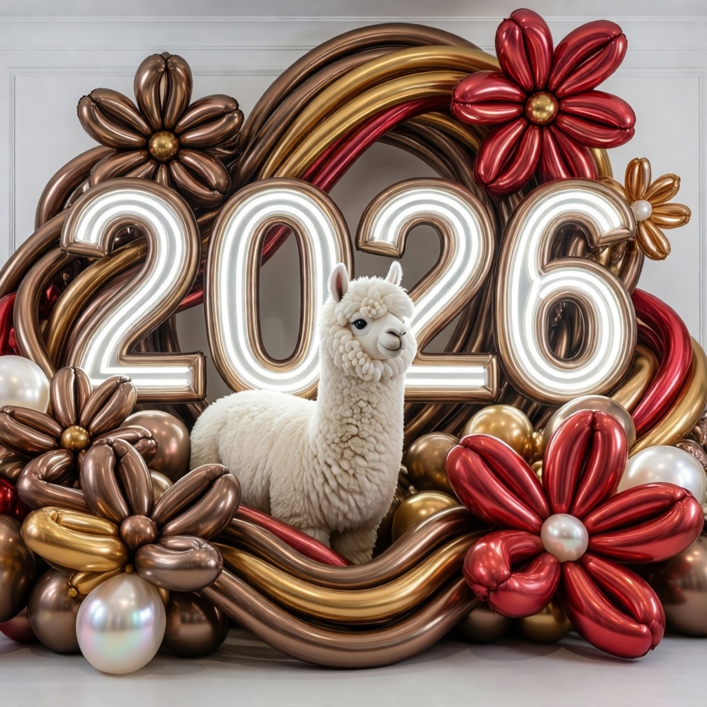 PROMPT: [SUBJECT] is centrally positioned, nestled within and surrounded by a sweeping, immersive balloon art installation for “2026”. Large marquee numbers “2026” with **brilliant, clean white LED lights** form the backdrop. The scene is rich with enormous, sculpted balloon flowers and organic garlands that curve around the subject, creating depth. The layout is sprawling and curated, abundant but **not chaotic or cluttered**, allowing space between elements. Color palette: metallic bronze/gold, vibrant red, and pearlescent white. Textures include highly reflective chrome and matte finishes. Overall atmosphere is bright, airy, with **high-key studio lighting** filling the entire clean white space. 8k resolution