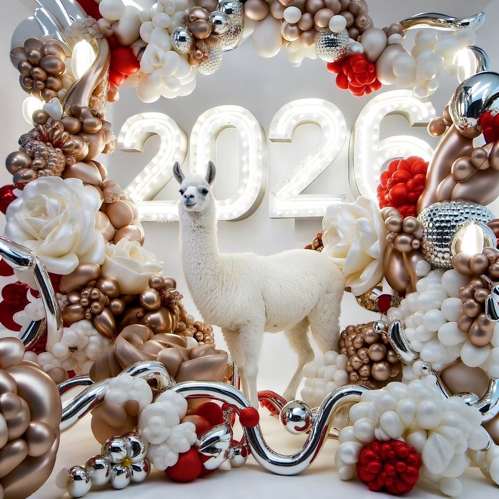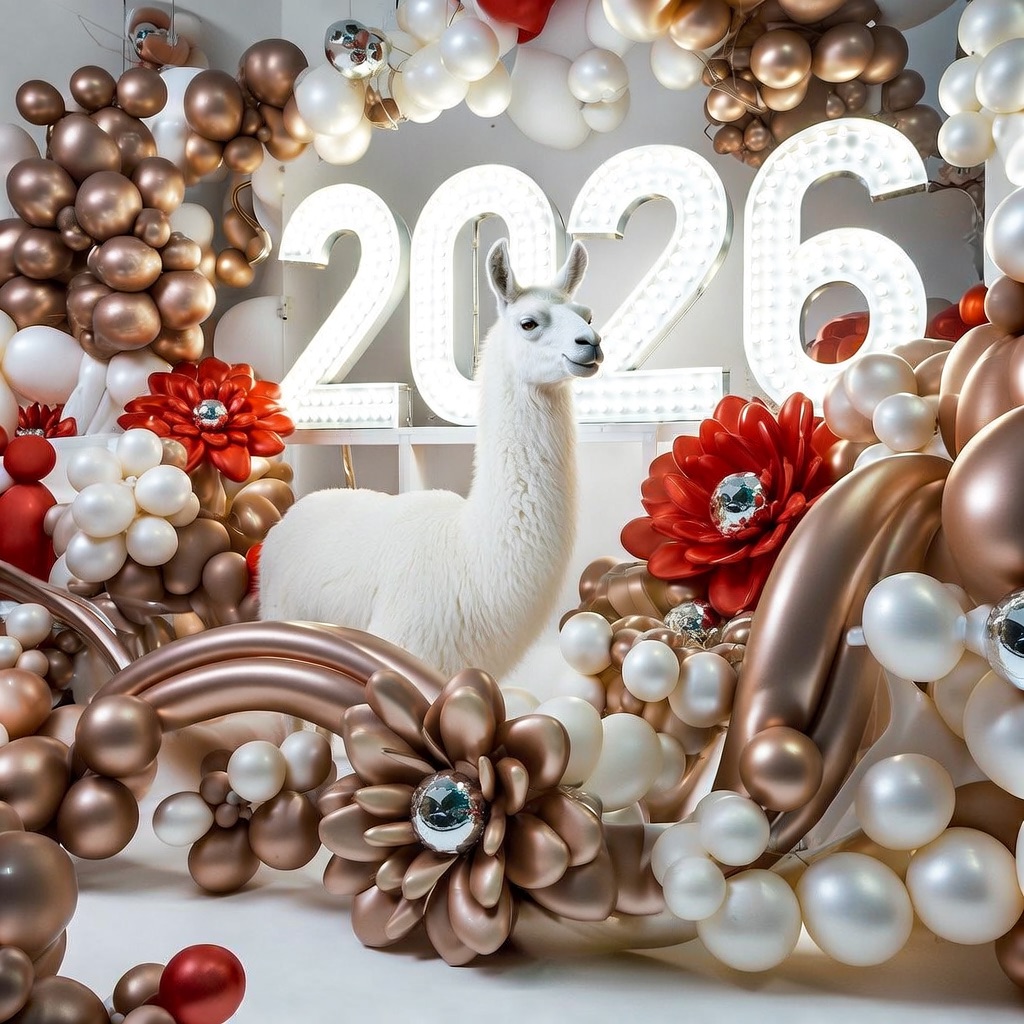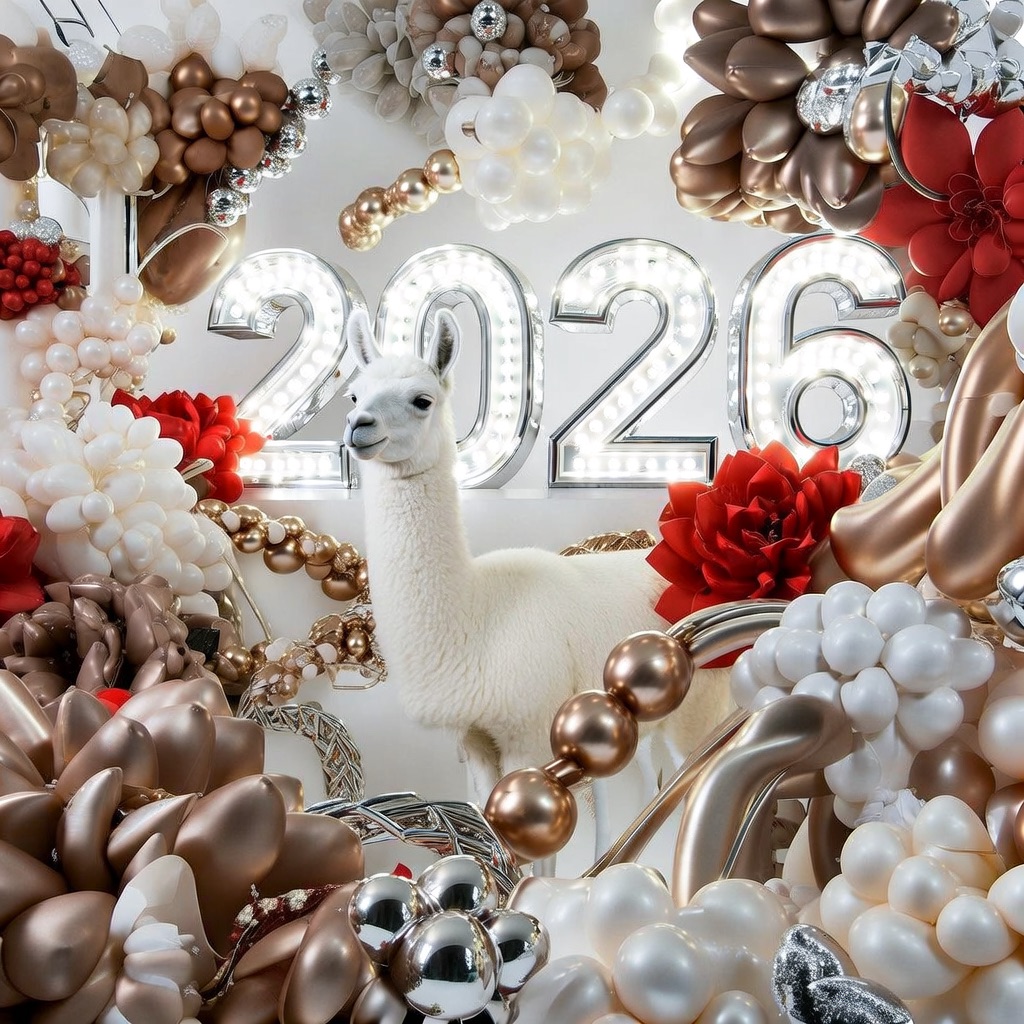 A white llama is centrally positioned, nestled within and surrounded by a sweeping, immersive balloon art installation for “2026”. Large marquee numbers “2026” with **brilliant, clean white LED lights** form the backdrop. The scene is rich with enormous, sculpted balloon flowers and organic garlands that curve around the subject, creating depth. The layout is sprawling and curated, abundant but **not chaotic or cluttered**, allowing space between elements. Color palette: metallic bronze/gold, vibrant red, and pearlescent white. Textures include highly reflective chrome and matte finishes. Overall atmosphere is bright, airy, with **high-key studio lighting** filling the entire clean white space. 8k resolution