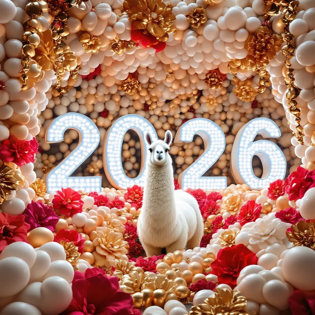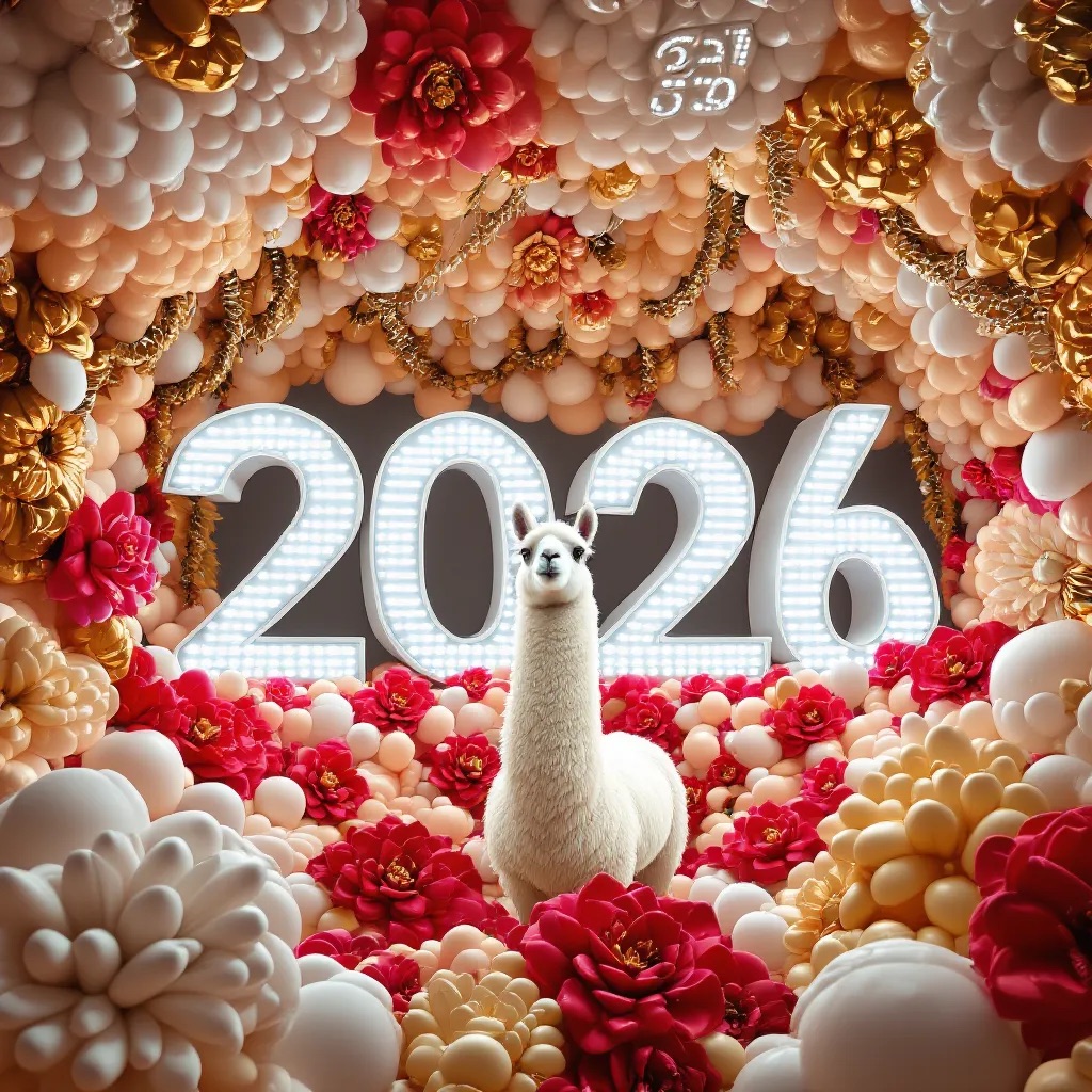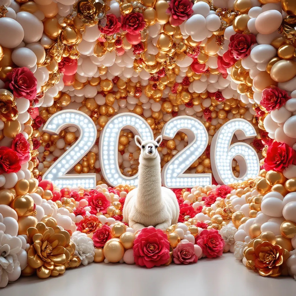 PROMPT: [SUBJECT] is centrally positioned, nestled within and surrounded by a sweeping, immersive balloon art installation for “2026”. Large marquee numbers “2026” with **brilliant, clean white LED lights** form the backdrop. The scene is rich with enormous, sculpted balloon flowers and organic garlands that curve around the subject, creating depth. The layout is sprawling and curated, abundant but **not chaotic or cluttered**, allowing space between elements. Color palette: metallic bronze/gold, vibrant red, and pearlescent white. Textures include highly reflective chrome and matte finishes. Overall atmosphere is bright, airy, with **high-key studio lighting** filling the entire clean white space. 8k resolution