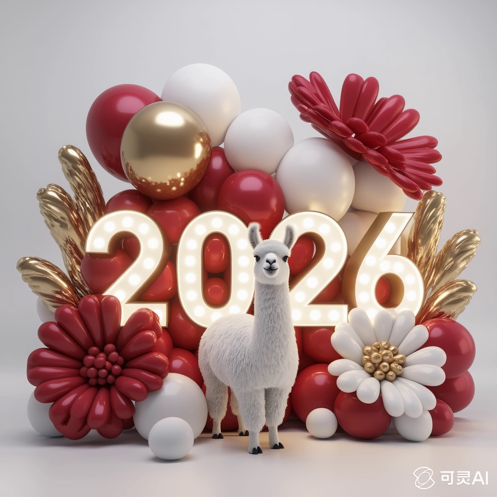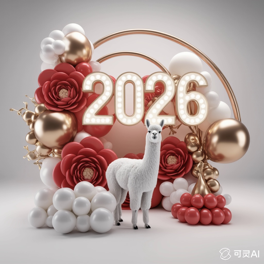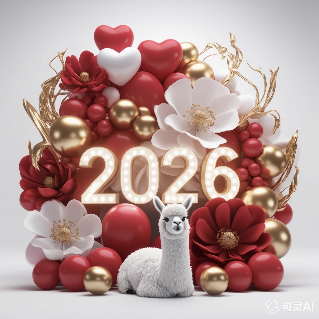 A white llama is centrally positioned, nestled within and surrounded by a sweeping, immersive balloon art installation for “2026”. Large marquee numbers “2026” with **brilliant, clean white LED lights** form the backdrop. The scene is rich with enormous, sculpted balloon flowers and organic garlands that curve around the subject, creating depth. The layout is sprawling and curated, abundant but **not chaotic or cluttered**, allowing space between elements. Color palette: metallic bronze/gold, vibrant red, and pearlescent white. Textures include highly reflective chrome and matte finishes. Overall atmosphere is bright, airy, with **high-key studio lighting** filling the entire clean white space. 8k resolution