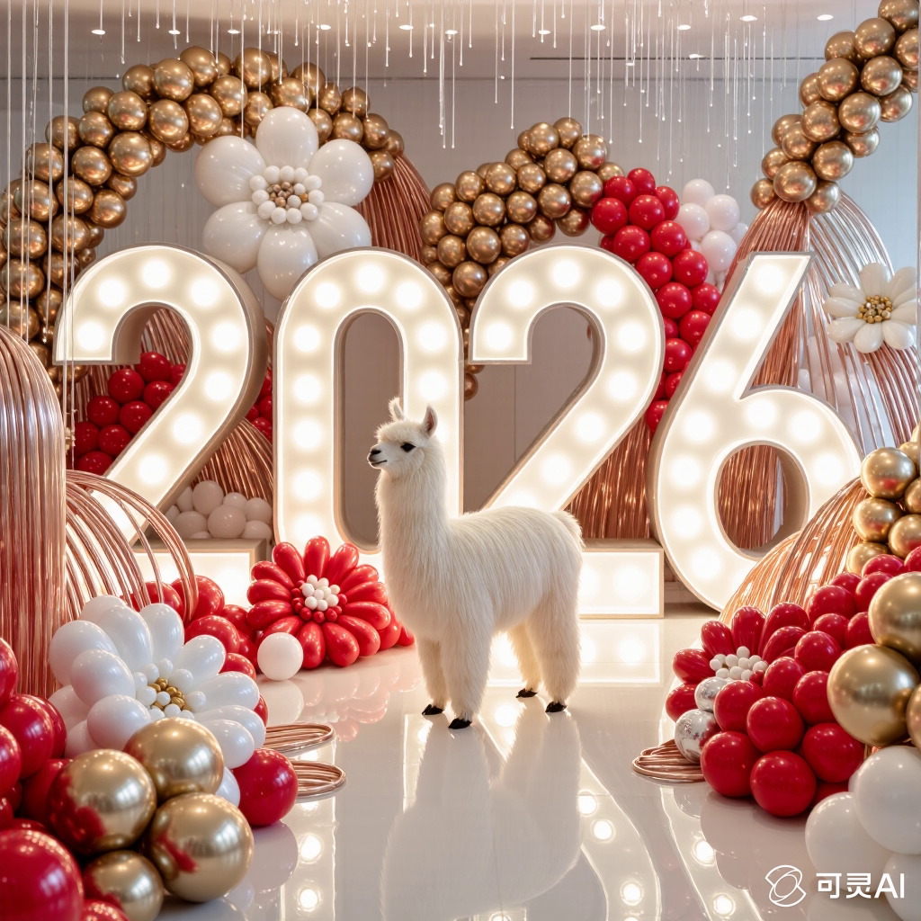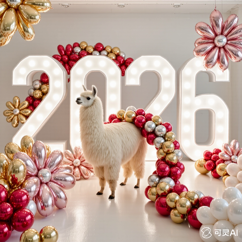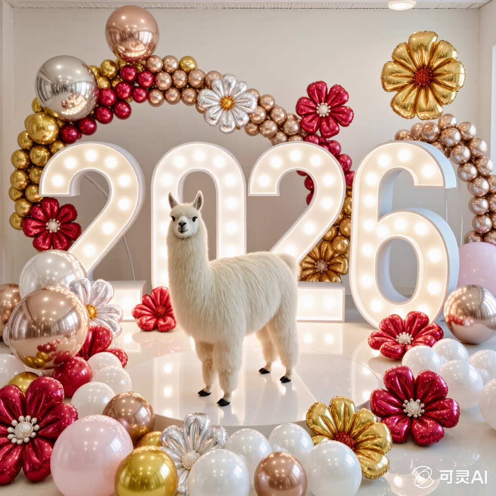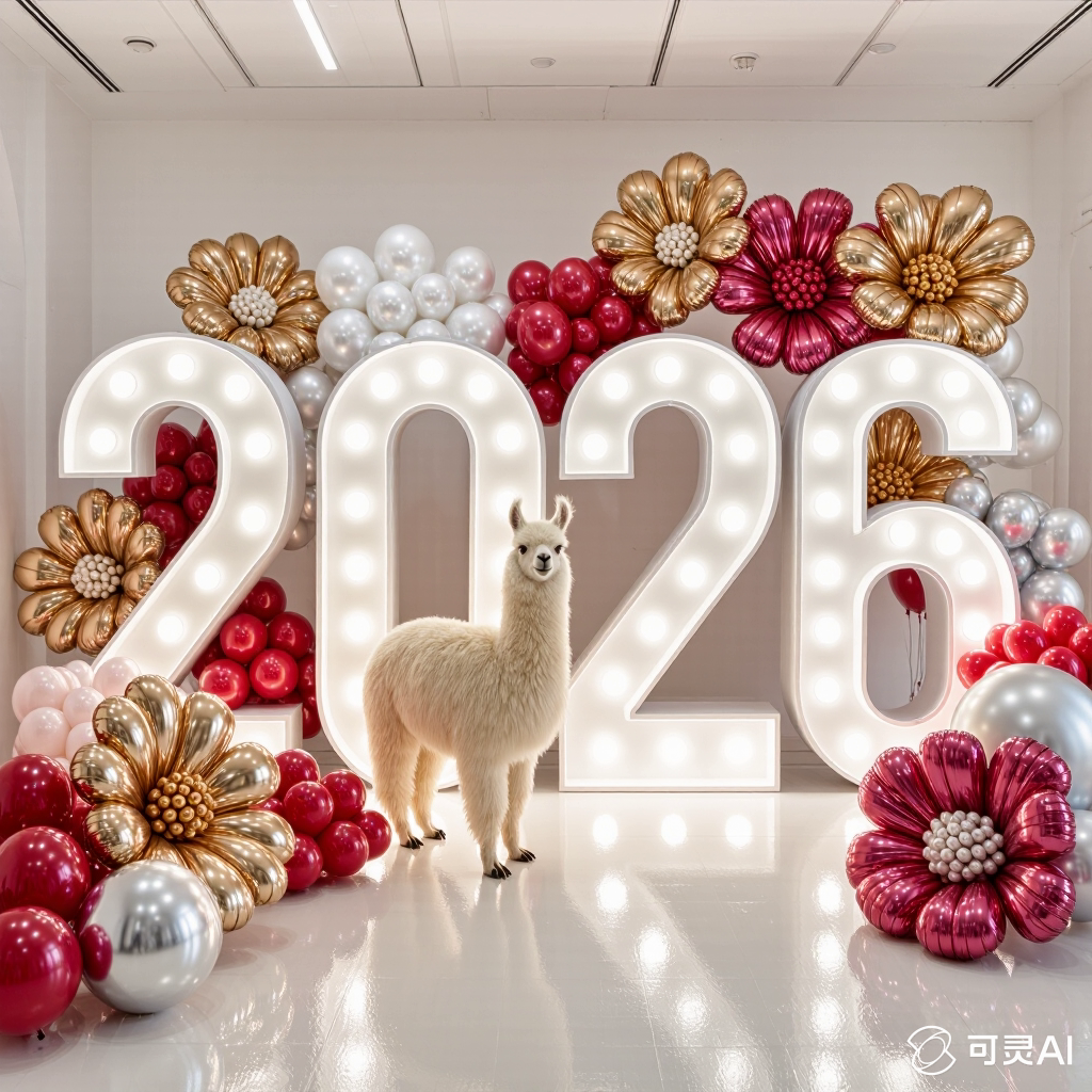 PROMPT: [SUBJECT] is centrally positioned, nestled within and surrounded by a sweeping, immersive balloon art installation for “2026”. Large marquee numbers “2026” with **brilliant, clean white LED lights** form the backdrop. The scene is rich with enormous, sculpted balloon flowers and organic garlands that curve around the subject, creating depth. The layout is sprawling and curated, abundant but **not chaotic or cluttered**, allowing space between elements. Color palette: metallic bronze/gold, vibrant red, and pearlescent white. Textures include highly reflective chrome and matte finishes. Overall atmosphere is bright, airy, with **high-key studio lighting** filling the entire clean white space. 8k resolution