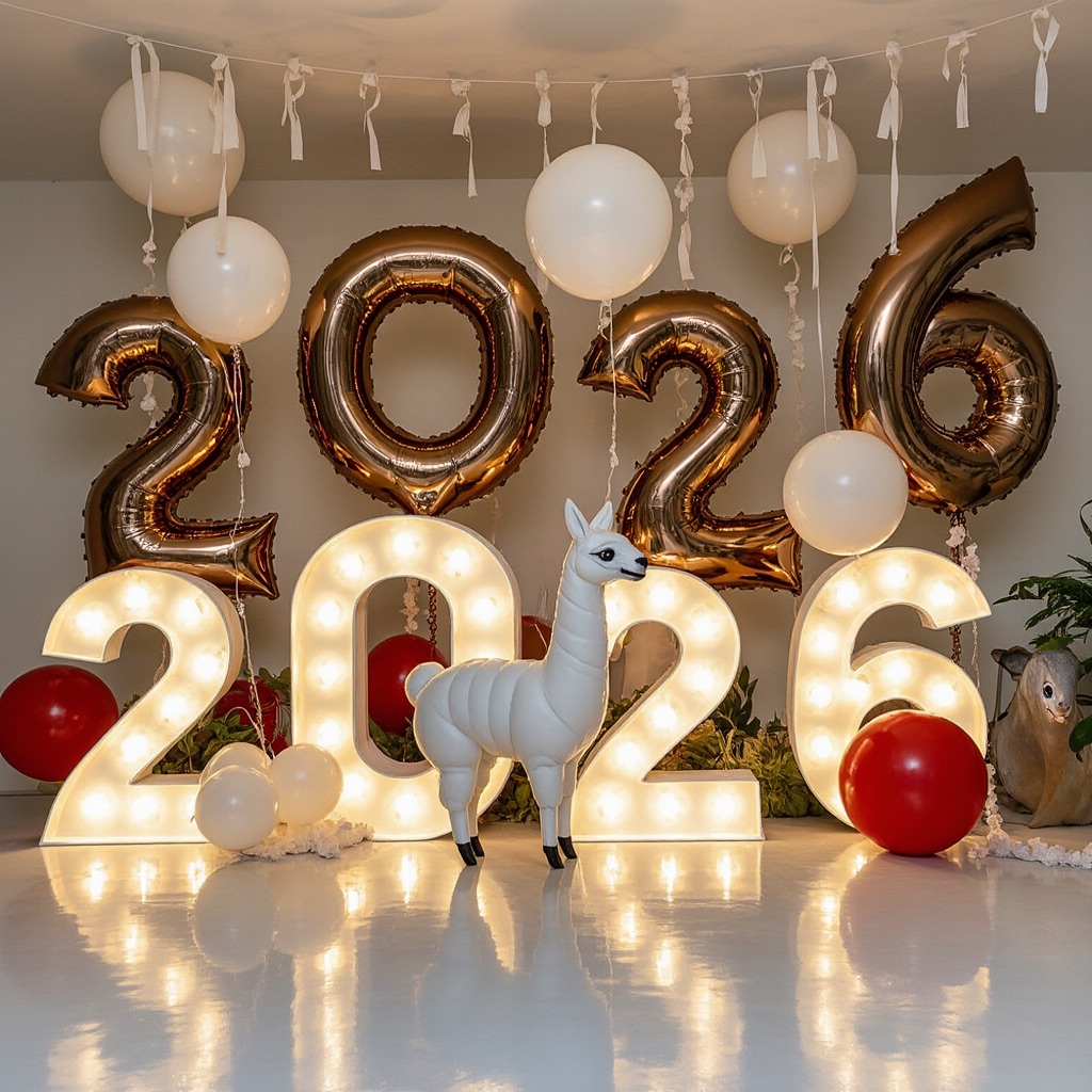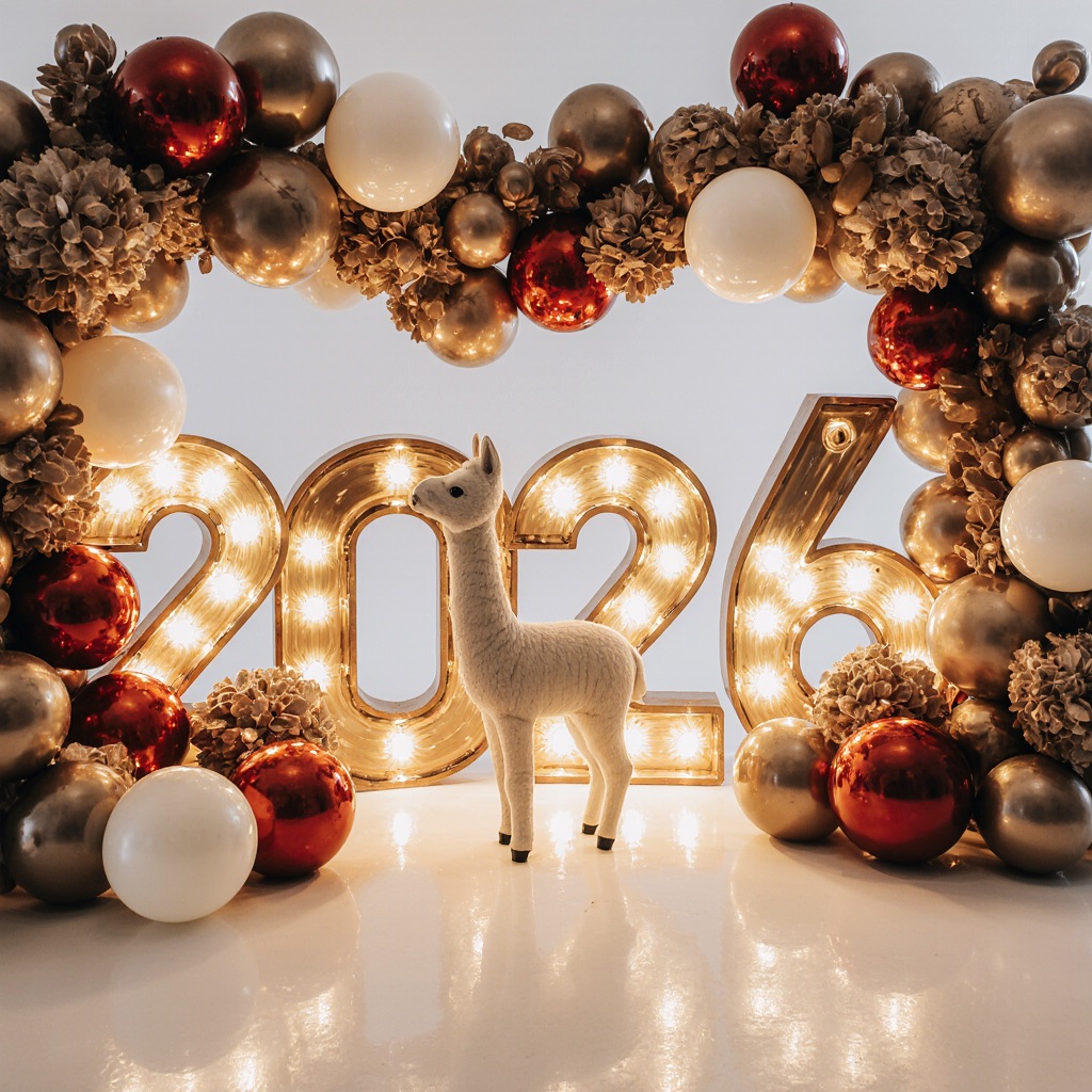 PROMPT: [SUBJECT] is centrally positioned, nestled within and surrounded by a sweeping, immersive balloon art installation for “2026”. Large marquee numbers “2026” with **brilliant, clean white LED lights** form the backdrop. The scene is rich with enormous, sculpted balloon flowers and organic garlands that curve around the subject, creating depth. The layout is sprawling and curated, abundant but **not chaotic or cluttered**, allowing space between elements. Color palette: metallic bronze/gold, vibrant red, and pearlescent white. Textures include highly reflective chrome and matte finishes. Overall atmosphere is bright, airy, with **high-key studio lighting** filling the entire clean white space. 8k resolution