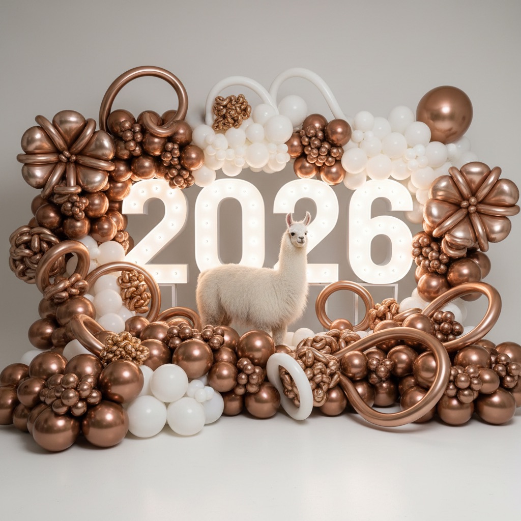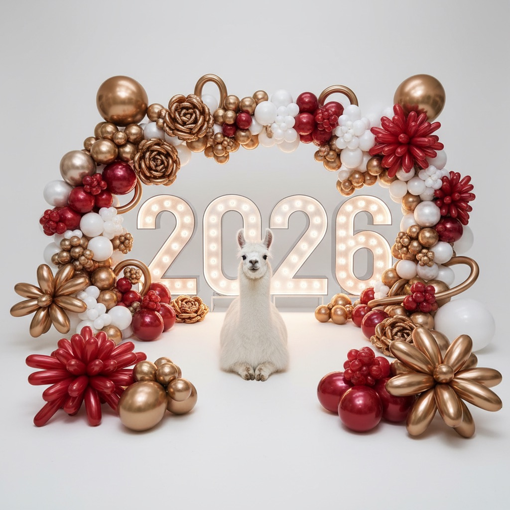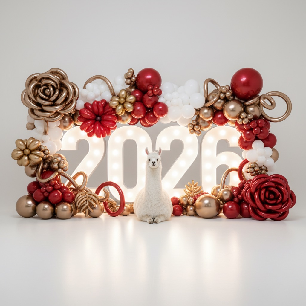PROMPT: [SUBJECT] is centrally positioned, nestled within and surrounded by a sweeping, immersive balloon art installation for “2026”. Large marquee numbers “2026” with **brilliant, clean white LED lights** form the backdrop. The scene is rich with enormous, sculpted balloon flowers and organic garlands that curve around the subject, creating depth. The layout is sprawling and curated, abundant but **not chaotic or cluttered**, allowing space between elements. Color palette: metallic bronze/gold, vibrant red, and pearlescent white. Textures include highly reflective chrome and matte finishes. Overall atmosphere is bright, airy, with **high-key studio lighting** filling the entire clean white space. 8k resolution