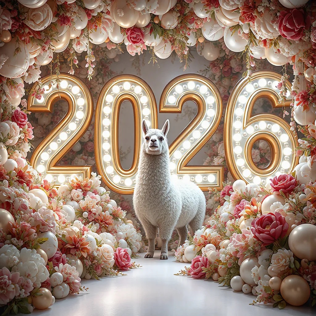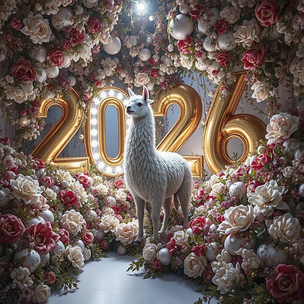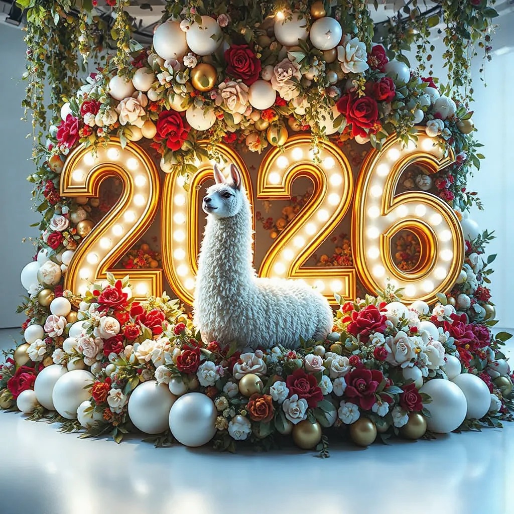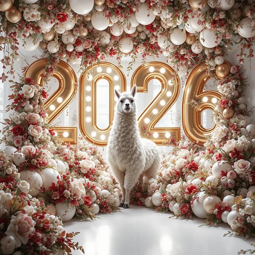 PROMPT: [SUBJECT] is centrally positioned, nestled within and surrounded by a sweeping, immersive balloon art installation for “2026”. Large marquee numbers “2026” with **brilliant, clean white LED lights** form the backdrop. The scene is rich with enormous, sculpted balloon flowers and organic garlands that curve around the subject, creating depth. The layout is sprawling and curated, abundant but **not chaotic or cluttered**, allowing space between elements. Color palette: metallic bronze/gold, vibrant red, and pearlescent white. Textures include highly reflective chrome and matte finishes. Overall atmosphere is bright, airy, with **high-key studio lighting** filling the entire clean white space. 8k resolution