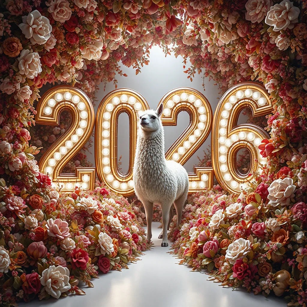 A white llama is centrally positioned, nestled within and surrounded by a sweeping, immersive balloon art installation for “2026”. Large marquee numbers “2026” with **brilliant, clean white LED lights** form the backdrop. The scene is rich with enormous, sculpted balloon flowers and organic garlands that curve around the subject, creating depth. The layout is sprawling and curated, abundant but **not chaotic or cluttered**, allowing space between elements. Color palette: metallic bronze/gold, vibrant red, and pearlescent white. Textures include highly reflective chrome and matte finishes. Overall atmosphere is bright, airy, with **high-key studio lighting** filling the entire clean white space. 8k resolution