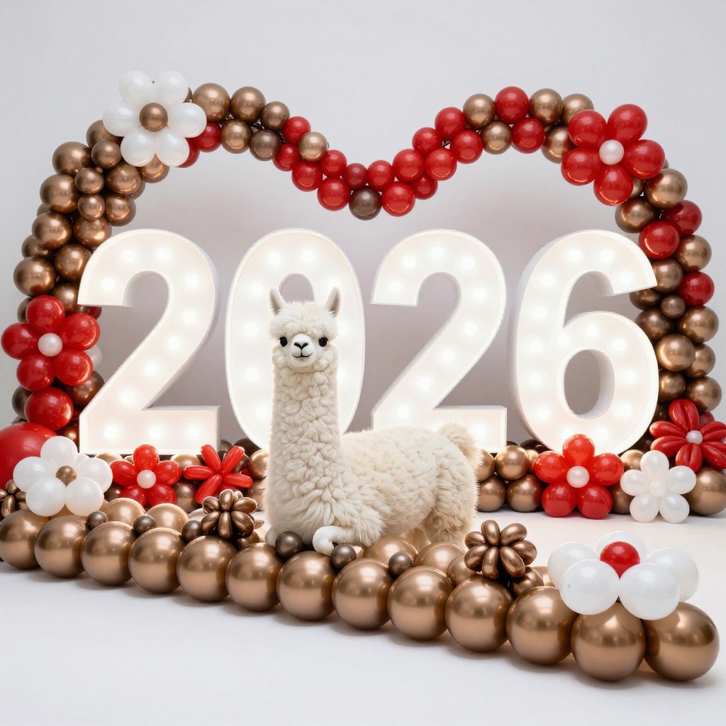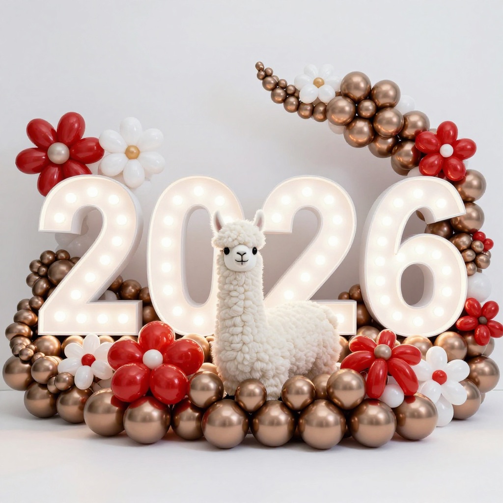 PROMPT: [SUBJECT] is centrally positioned, nestled within and surrounded by a sweeping, immersive balloon art installation for “2026”. Large marquee numbers “2026” with **brilliant, clean white LED lights** form the backdrop. The scene is rich with enormous, sculpted balloon flowers and organic garlands that curve around the subject, creating depth. The layout is sprawling and curated, abundant but **not chaotic or cluttered**, allowing space between elements. Color palette: metallic bronze/gold, vibrant red, and pearlescent white. Textures include highly reflective chrome and matte finishes. Overall atmosphere is bright, airy, with **high-key studio lighting** filling the entire clean white space. 8k resolution