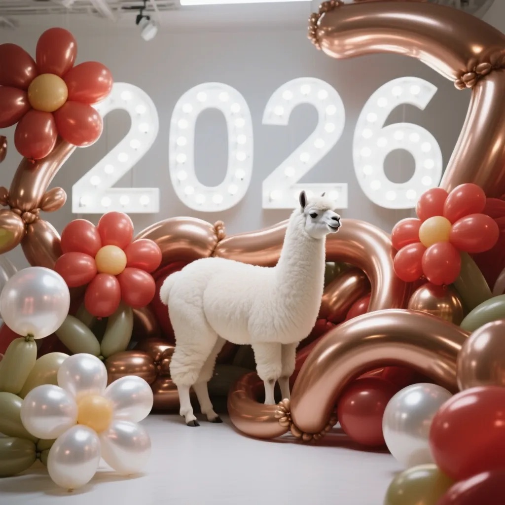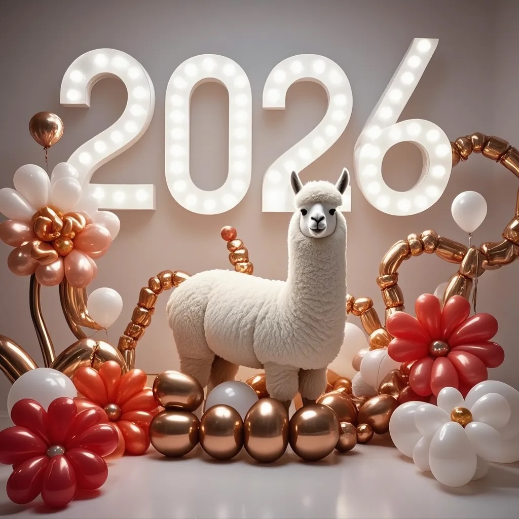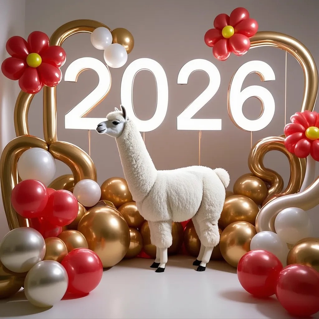 PROMPT: [SUBJECT] is centrally positioned, nestled within and surrounded by a sweeping, immersive balloon art installation for “2026”. Large marquee numbers “2026” with **brilliant, clean white LED lights** form the backdrop. The scene is rich with enormous, sculpted balloon flowers and organic garlands that curve around the subject, creating depth. The layout is sprawling and curated, abundant but **not chaotic or cluttered**, allowing space between elements. Color palette: metallic bronze/gold, vibrant red, and pearlescent white. Textures include highly reflective chrome and matte finishes. Overall atmosphere is bright, airy, with **high-key studio lighting** filling the entire clean white space. 8k resolution