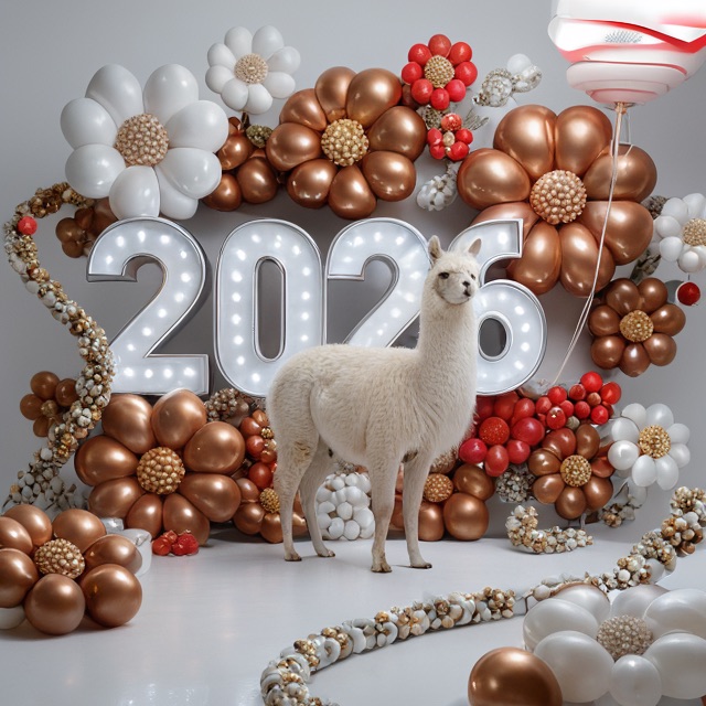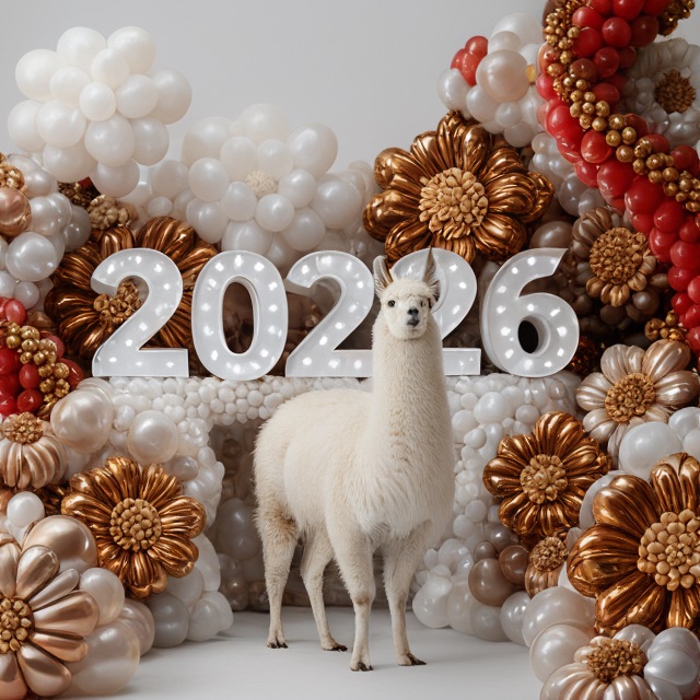 PROMPT: [SUBJECT] is centrally positioned, nestled within and surrounded by a sweeping, immersive balloon art installation for “2026”. Large marquee numbers “2026” with **brilliant, clean white LED lights** form the backdrop. The scene is rich with enormous, sculpted balloon flowers and organic garlands that curve around the subject, creating depth. The layout is sprawling and curated, abundant but **not chaotic or cluttered**, allowing space between elements. Color palette: metallic bronze/gold, vibrant red, and pearlescent white. Textures include highly reflective chrome and matte finishes. Overall atmosphere is bright, airy, with **high-key studio lighting** filling the entire clean white space. 8k resolution