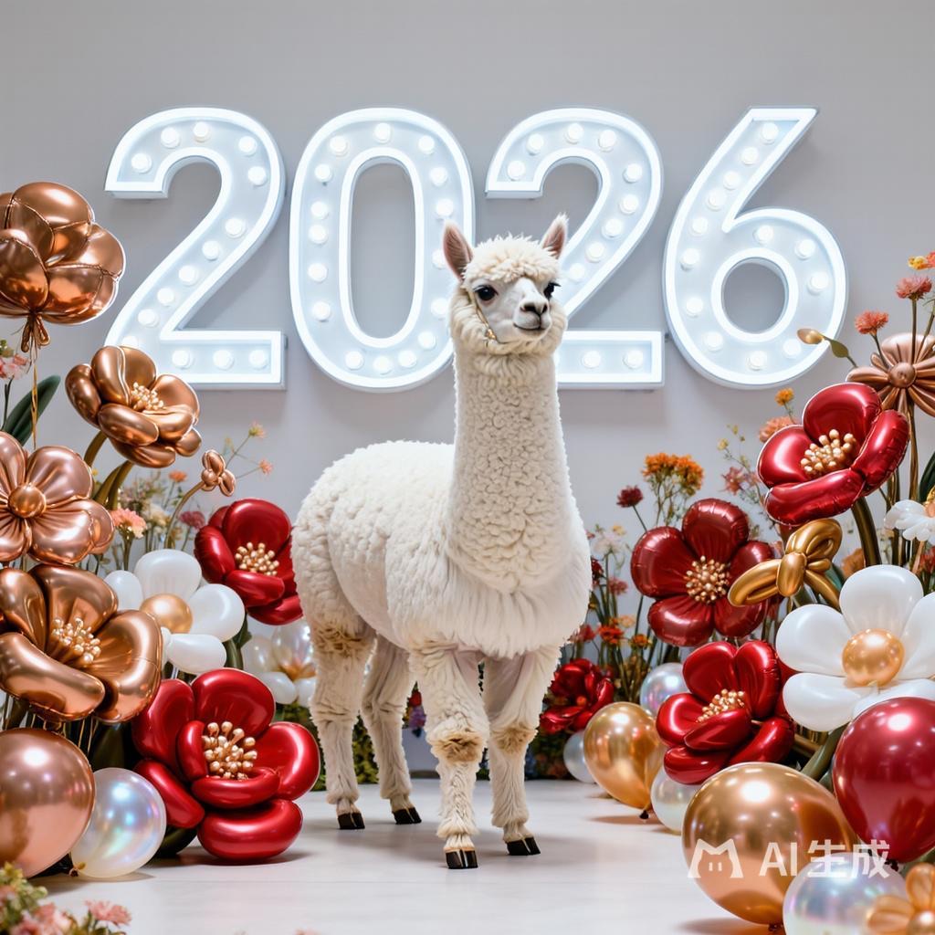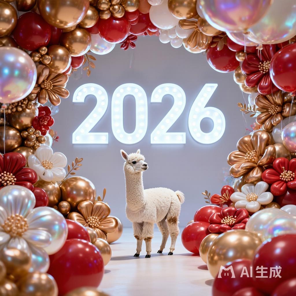 A white llama is centrally positioned, nestled within and surrounded by a sweeping, immersive balloon art installation for “2026”. Large marquee numbers “2026” with **brilliant, clean white LED lights** form the backdrop. The scene is rich with enormous, sculpted balloon flowers and organic garlands that curve around the subject, creating depth. The layout is sprawling and curated, abundant but **not chaotic or cluttered**, allowing space between elements. Color palette: metallic bronze/gold, vibrant red, and pearlescent white. Textures include highly reflective chrome and matte finishes. Overall atmosphere is bright, airy, with **high-key studio lighting** filling the entire clean white space. 8k resolution