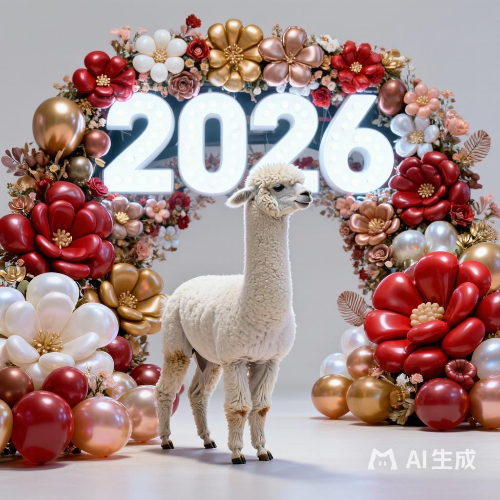 PROMPT: [SUBJECT] is centrally positioned, nestled within and surrounded by a sweeping, immersive balloon art installation for “2026”. Large marquee numbers “2026” with **brilliant, clean white LED lights** form the backdrop. The scene is rich with enormous, sculpted balloon flowers and organic garlands that curve around the subject, creating depth. The layout is sprawling and curated, abundant but **not chaotic or cluttered**, allowing space between elements. Color palette: metallic bronze/gold, vibrant red, and pearlescent white. Textures include highly reflective chrome and matte finishes. Overall atmosphere is bright, airy, with **high-key studio lighting** filling the entire clean white space. 8k resolution