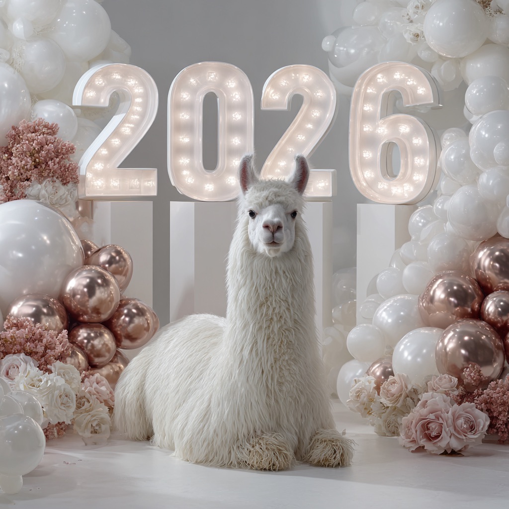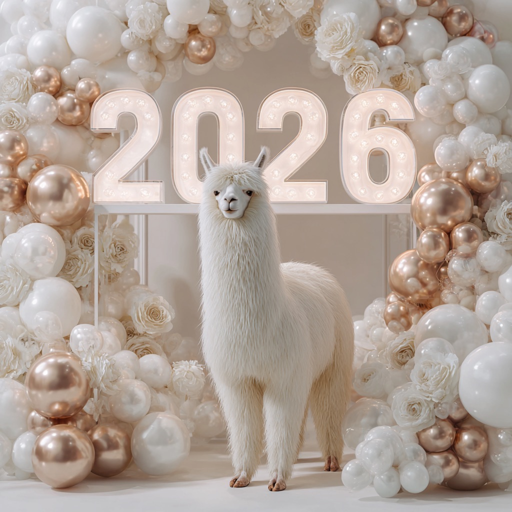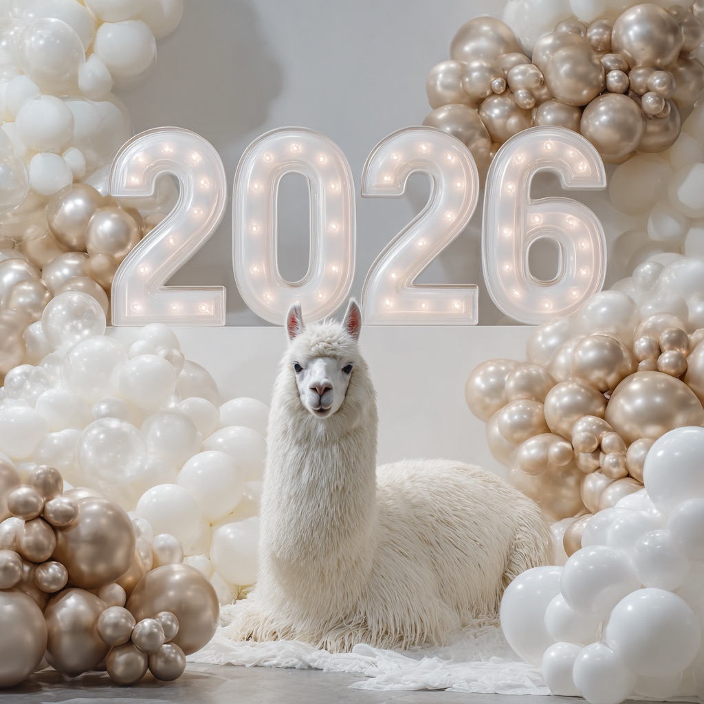 PROMPT: [SUBJECT] is centrally positioned, nestled within and surrounded by a sweeping, immersive balloon art installation for “2026”. Large marquee numbers “2026” with **brilliant, clean white LED lights** form the backdrop. The scene is rich with enormous, sculpted balloon flowers and organic garlands that curve around the subject, creating depth. The layout is sprawling and curated, abundant but **not chaotic or cluttered**, allowing space between elements. Color palette: metallic bronze/gold, vibrant red, and pearlescent white. Textures include highly reflective chrome and matte finishes. Overall atmosphere is bright, airy, with **high-key studio lighting** filling the entire clean white space. 8k resolution