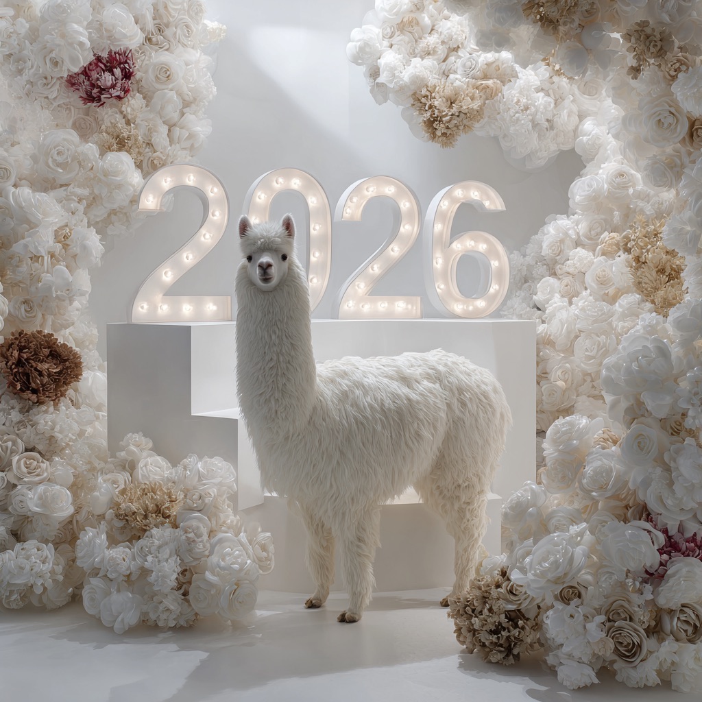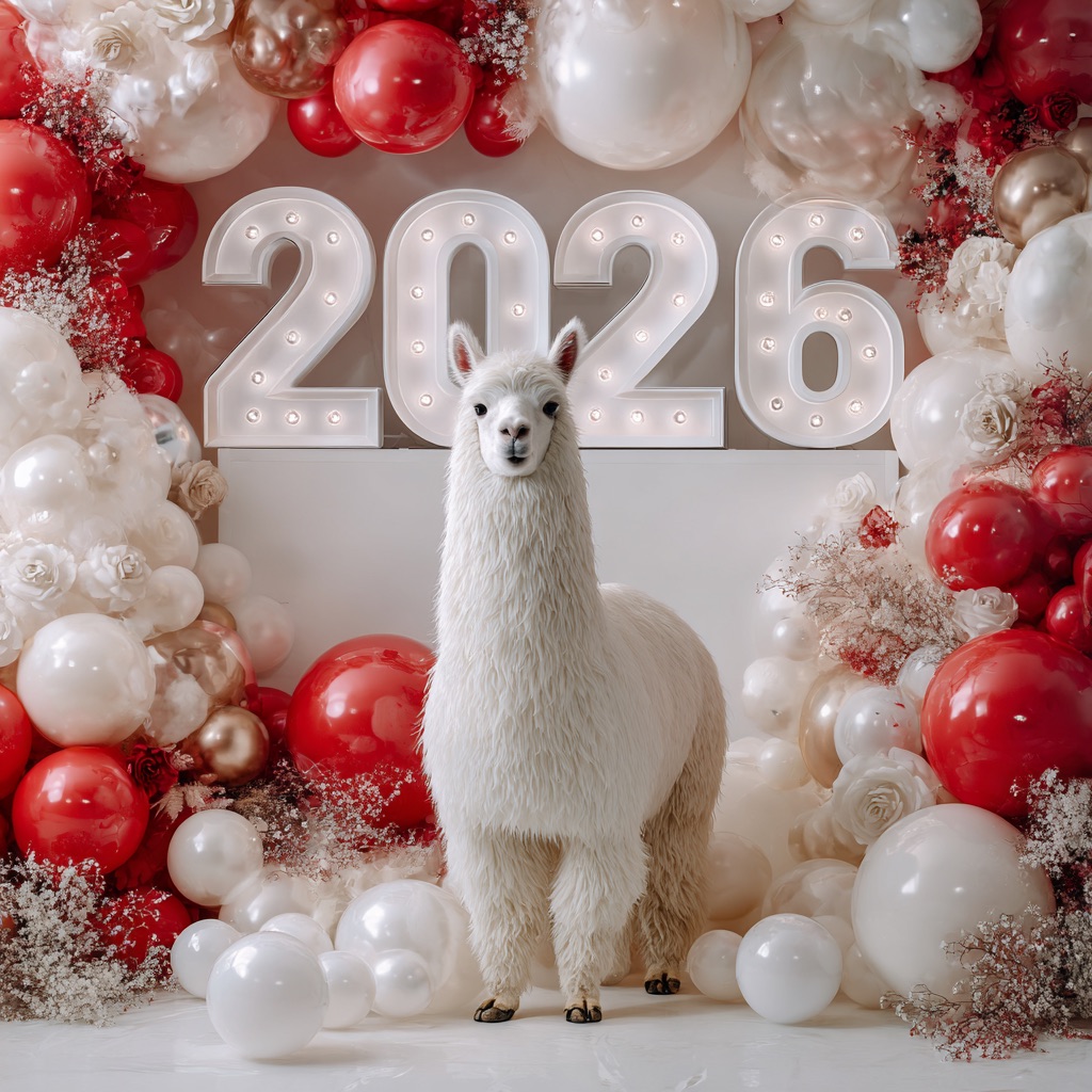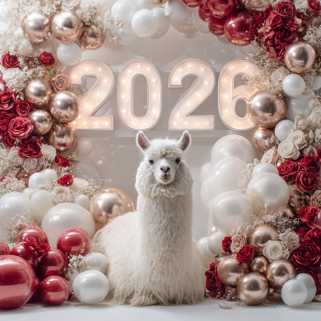 A white llama is centrally positioned, nestled within and surrounded by a sweeping, immersive balloon art installation for “2026”. Large marquee numbers “2026” with **brilliant, clean white LED lights** form the backdrop. The scene is rich with enormous, sculpted balloon flowers and organic garlands that curve around the subject, creating depth. The layout is sprawling and curated, abundant but **not chaotic or cluttered**, allowing space between elements. Color palette: metallic bronze/gold, vibrant red, and pearlescent white. Textures include highly reflective chrome and matte finishes. Overall atmosphere is bright, airy, with **high-key studio lighting** filling the entire clean white space. 8k resolution