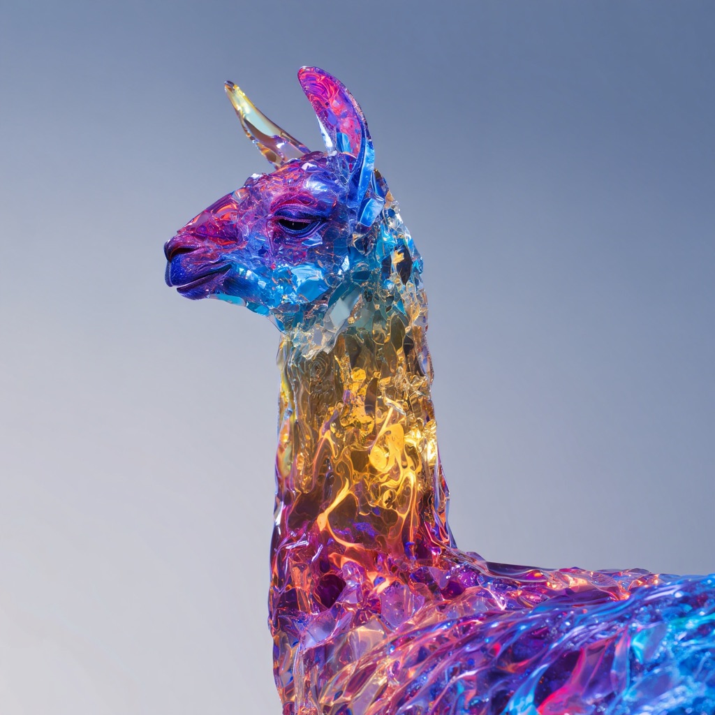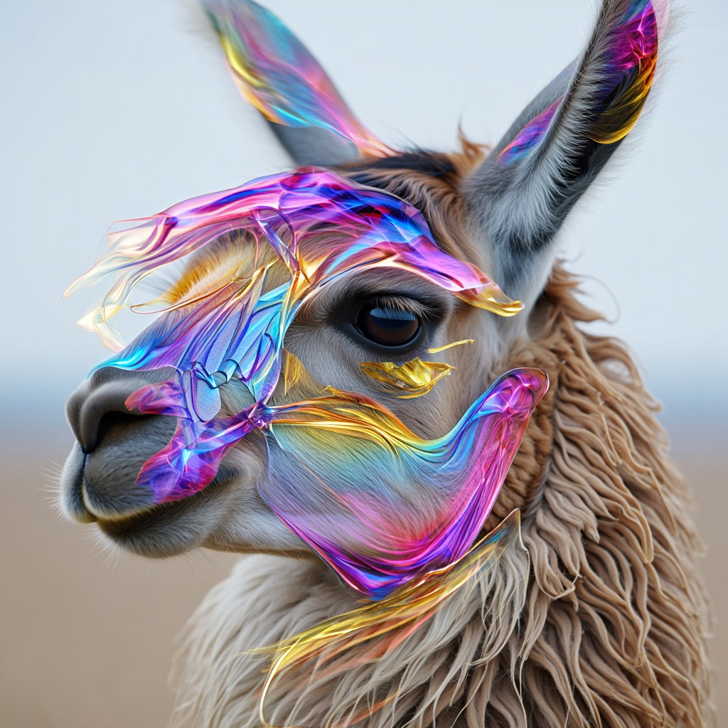 A stunning, high-detail photograph of llama partially formed from and encased in a flowing, iridescent substance that is both crystalline and fiery. This translucent material refracts light into a spectrum of colors—electric blues, magentas, golds, and purples—creating abstract, swirling patterns that radiate an internal glow. The effect is like molten glass or magical, frozen flames enveloping the form. The background is a clean, soft gradient of muted grey-blue, emphasizing the vibrant subject. Cinematic lighting, macro details, ethereal atmosphere.
