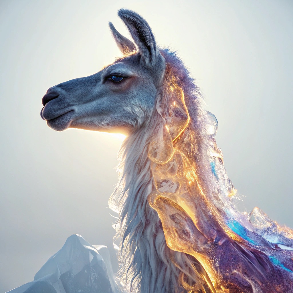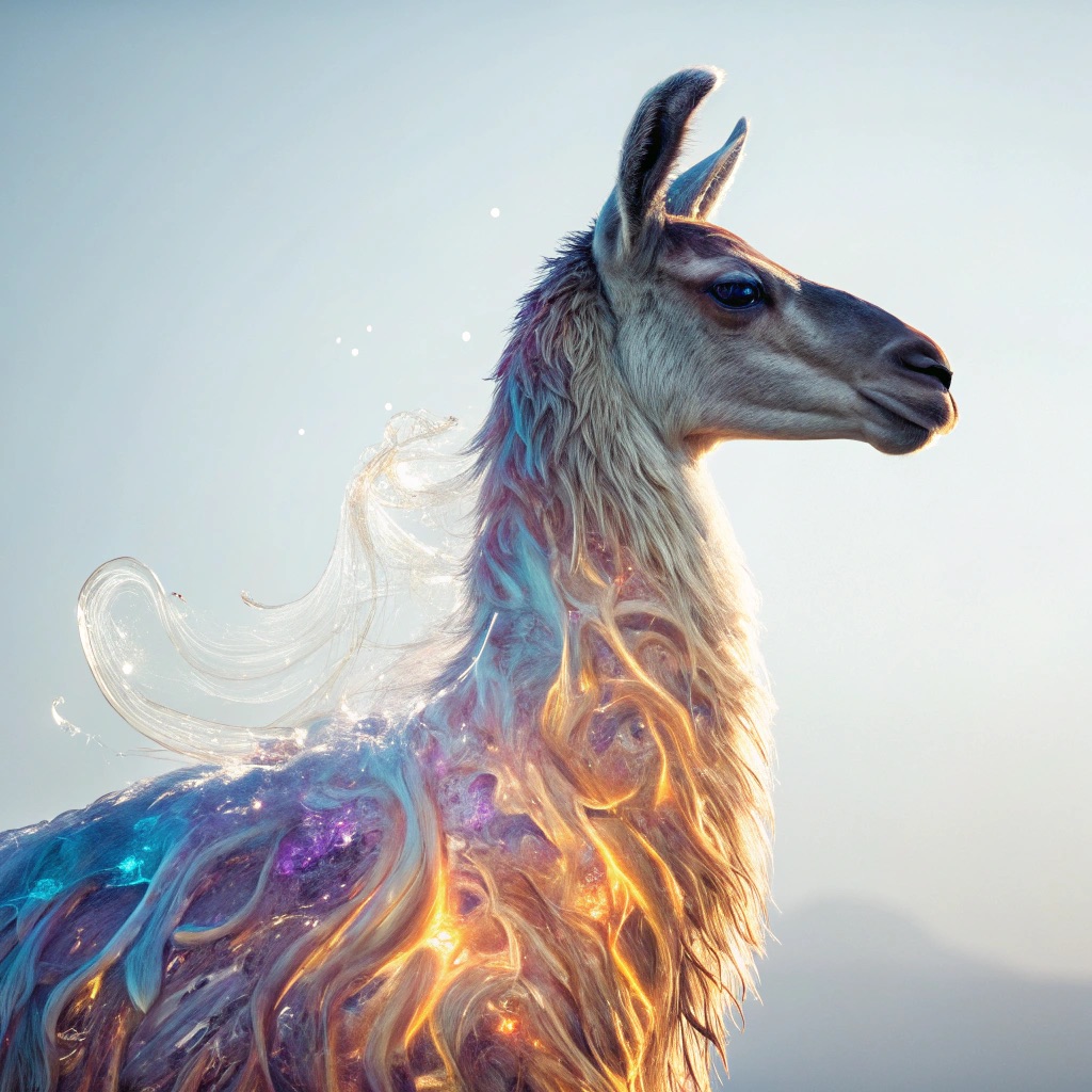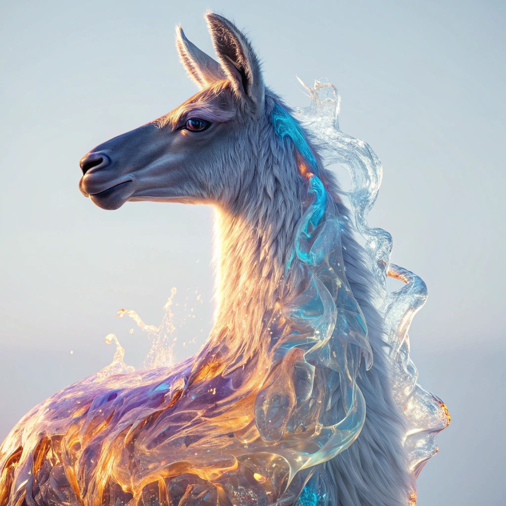 A stunning, high-detail photograph of llama partially formed from and encased in a flowing, iridescent substance that is both crystalline and fiery. This translucent material refracts light into a spectrum of colors—electric blues, magentas, golds, and purples—creating abstract, swirling patterns that radiate an internal glow. The effect is like molten glass or magical, frozen flames enveloping the form. The background is a clean, soft gradient of muted grey-blue, emphasizing the vibrant subject. Cinematic lighting, macro details, ethereal atmosphere.