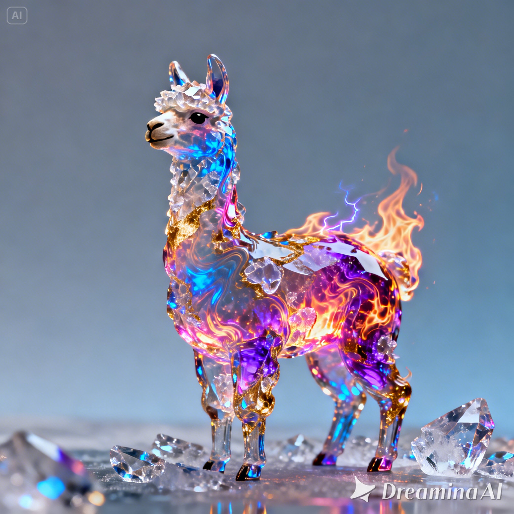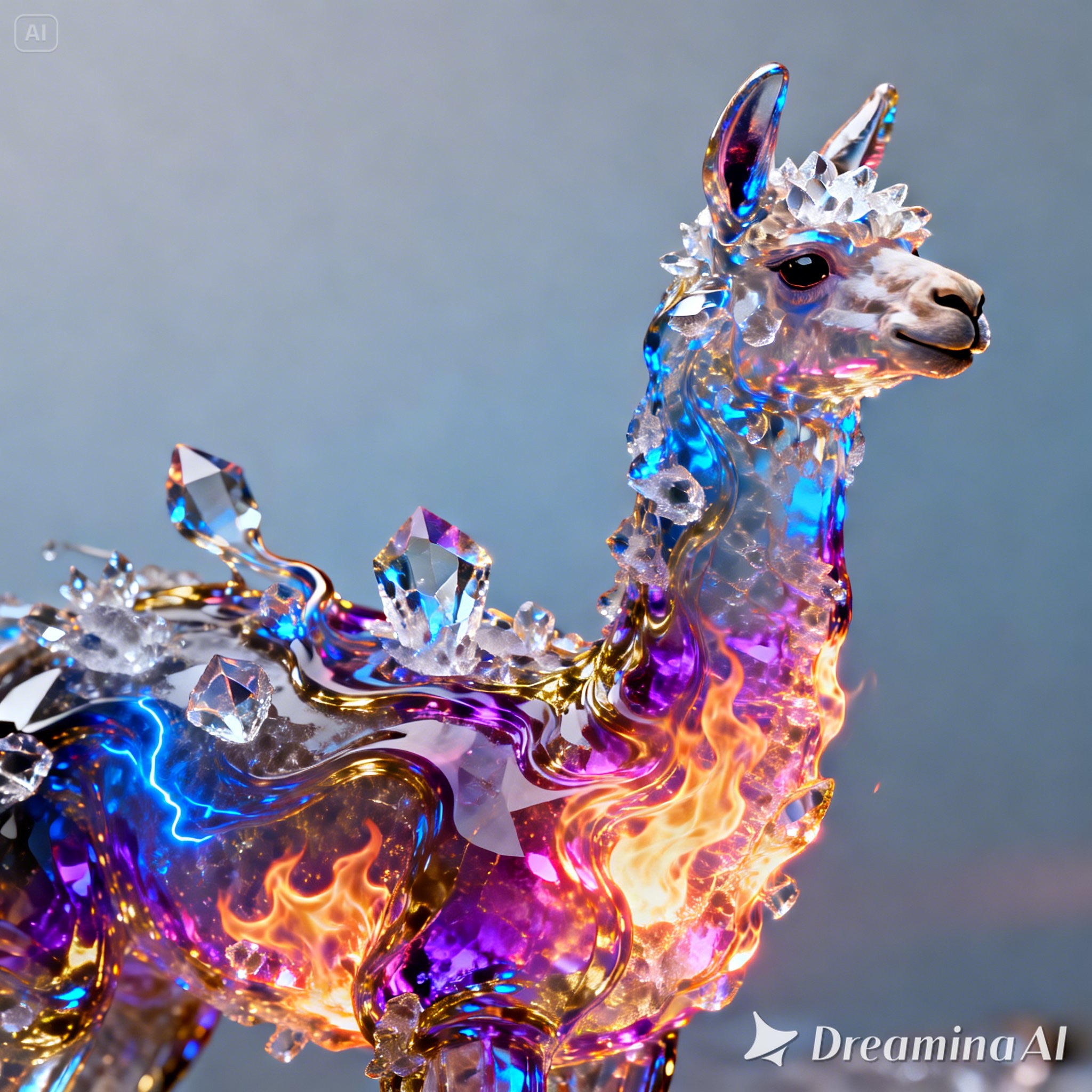 A stunning, high-detail photograph of llama partially formed from and encased in a flowing, iridescent substance that is both crystalline and fiery. This translucent material refracts light into a spectrum of colors—electric blues, magentas, golds, and purples—creating abstract, swirling patterns that radiate an internal glow. The effect is like molten glass or magical, frozen flames enveloping the form. The background is a clean, soft gradient of muted grey-blue, emphasizing the vibrant subject. Cinematic lighting, macro details, ethereal atmosphere.