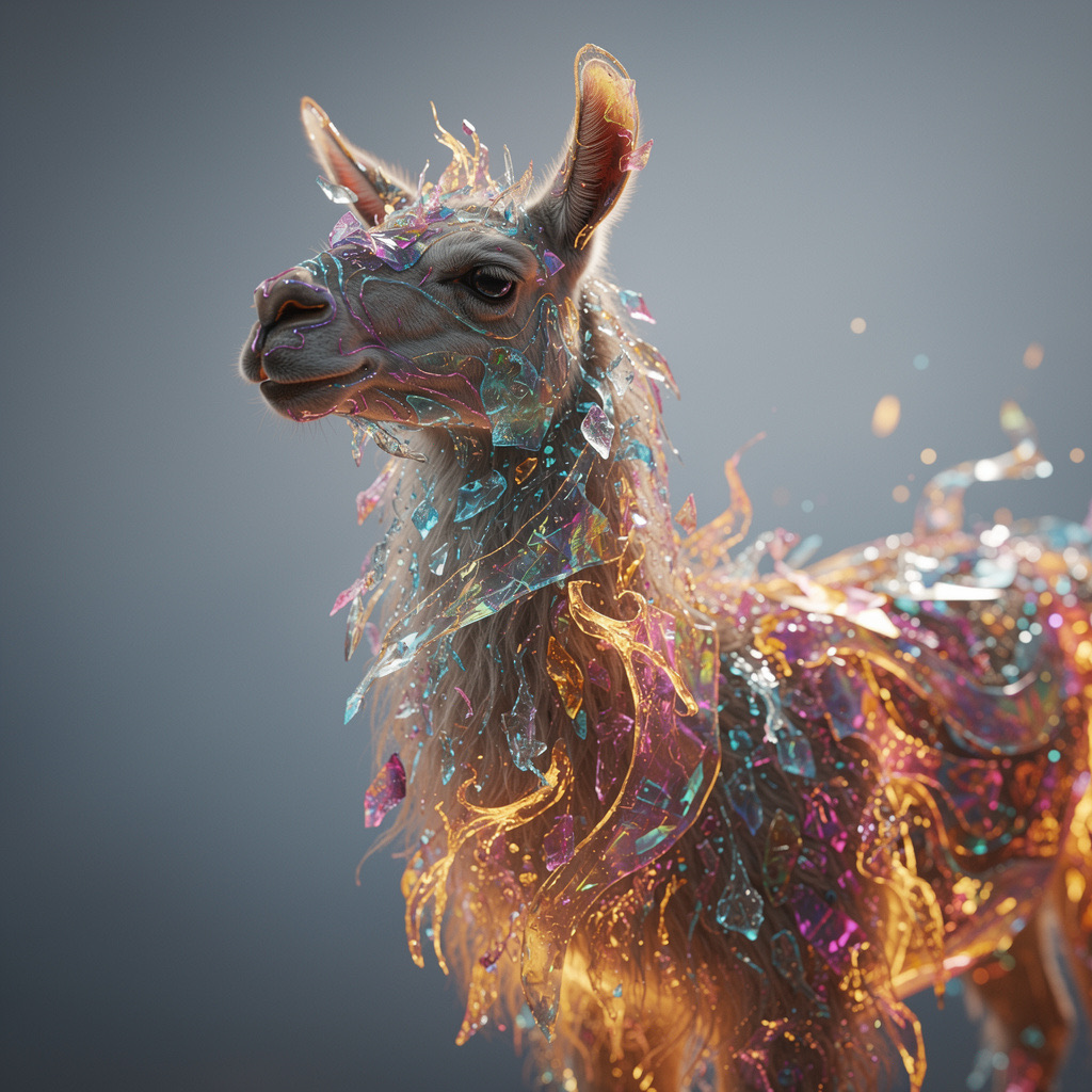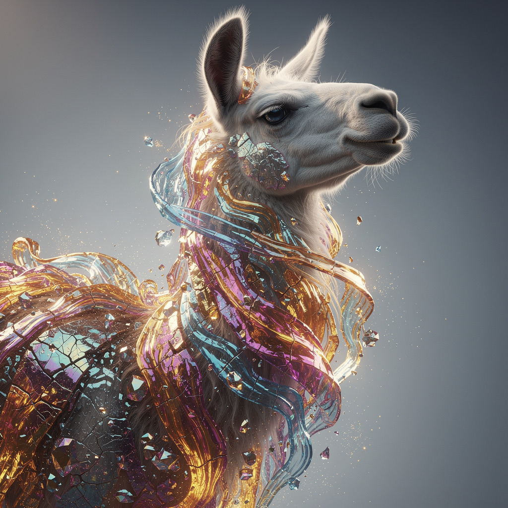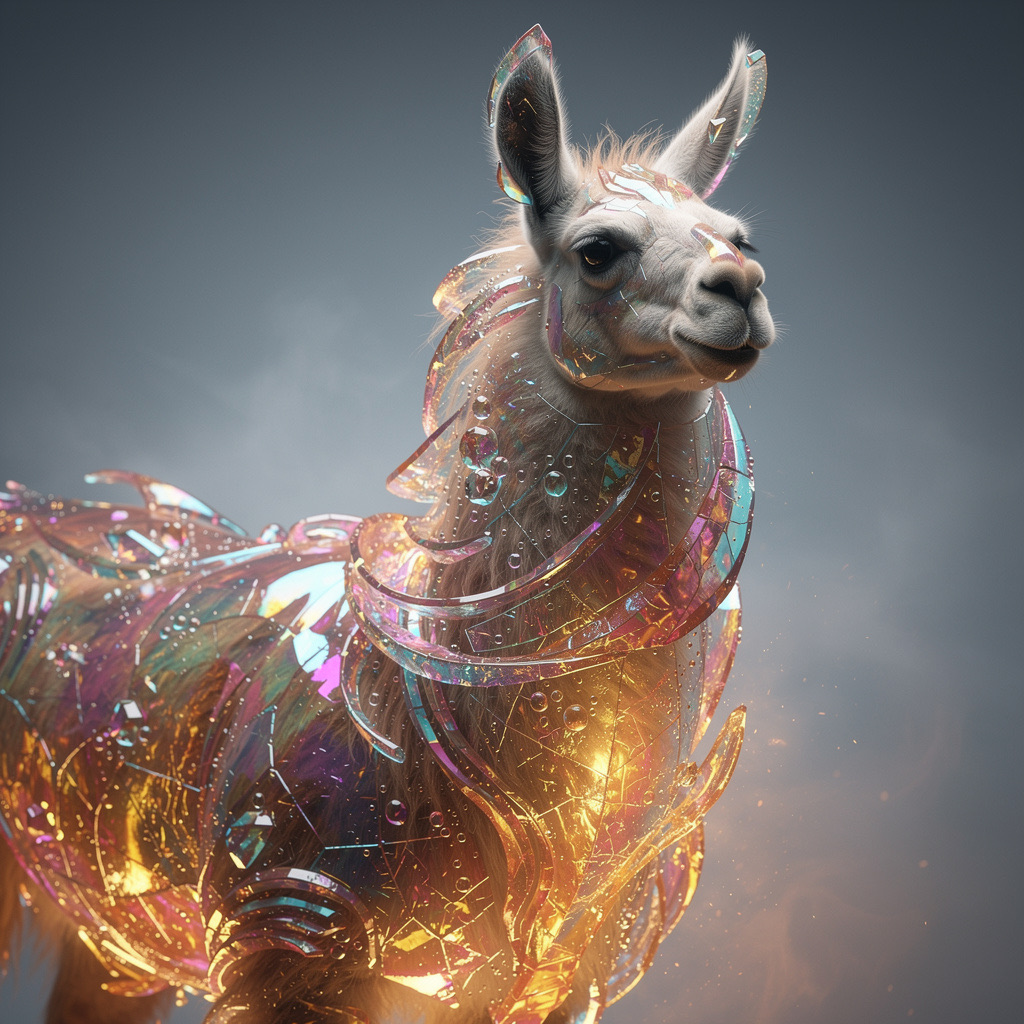 A stunning, high-detail photograph of llama partially formed from and encased in a flowing, iridescent substance that is both crystalline and fiery. This translucent material refracts light into a spectrum of colors—electric blues, magentas, golds, and purples—creating abstract, swirling patterns that radiate an internal glow. The effect is like molten glass or magical, frozen flames enveloping the form. The background is a clean, soft gradient of muted grey-blue, emphasizing the vibrant subject. Cinematic lighting, macro details, ethereal atmosphere.