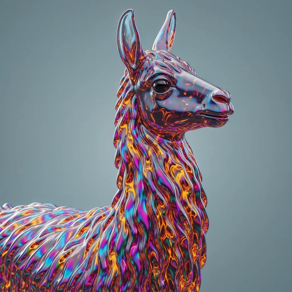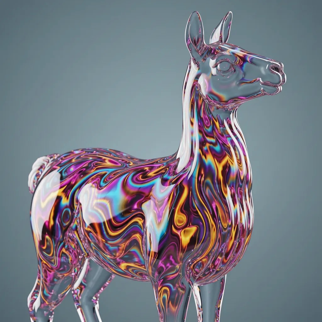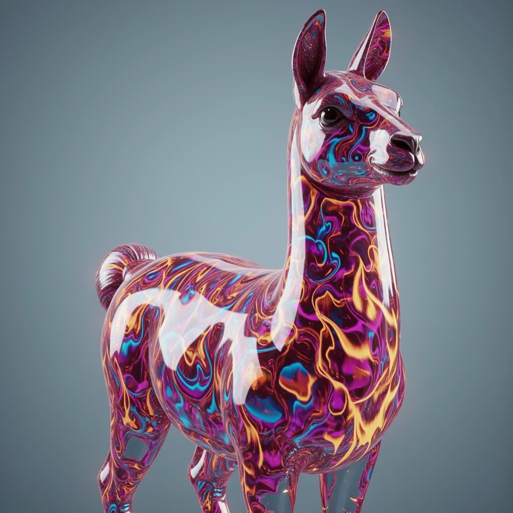 A stunning, high-detail photograph of llama partially formed from and encased in a flowing, iridescent substance that is both crystalline and fiery. This translucent material refracts light into a spectrum of colors—electric blues, magentas, golds, and purples—creating abstract, swirling patterns that radiate an internal glow. The effect is like molten glass or magical, frozen flames enveloping the form. The background is a clean, soft gradient of muted grey-blue, emphasizing the vibrant subject. Cinematic lighting, macro details, ethereal atmosphere.
