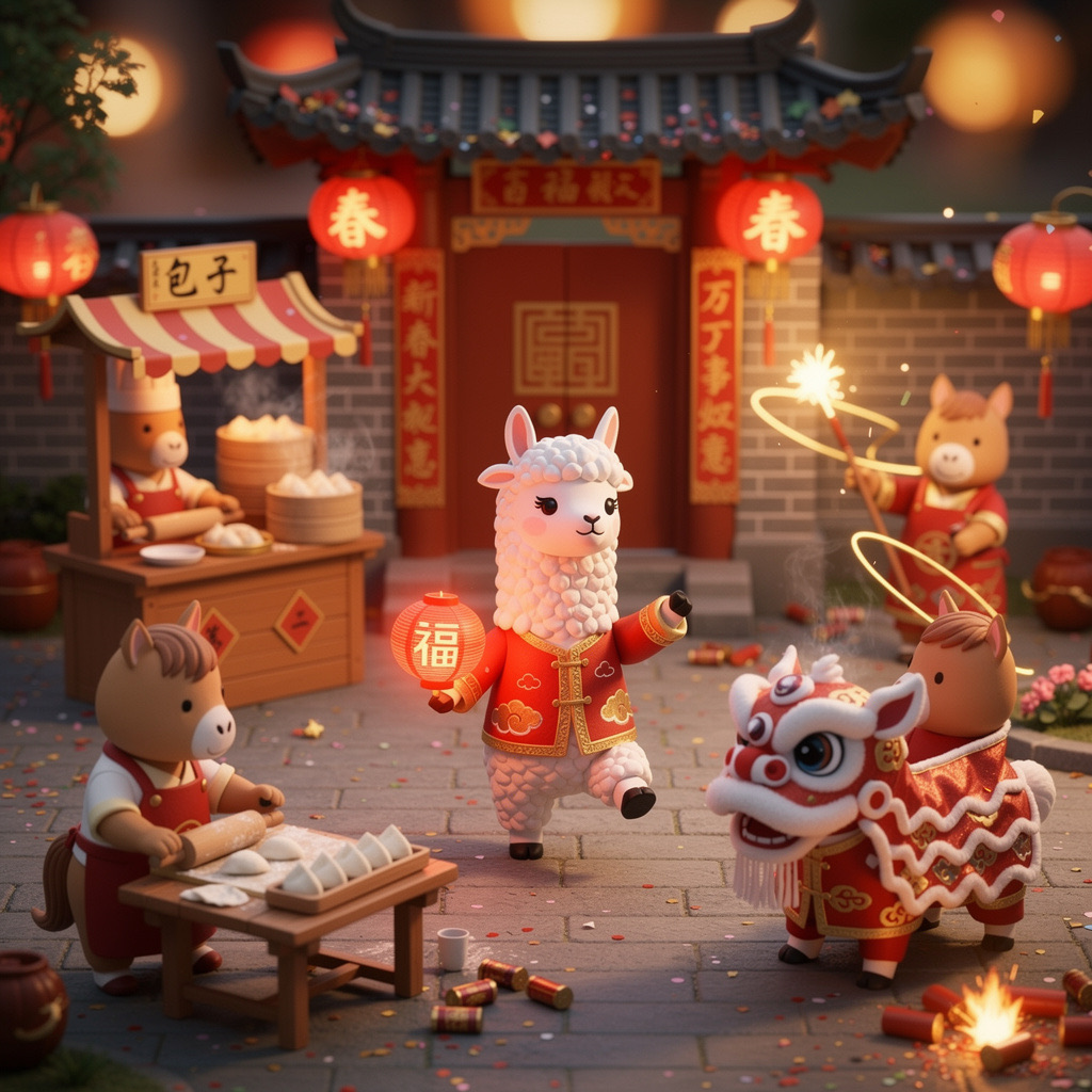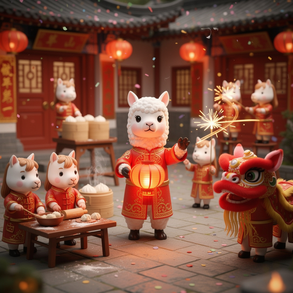 PROMPT: Cute Popmart-style 3D miniature [festival] courtyard, natural candid moment, no posing, no one looking at camera. An adorable anthropomorphic [SUBJECT1] in red traditional clothing stands at the center, holding a glowing lantern and gently greeting. Around it, super cute Popmart-style [SUBJECT2] are naturally busy with their own activities: making dumplings, serving steaming baozi, playing sparklers, performing lion dance, hanging lanterns not looking at the llama.Warm lantern light, soft confetti and smoke, asymmetrical lively composition, shallow depth, tilt-shift, ultra-detailed soft clay toy texture, vivid red and gold, cinematic Octane render, joyful natural atmosphere