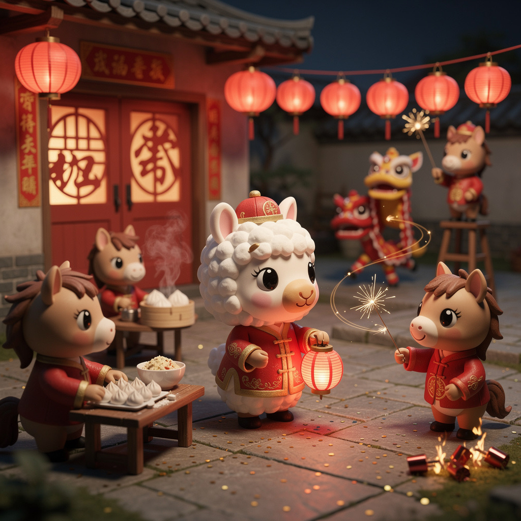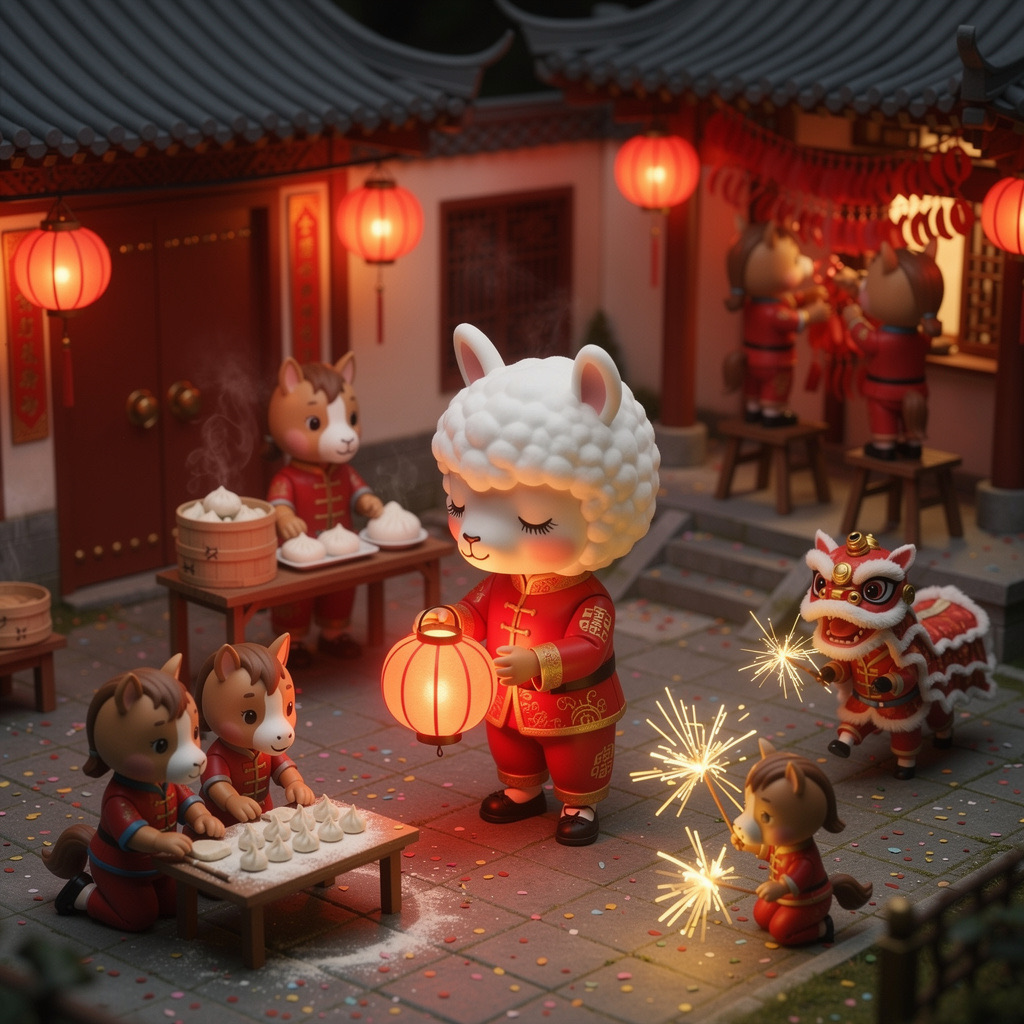 Cute Popmart-style 3D miniature Chinese New Year courtyard, natural candid moment, no posing, no one looking at camera. An adorable anthropomorphic white llama in red traditional clothing stands at the center, holding a glowing lantern and gently greeting. Around it, super cute Popmart-style horses are naturally busy with their own activities: making dumplings, serving steaming baozi, playing sparklers, performing lion dance, hanging lanterns not looking at the llama.Warm lantern light, soft confetti and smoke, asymmetrical lively composition, shallow depth, tilt-shift, ultra-detailed soft clay toy texture, vivid red and gold, cinematic Octane render, joyful natural atmosphere