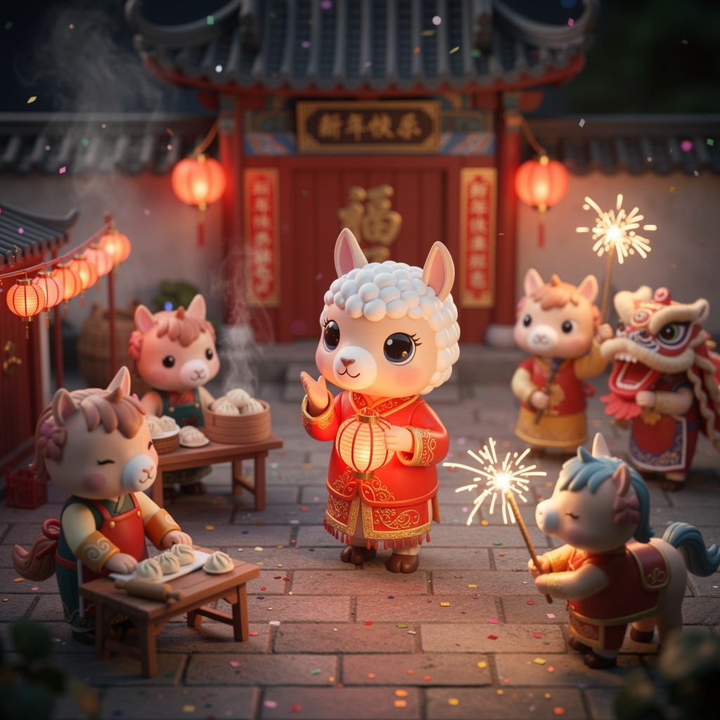 PROMPT: Cute Popmart-style 3D miniature [festival] courtyard, natural candid moment, no posing, no one looking at camera. An adorable anthropomorphic [SUBJECT1] in red traditional clothing stands at the center, holding a glowing lantern and gently greeting. Around it, super cute Popmart-style [SUBJECT2] are naturally busy with their own activities: making dumplings, serving steaming baozi, playing sparklers, performing lion dance, hanging lanterns not looking at the llama.Warm lantern light, soft confetti and smoke, asymmetrical lively composition, shallow depth, tilt-shift, ultra-detailed soft clay toy texture, vivid red and gold, cinematic Octane render, joyful natural atmosphere