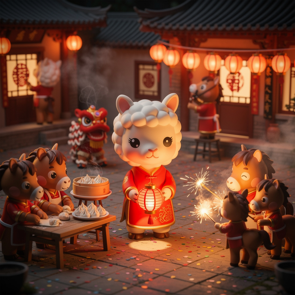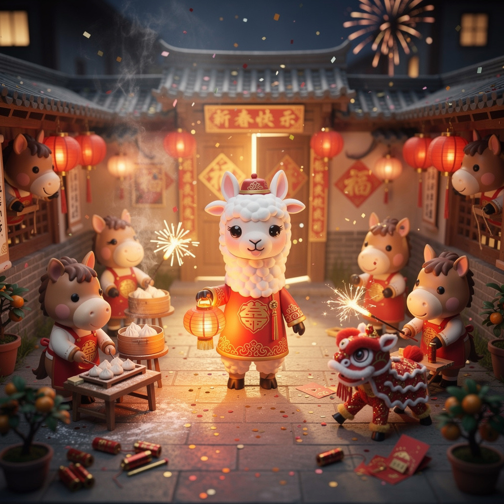 Cute Popmart-style 3D miniature Chinese New Year courtyard, natural candid moment, no posing, no one looking at camera. An adorable anthropomorphic white llama in red traditional clothing stands at the center, holding a glowing lantern and gently greeting. Around it, super cute Popmart-style horses are naturally busy with their own activities: making dumplings, serving steaming baozi, playing sparklers, performing lion dance, hanging lanterns not looking at the llama.Warm lantern light, soft confetti and smoke, asymmetrical lively composition, shallow depth, tilt-shift, ultra-detailed soft clay toy texture, vivid red and gold, cinematic Octane render, joyful natural atmosphere