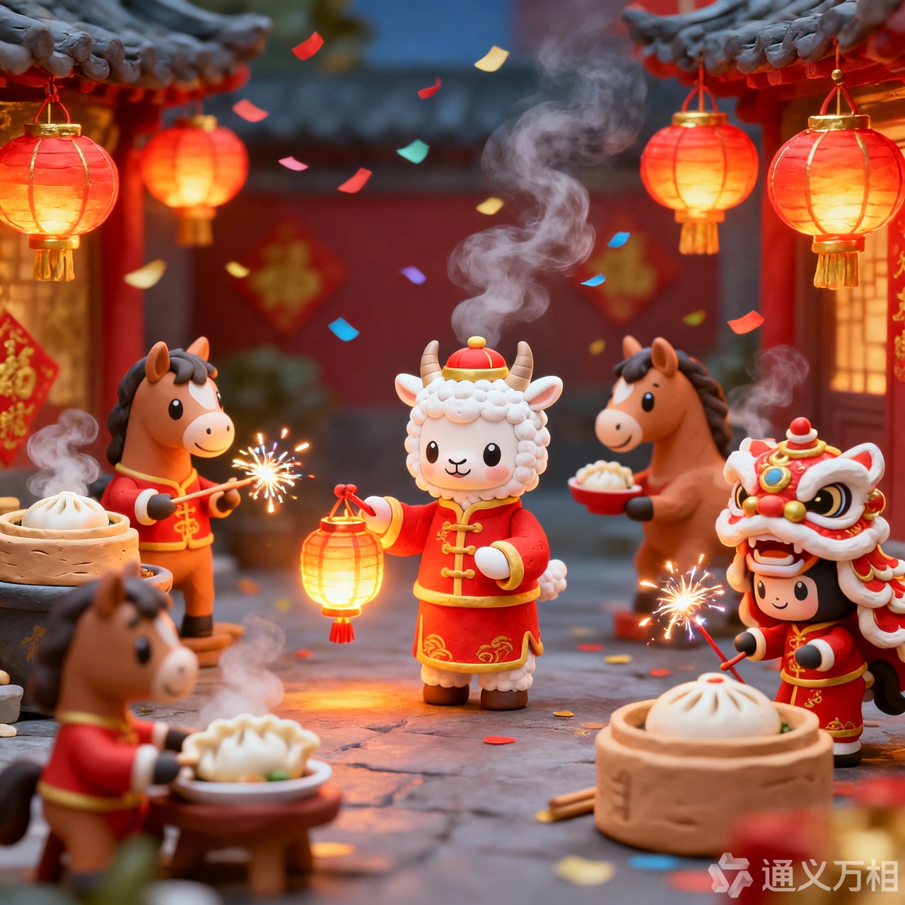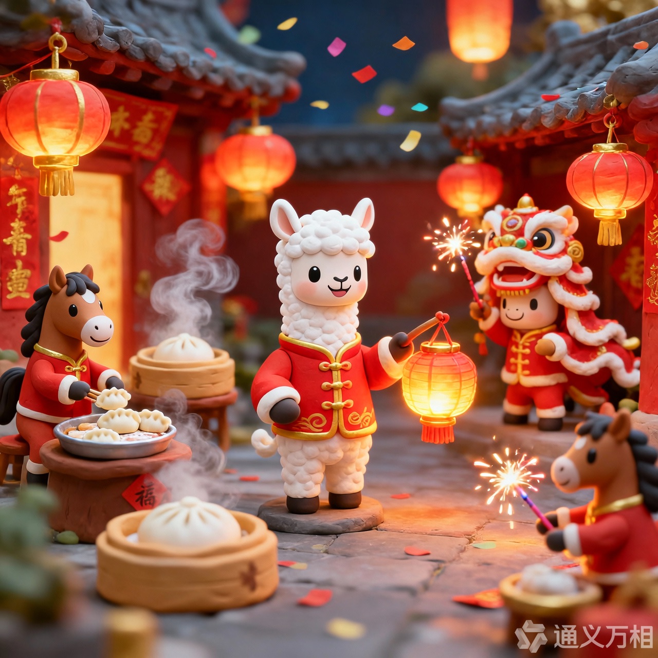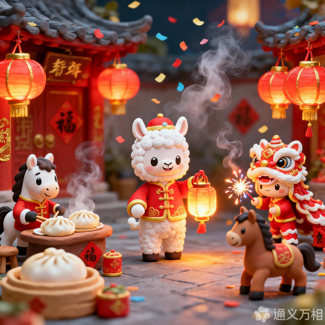 PROMPT: Cute Popmart-style 3D miniature [festival] courtyard, natural candid moment, no posing, no one looking at camera. An adorable anthropomorphic [SUBJECT1] in red traditional clothing stands at the center, holding a glowing lantern and gently greeting. Around it, super cute Popmart-style [SUBJECT2] are naturally busy with their own activities: making dumplings, serving steaming baozi, playing sparklers, performing lion dance, hanging lanterns not looking at the llama.Warm lantern light, soft confetti and smoke, asymmetrical lively composition, shallow depth, tilt-shift, ultra-detailed soft clay toy texture, vivid red and gold, cinematic Octane render, joyful natural atmosphere