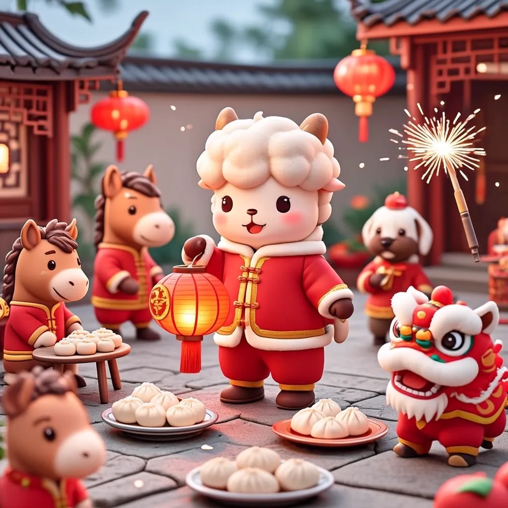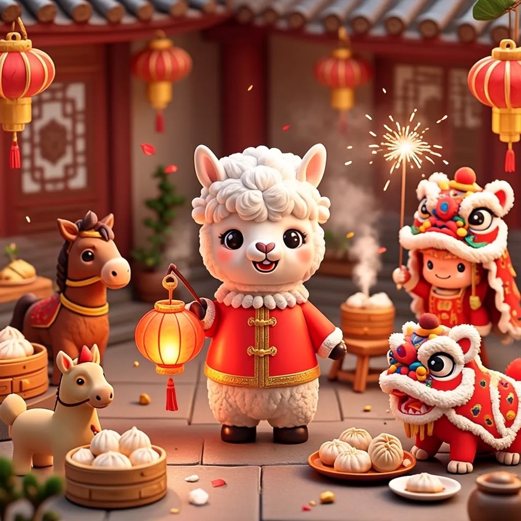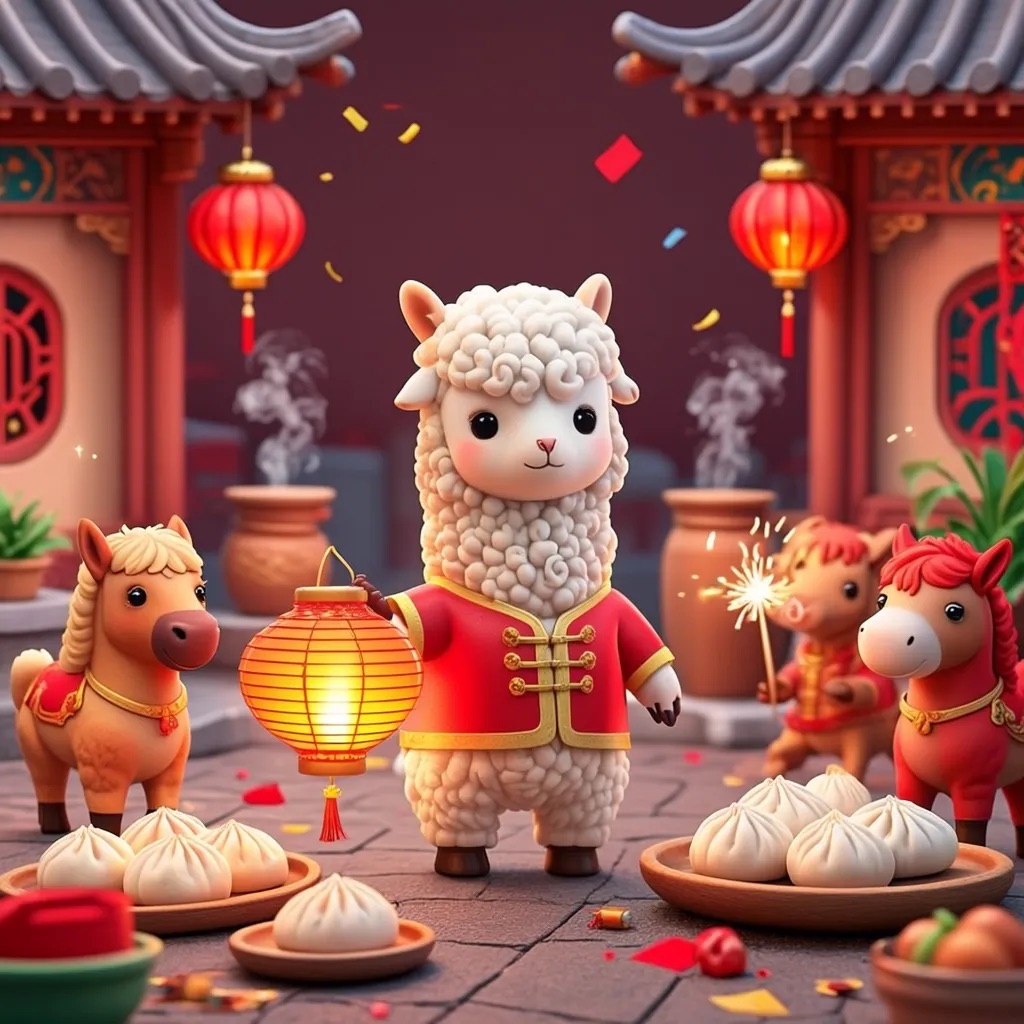 PROMPT: Cute Popmart-style 3D miniature [festival] courtyard, natural candid moment, no posing, no one looking at camera. An adorable anthropomorphic [SUBJECT1] in red traditional clothing stands at the center, holding a glowing lantern and gently greeting. Around it, super cute Popmart-style [SUBJECT2] are naturally busy with their own activities: making dumplings, serving steaming baozi, playing sparklers, performing lion dance, hanging lanterns not looking at the llama.Warm lantern light, soft confetti and smoke, asymmetrical lively composition, shallow depth, tilt-shift, ultra-detailed soft clay toy texture, vivid red and gold, cinematic Octane render, joyful natural atmosphere