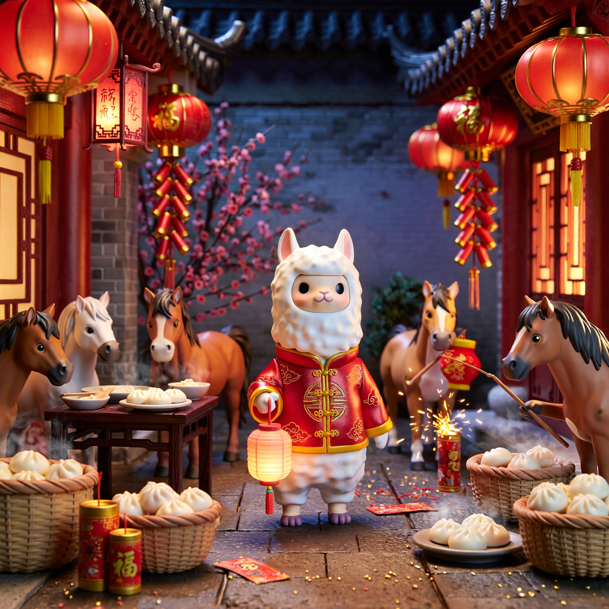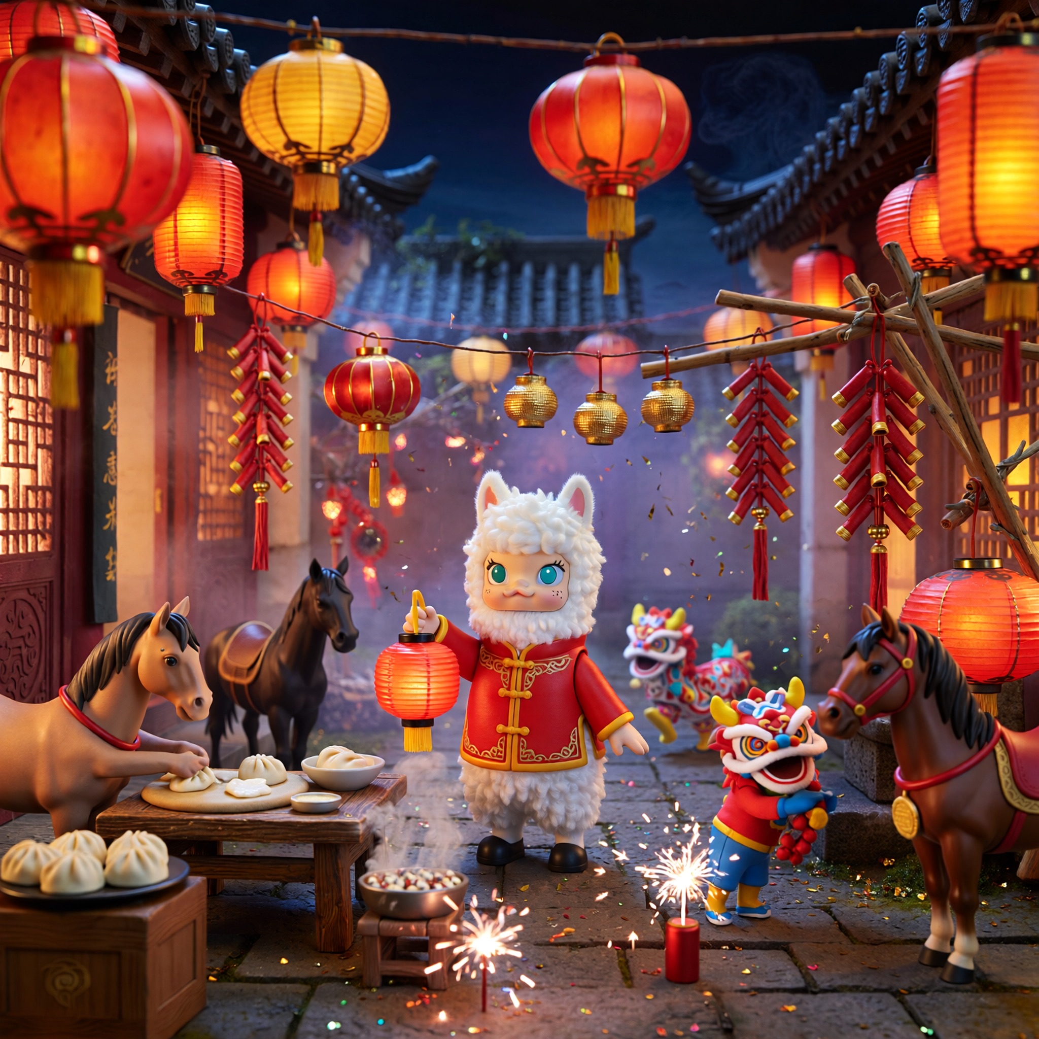 Cute Popmart-style 3D miniature Chinese New Year courtyard, natural candid moment, no posing, no one looking at camera. An adorable anthropomorphic white llama in red traditional clothing stands at the center, holding a glowing lantern and gently greeting. Around it, super cute Popmart-style horses are naturally busy with their own activities: making dumplings, serving steaming baozi, playing sparklers, performing lion dance, hanging lanterns not looking at the llama.Warm lantern light, soft confetti and smoke, asymmetrical lively composition, shallow depth, tilt-shift, ultra-detailed soft clay toy texture, vivid red and gold, cinematic Octane render, joyful natural atmosphere