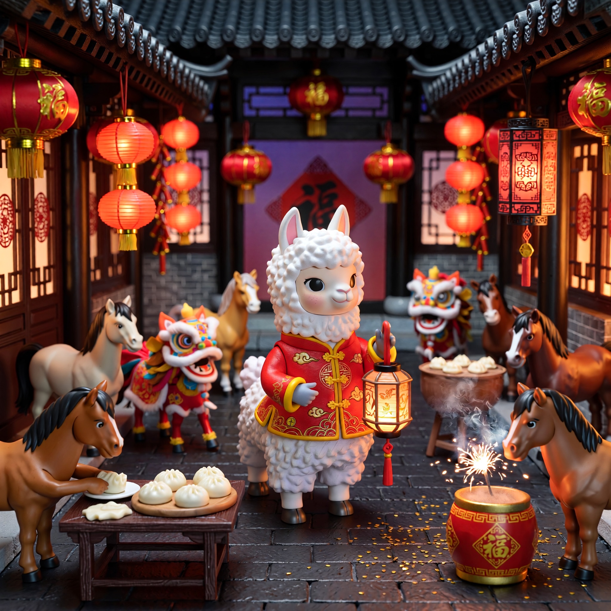 PROMPT: Cute Popmart-style 3D miniature [festival] courtyard, natural candid moment, no posing, no one looking at camera. An adorable anthropomorphic [SUBJECT1] in red traditional clothing stands at the center, holding a glowing lantern and gently greeting. Around it, super cute Popmart-style [SUBJECT2] are naturally busy with their own activities: making dumplings, serving steaming baozi, playing sparklers, performing lion dance, hanging lanterns not looking at the llama.Warm lantern light, soft confetti and smoke, asymmetrical lively composition, shallow depth, tilt-shift, ultra-detailed soft clay toy texture, vivid red and gold, cinematic Octane render, joyful natural atmosphere