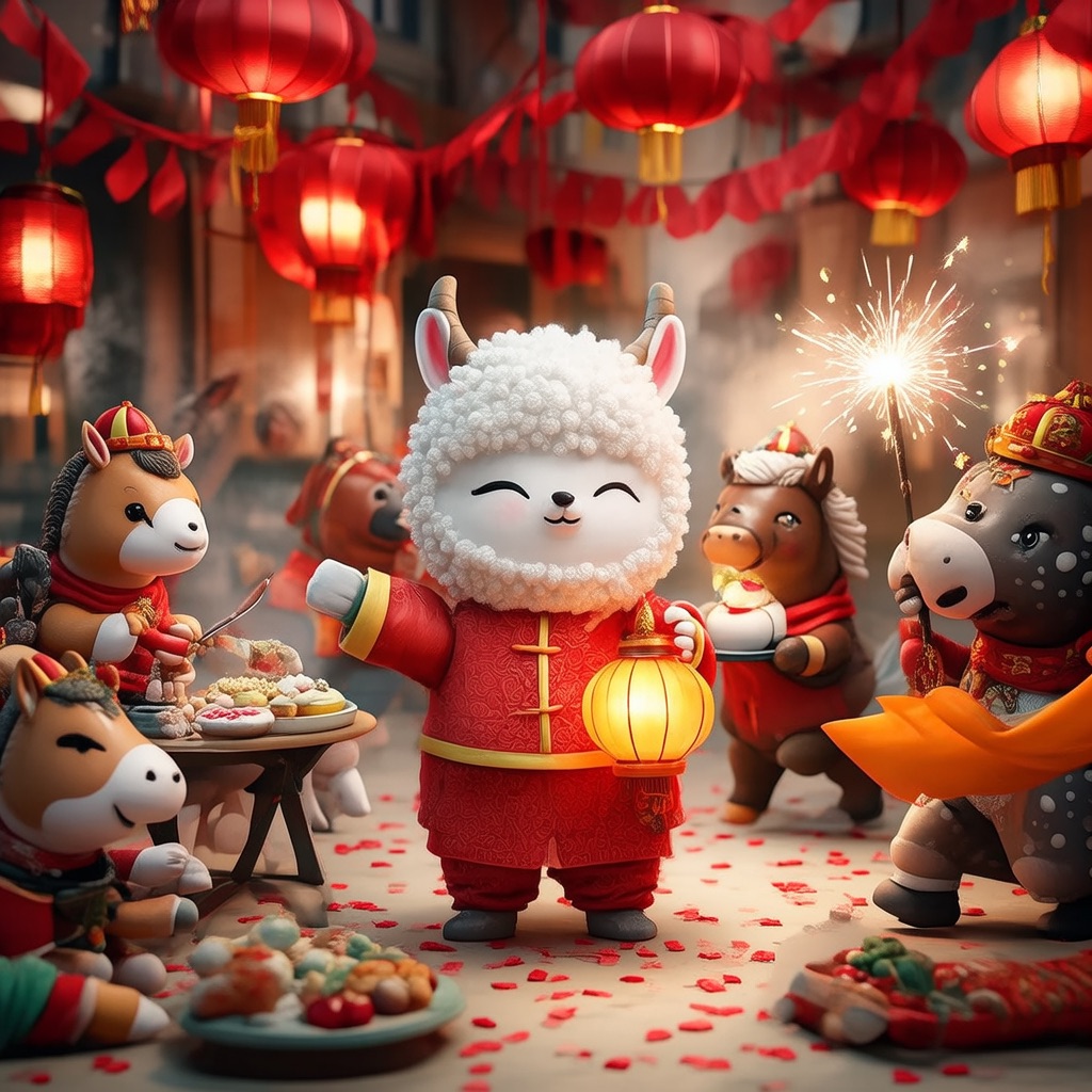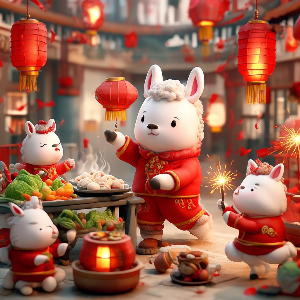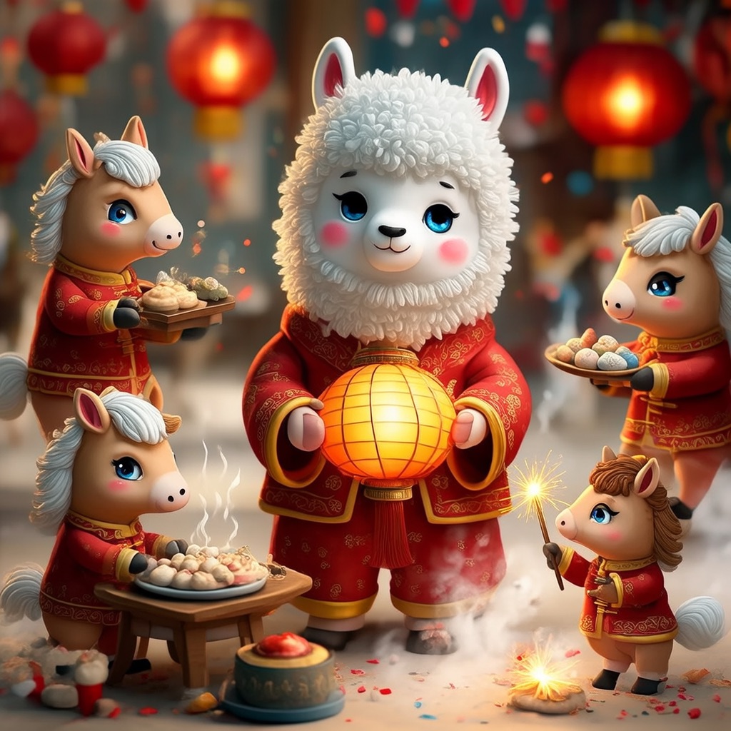 PROMPT: Cute Popmart-style 3D miniature [festival] courtyard, natural candid moment, no posing, no one looking at camera. An adorable anthropomorphic [SUBJECT1] in red traditional clothing stands at the center, holding a glowing lantern and gently greeting. Around it, super cute Popmart-style [SUBJECT2] are naturally busy with their own activities: making dumplings, serving steaming baozi, playing sparklers, performing lion dance, hanging lanterns not looking at the llama.Warm lantern light, soft confetti and smoke, asymmetrical lively composition, shallow depth, tilt-shift, ultra-detailed soft clay toy texture, vivid red and gold, cinematic Octane render, joyful natural atmosphere