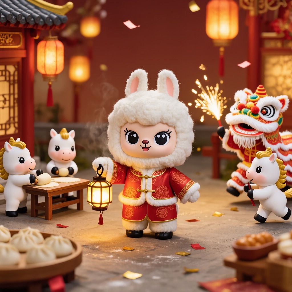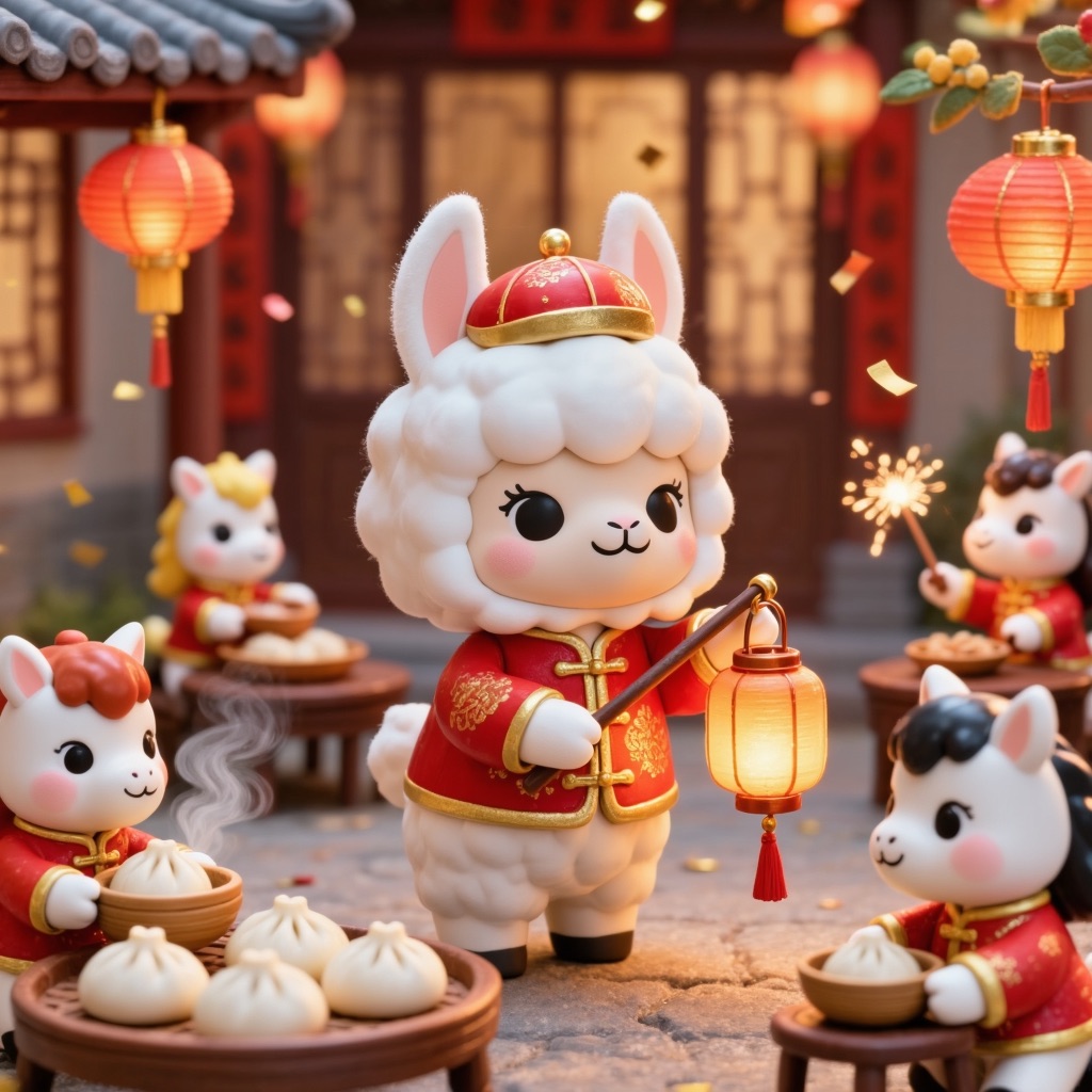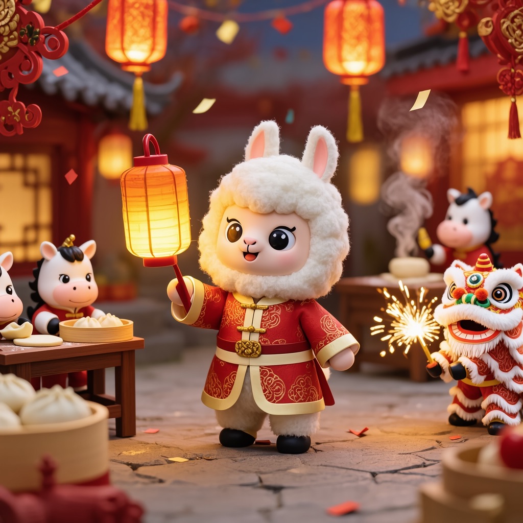 PROMPT: Cute Popmart-style 3D miniature [festival] courtyard, natural candid moment, no posing, no one looking at camera. An adorable anthropomorphic [SUBJECT1] in red traditional clothing stands at the center, holding a glowing lantern and gently greeting. Around it, super cute Popmart-style [SUBJECT2] are naturally busy with their own activities: making dumplings, serving steaming baozi, playing sparklers, performing lion dance, hanging lanterns not looking at the llama.Warm lantern light, soft confetti and smoke, asymmetrical lively composition, shallow depth, tilt-shift, ultra-detailed soft clay toy texture, vivid red and gold, cinematic Octane render, joyful natural atmosphere
