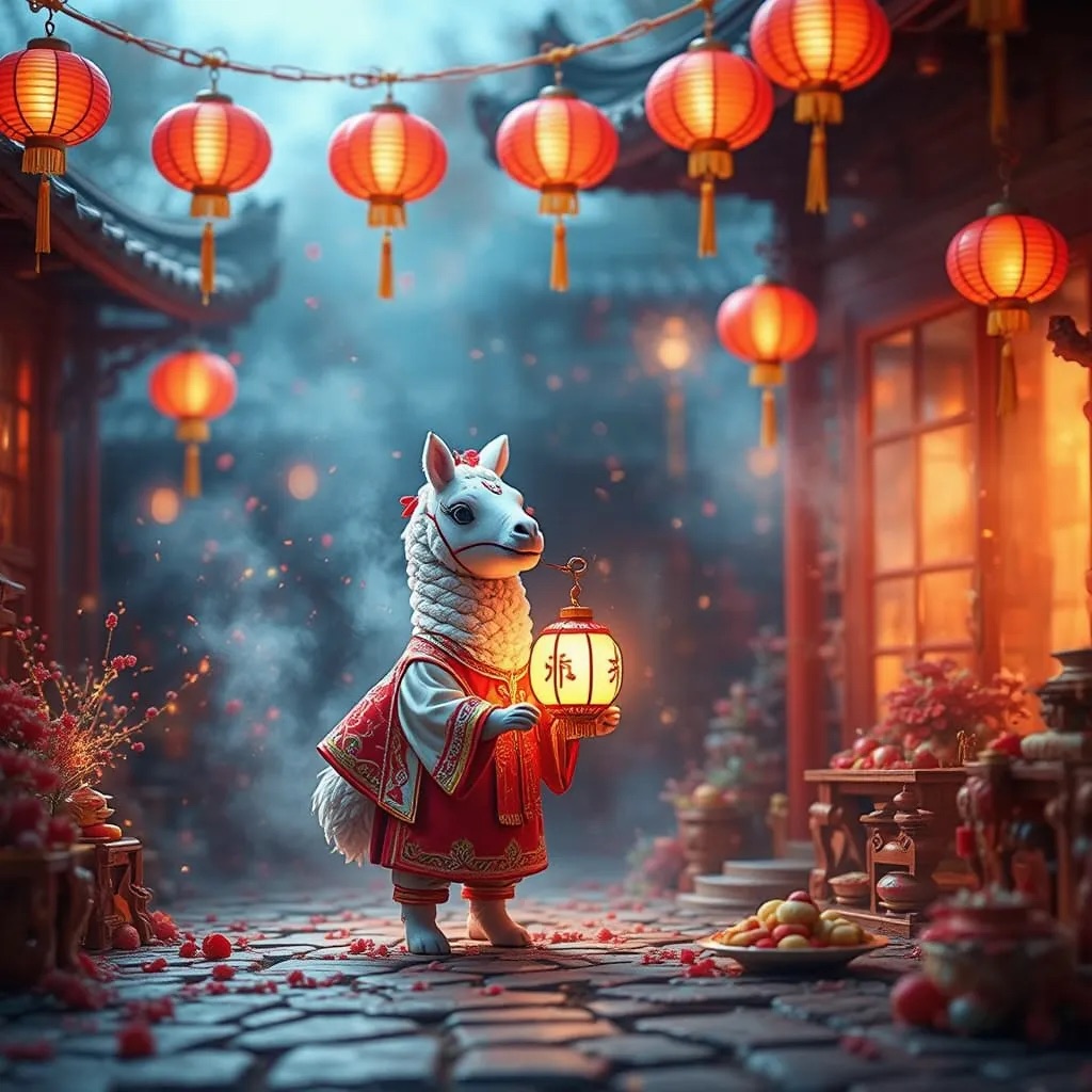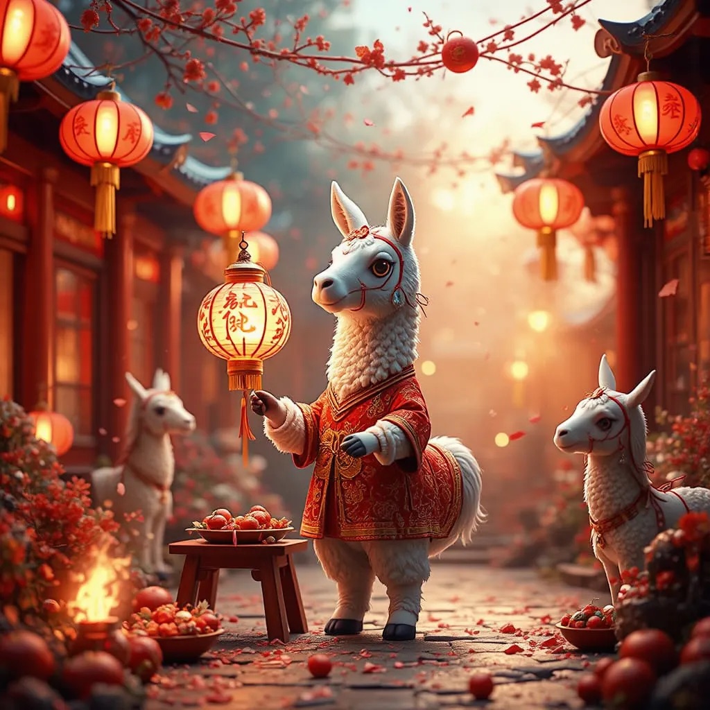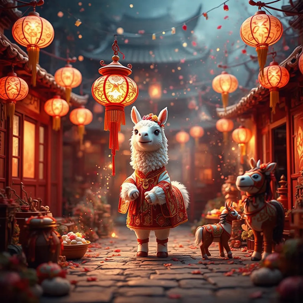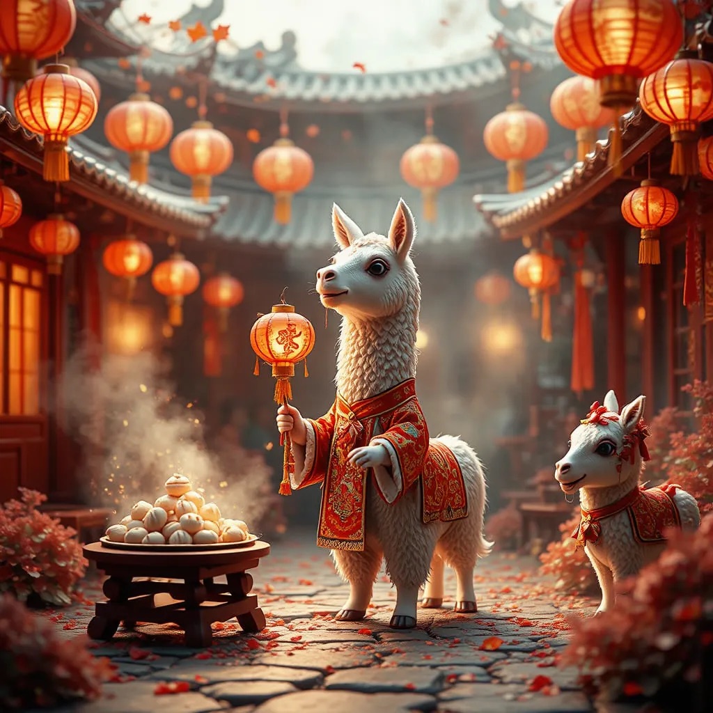 PROMPT: Cute Popmart-style 3D miniature [festival] courtyard, natural candid moment, no posing, no one looking at camera. An adorable anthropomorphic [SUBJECT1] in red traditional clothing stands at the center, holding a glowing lantern and gently greeting. Around it, super cute Popmart-style [SUBJECT2] are naturally busy with their own activities: making dumplings, serving steaming baozi, playing sparklers, performing lion dance, hanging lanterns not looking at the llama.Warm lantern light, soft confetti and smoke, asymmetrical lively composition, shallow depth, tilt-shift, ultra-detailed soft clay toy texture, vivid red and gold, cinematic Octane render, joyful natural atmosphere